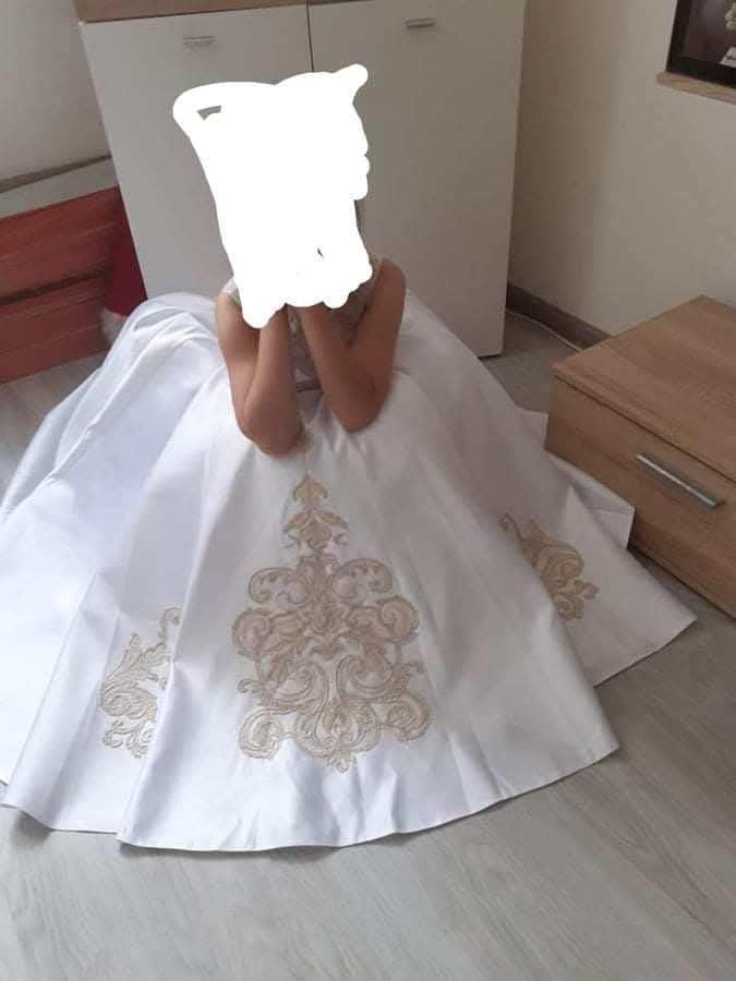Detské šaty pre družičku a iné príležitosti s kvetmi Vrchný materiál je robený z kvalitného bieleho saténu Pás je dekorovaný odstrániteľnou stuhou s kvetom. Spodná časť šiat sa skladá zo 4 ča...