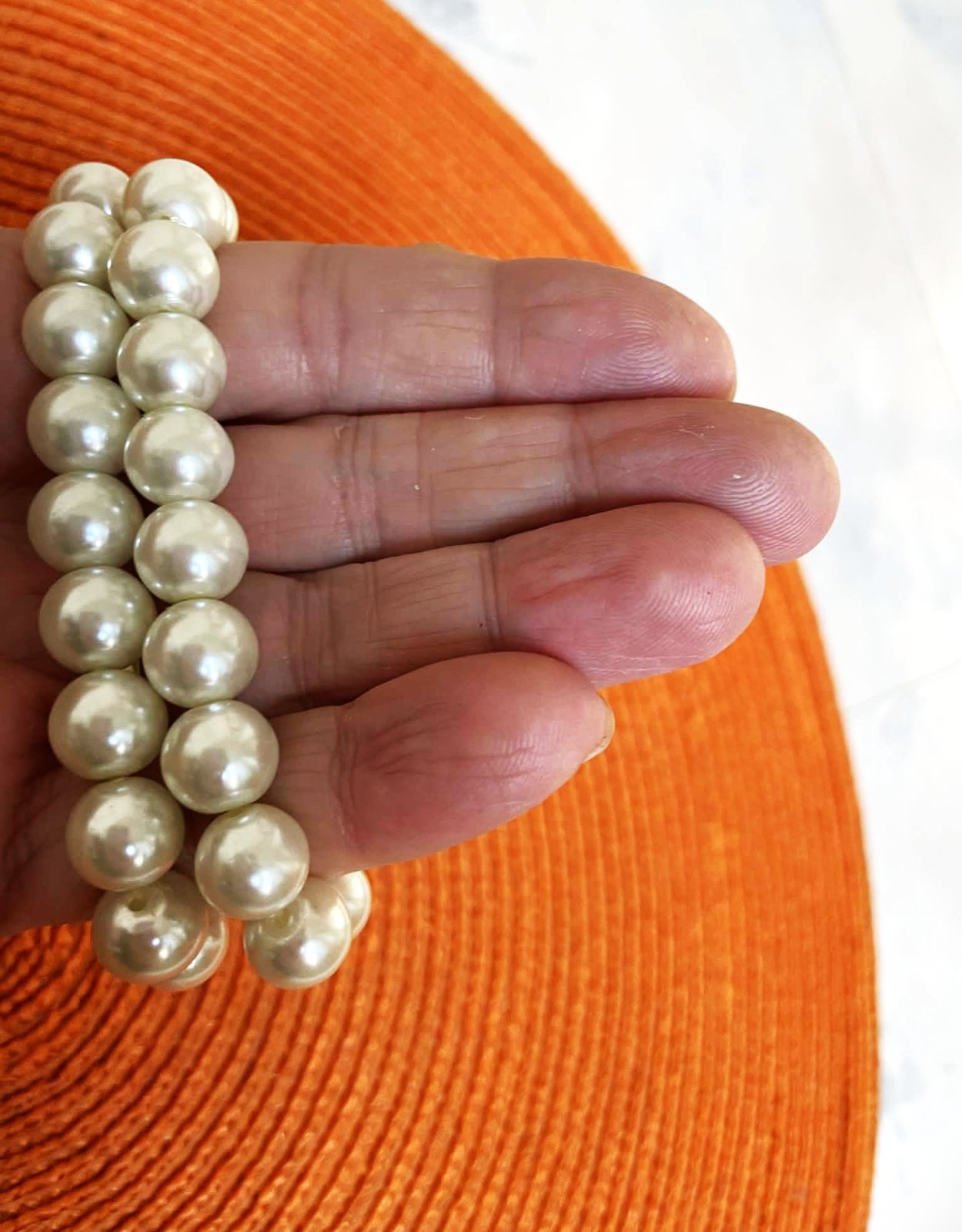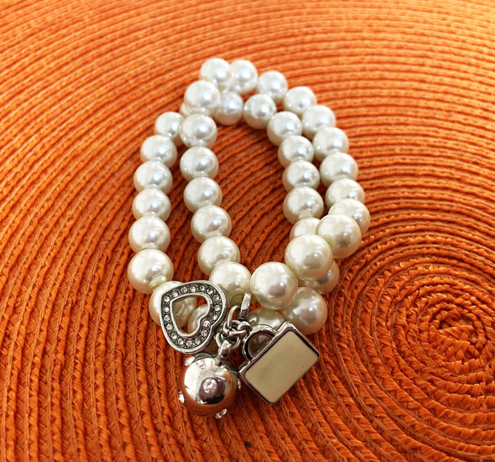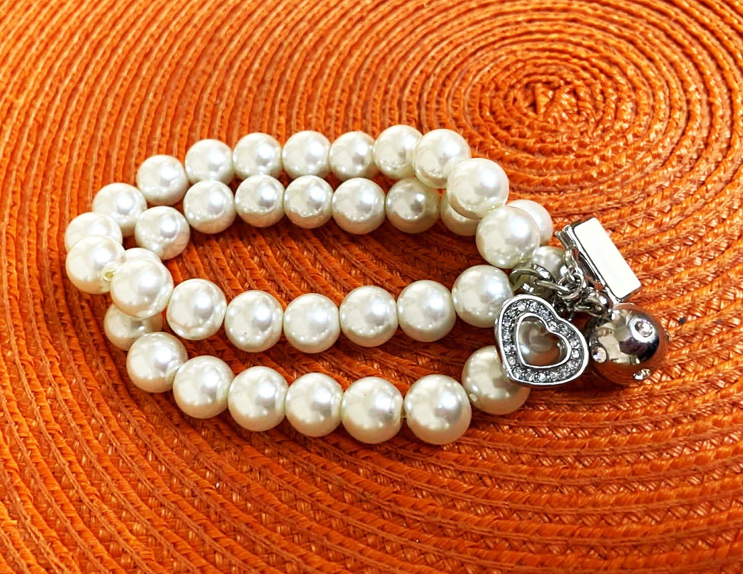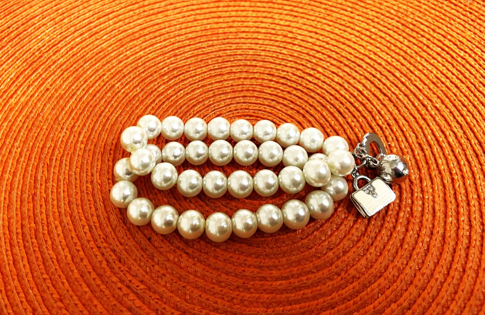nádherný dvojradový náramok z umelých perál,krásne perleťový,s 3 krásnymi luxusnými príveskami,mám k tomu aj originál jemný zaťahovací sáčok,na silikónové gumičky - prispôsobí sa obvodu,top stav