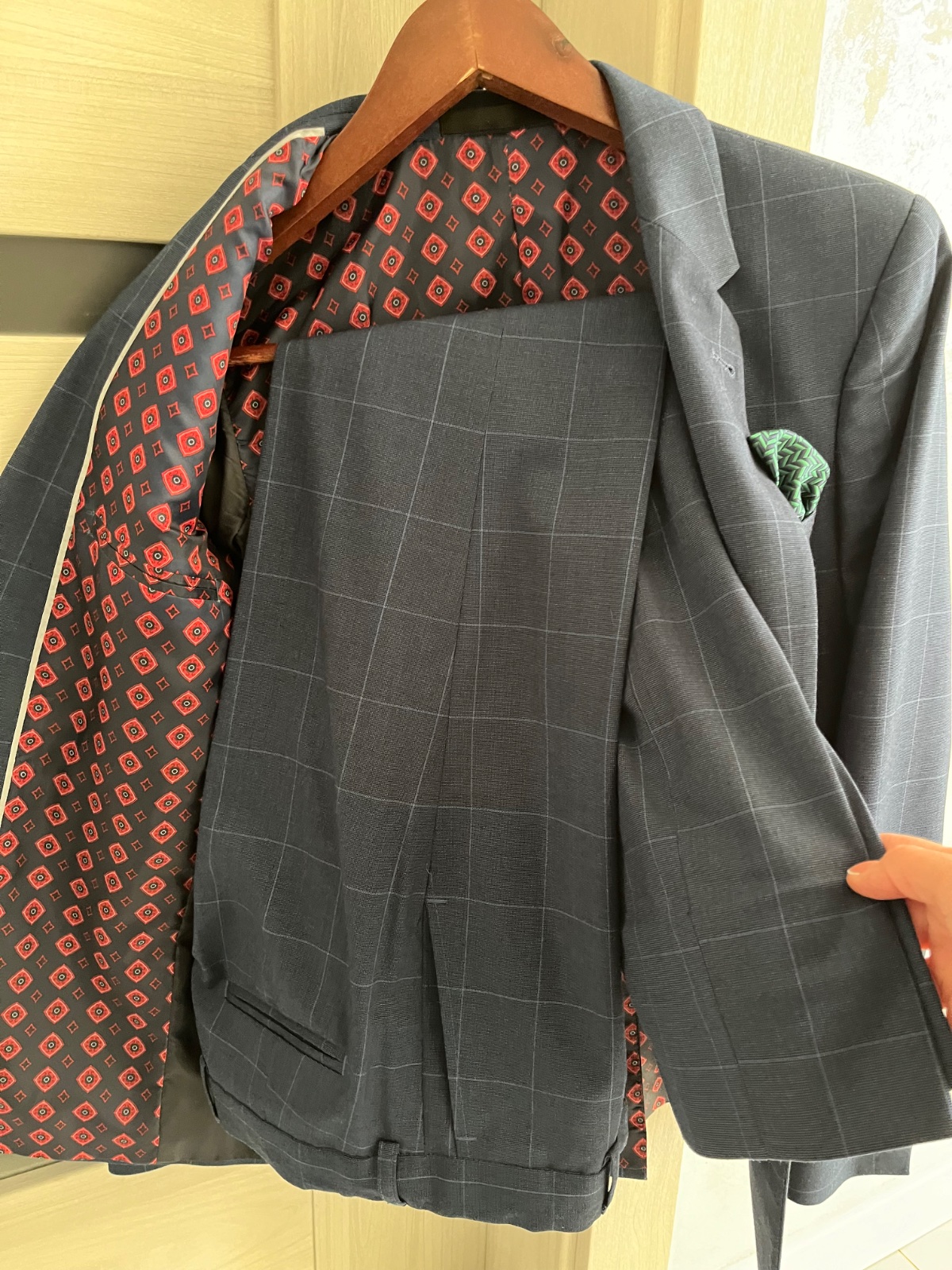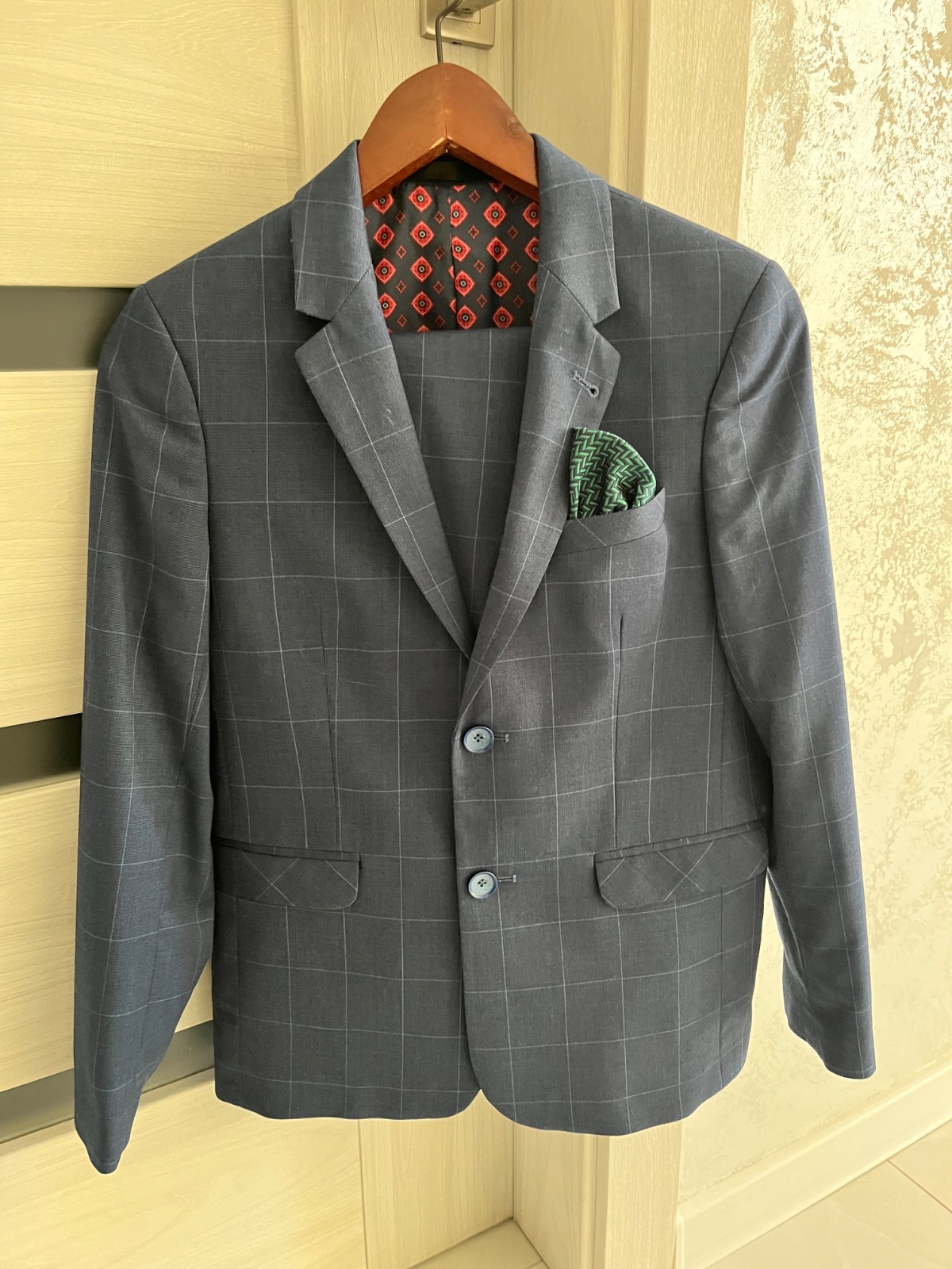 Nohavice a spoločenská vesta k tomu je modrá kosela s krátkym rukávom. Oblek nebol obleceny ani raz.