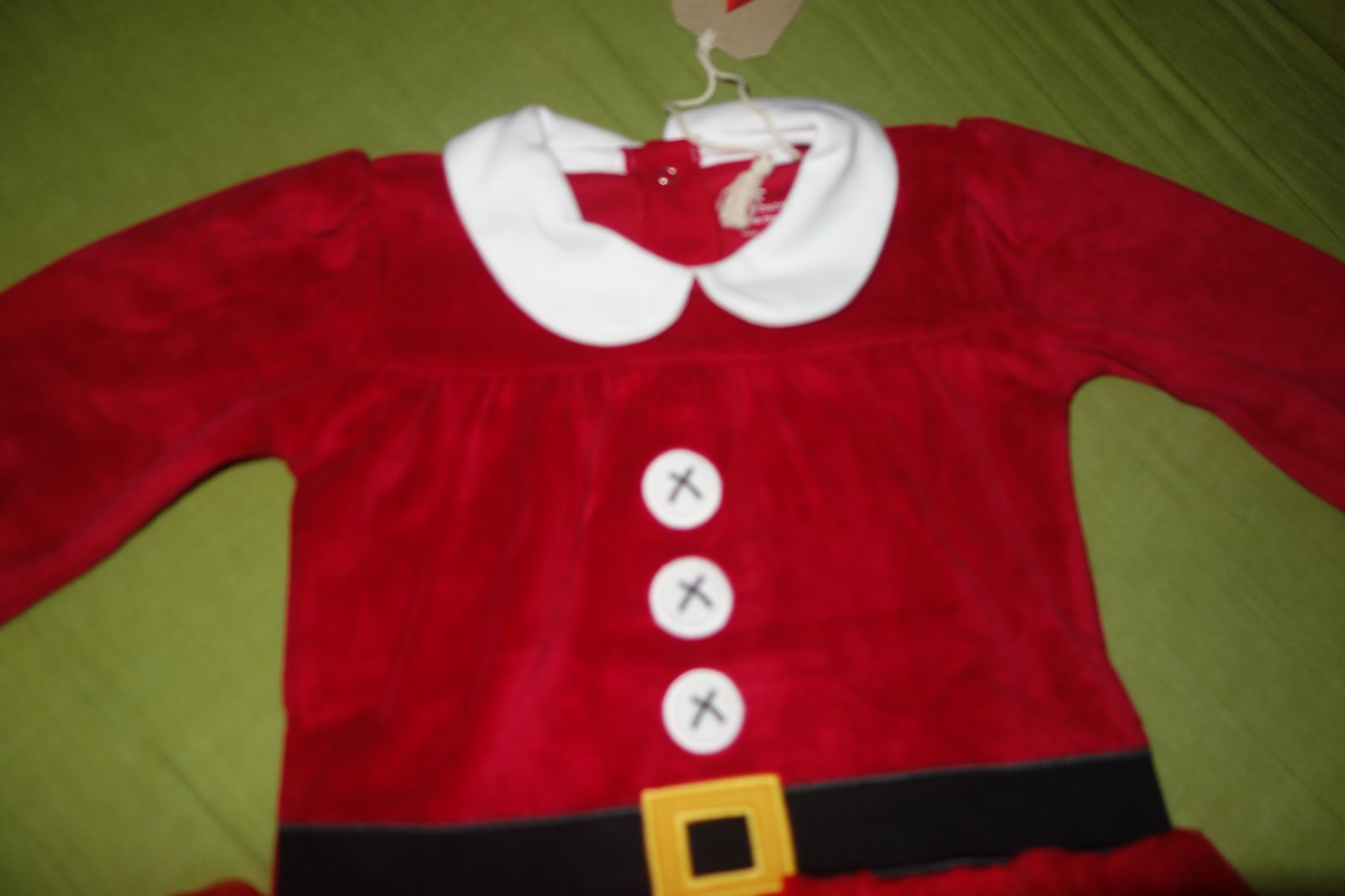 Krasny vianocny overalcek- novy, s visackami. Ma tylovu suknicku. Je velurovy. Medzi nozkami sa rozpina na cvocky.