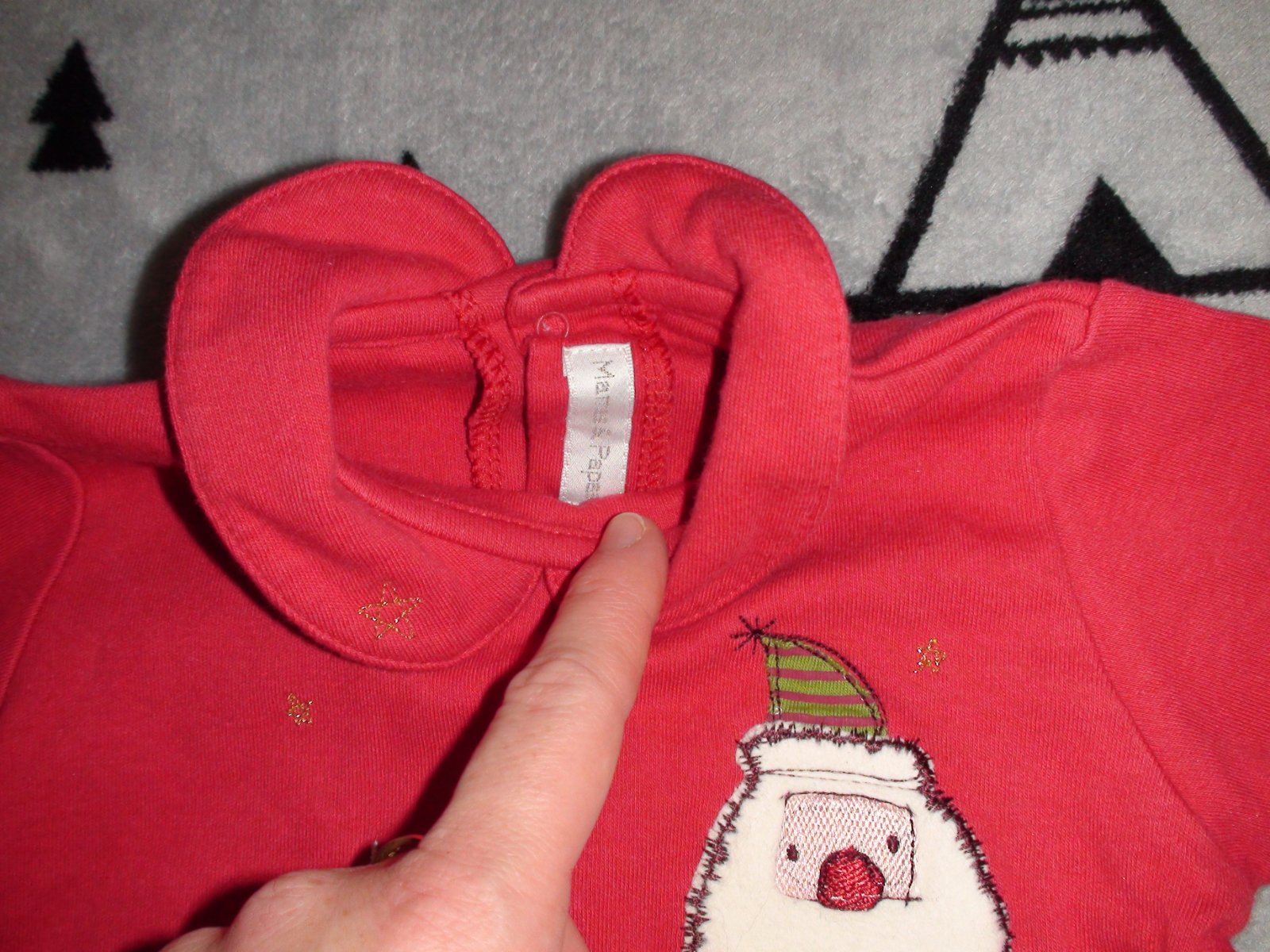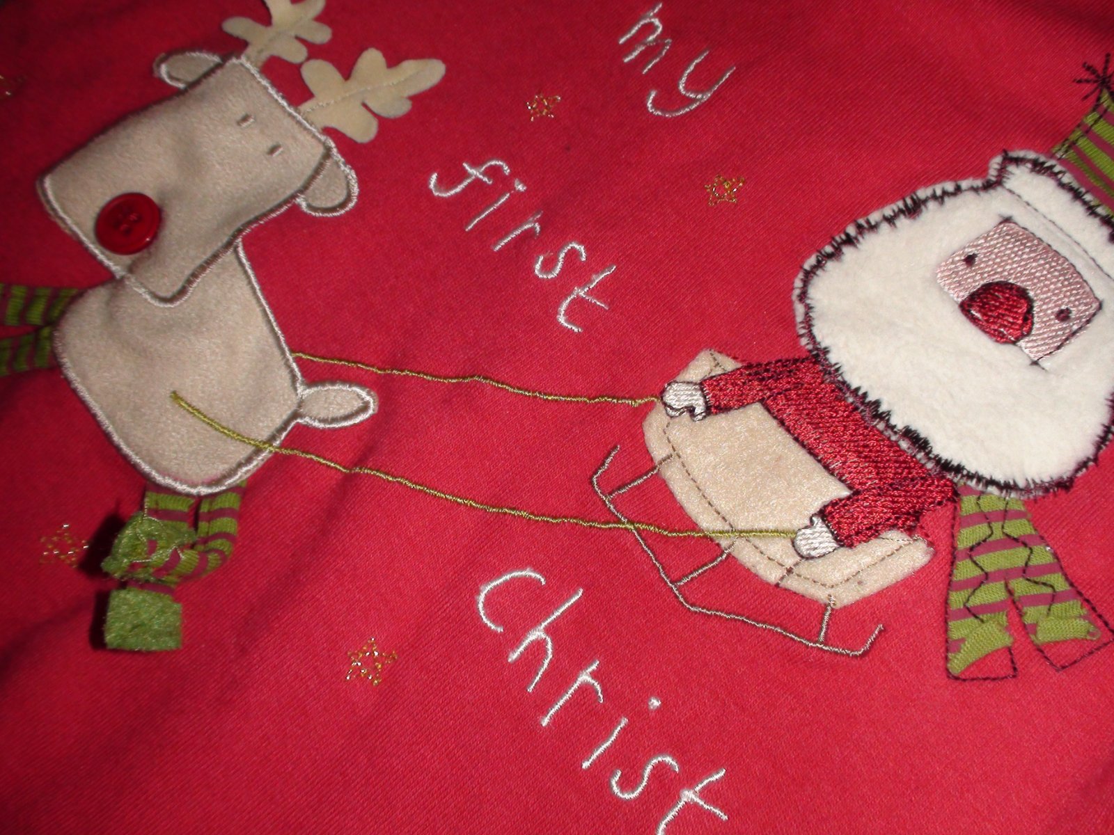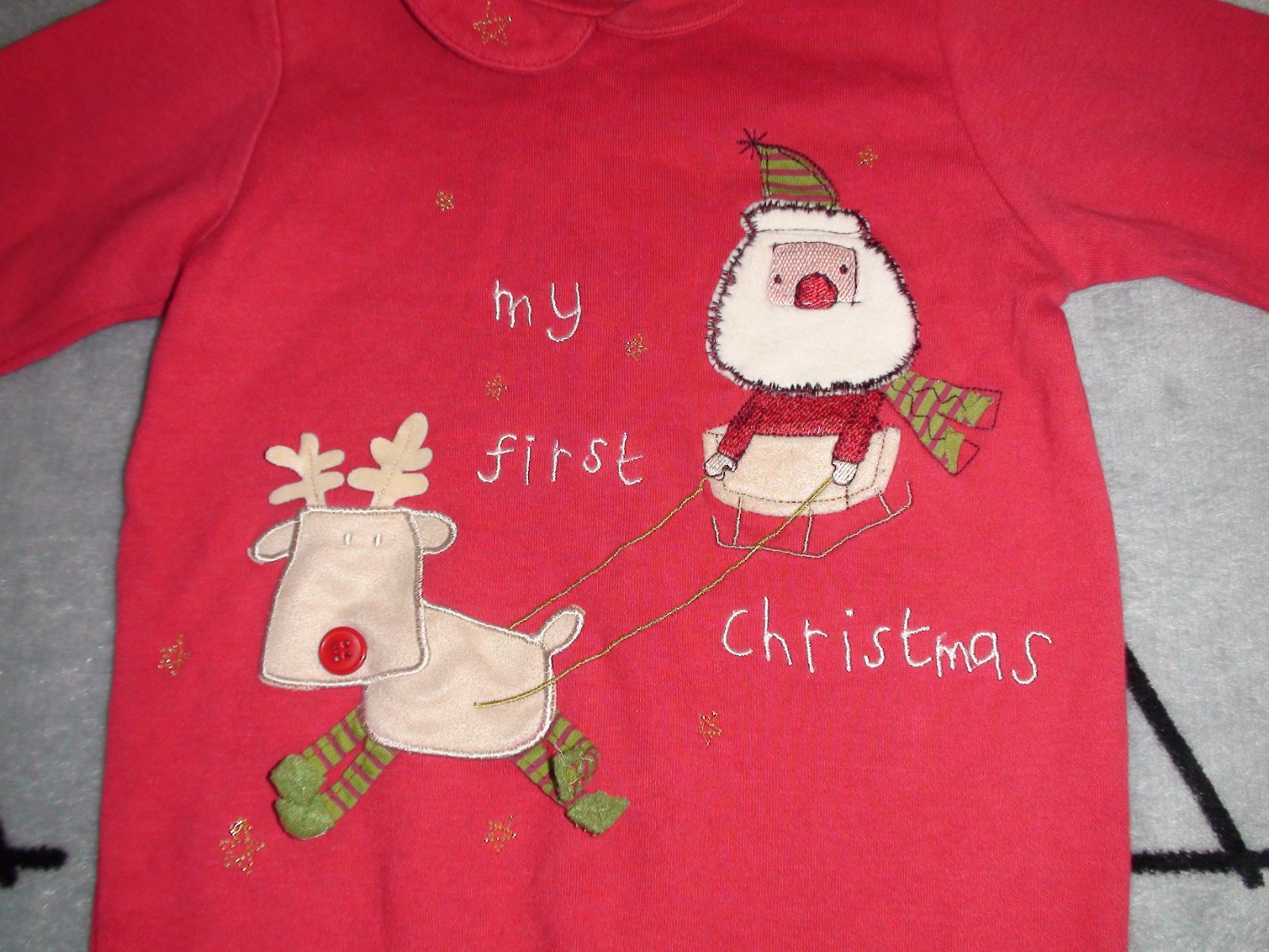 Krásny teplejší bavlnený vianočný overal Prvé vianoce, so santom a sobíkom. Pekne prepracovaný, vzadu zapínanie na cvoky. Rozkošný.