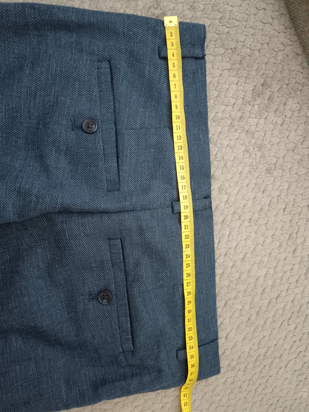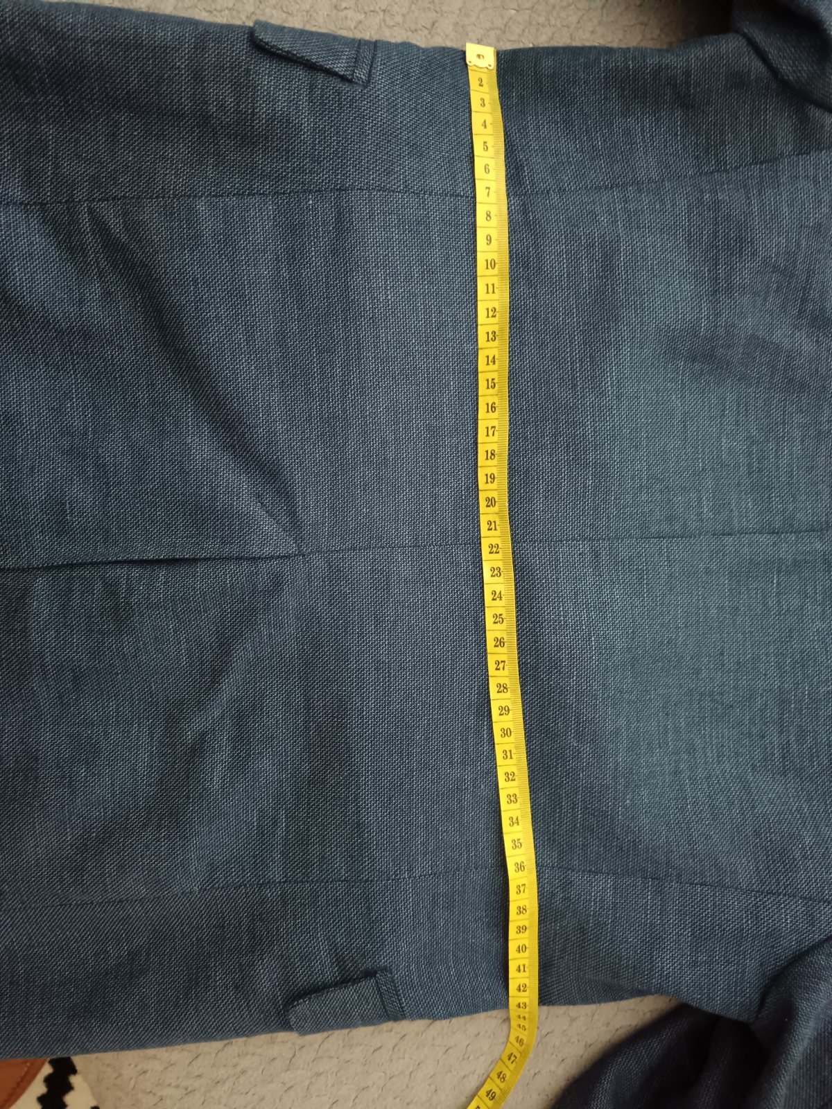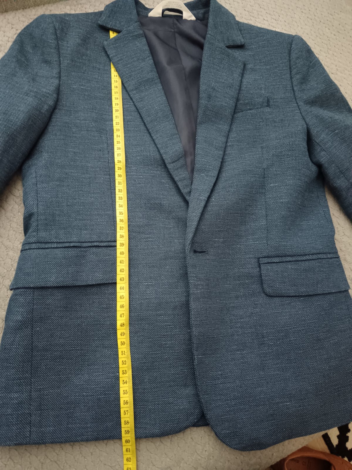 Ani raz neobleceny. Oblek je hrubší, povrch semišový. Nohavice: dĺžka 87cm, pás 2x 30cm v kľude, boky 2x42cm. Vesta: dĺžka 50cm, šírka 43cm