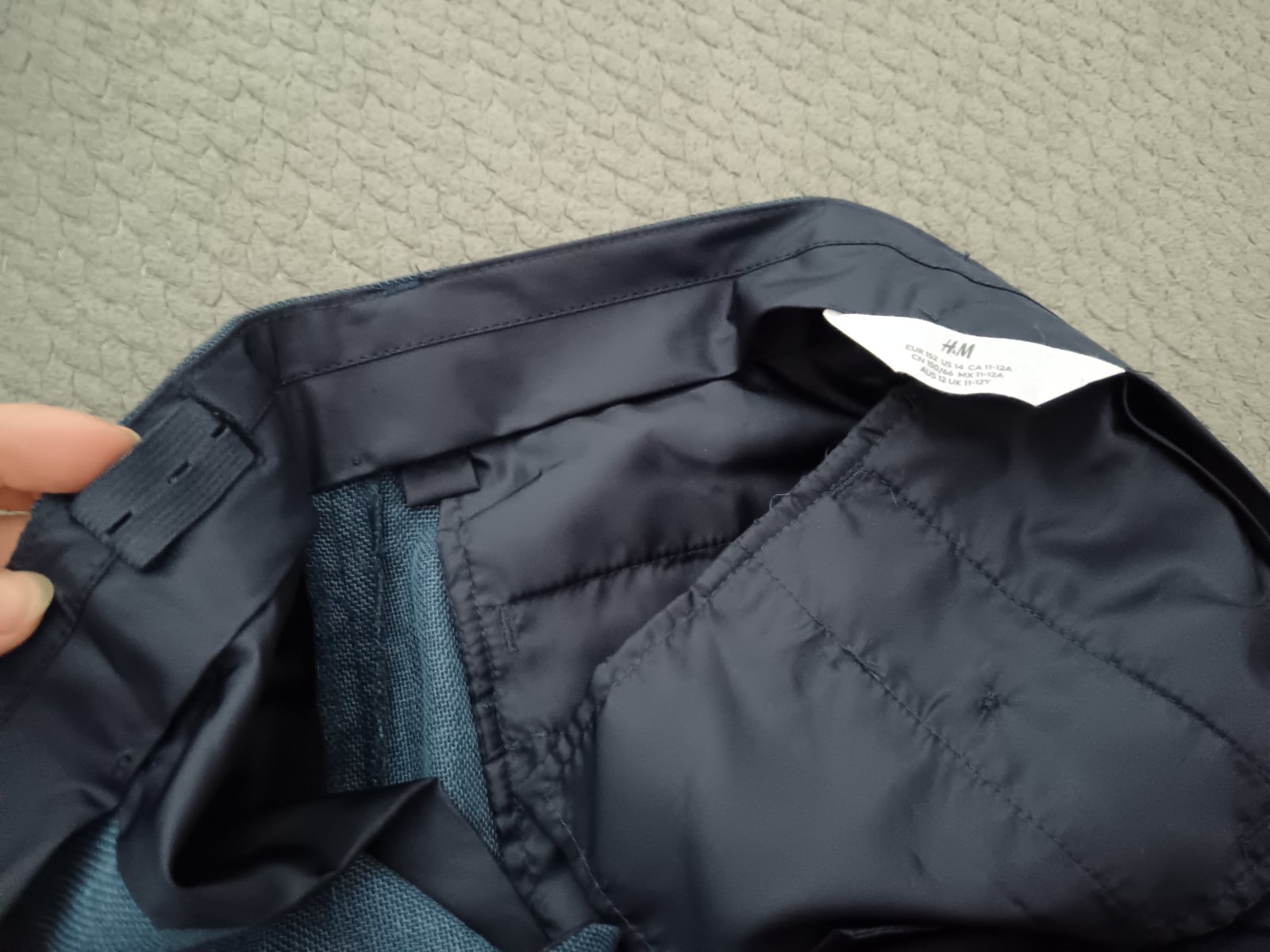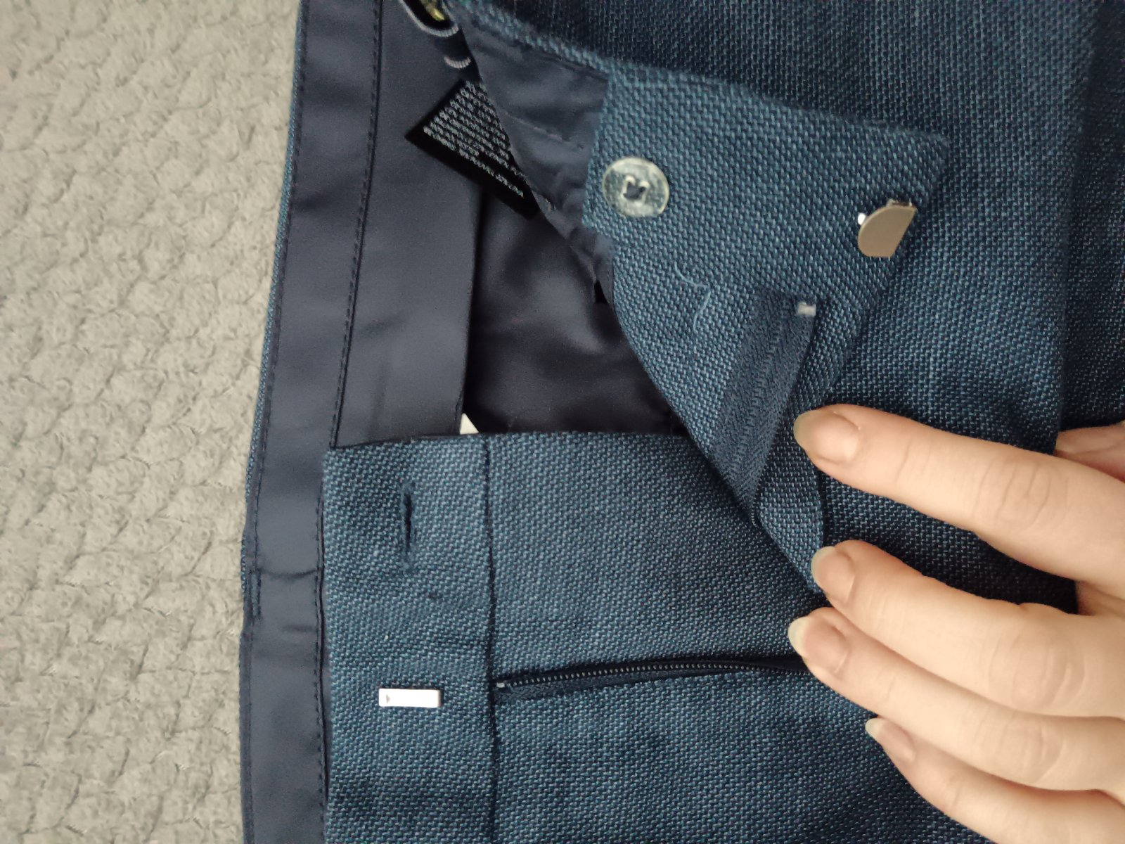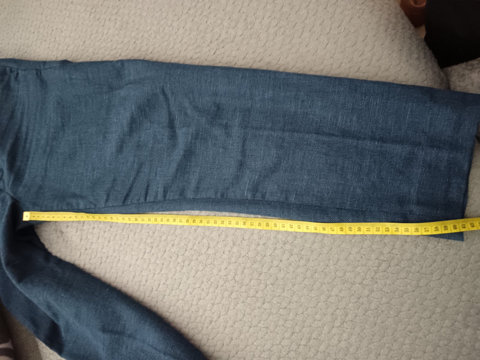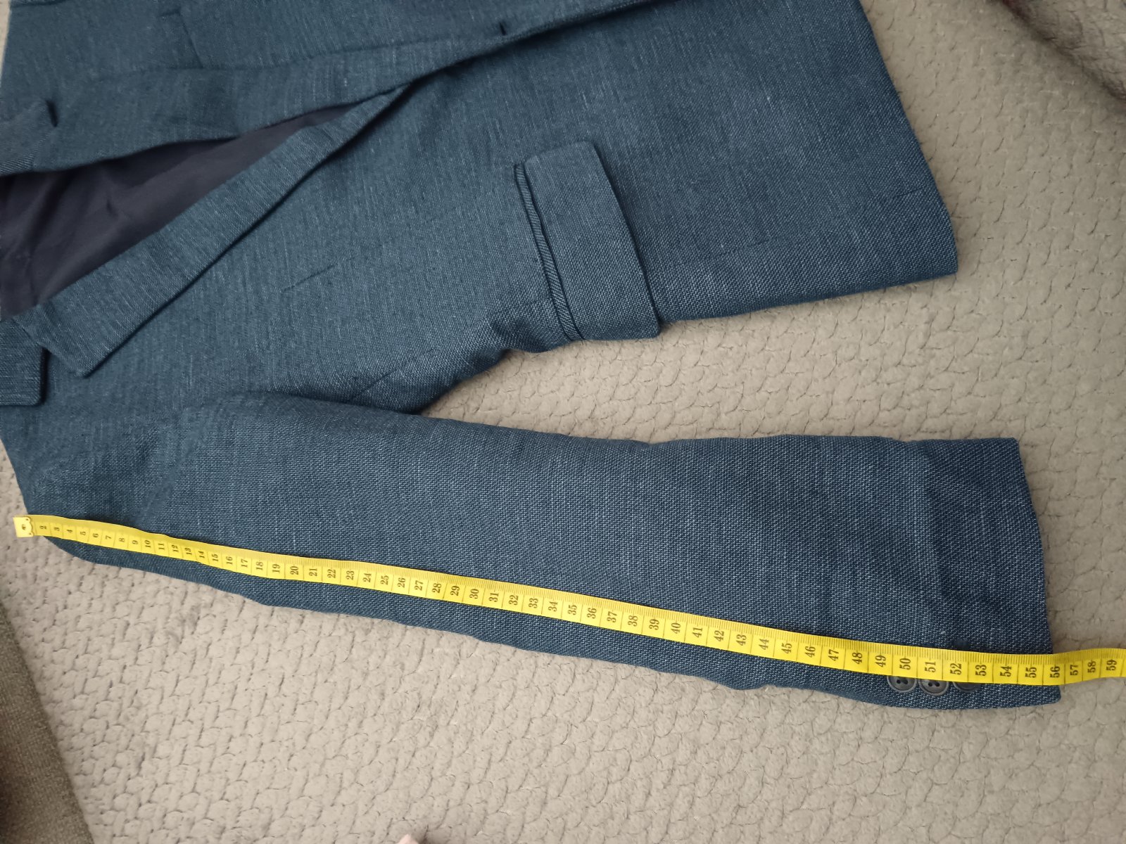 Ani raz neobleceny. Oblek je hrubší, povrch semišový. Nohavice: dĺžka 87cm, pás 2x 30cm v kľude, boky 2x42cm. Vesta: dĺžka 50cm, šírka 43cm