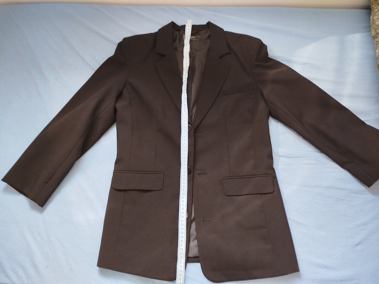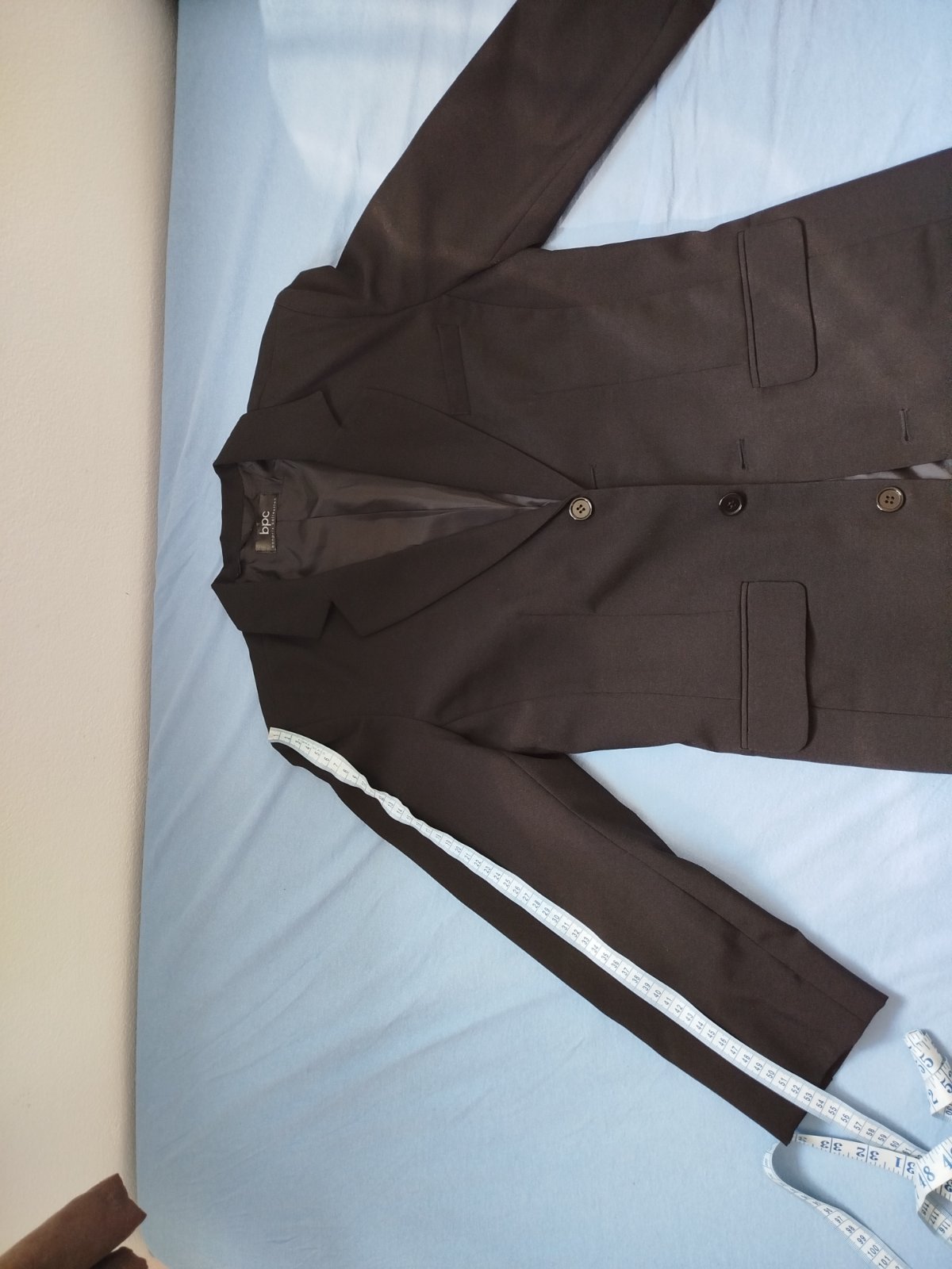 perfektný, moderný slimkový strih, značka NEXT, písaná veľkosť 15, 1x oblečený sako - dl. vzadu od goliera 70 cm, rameno 13 cm, dĺ . rukáva od pleca 64 cm, nohavice majú v páse posúvateľnú gumičku,...