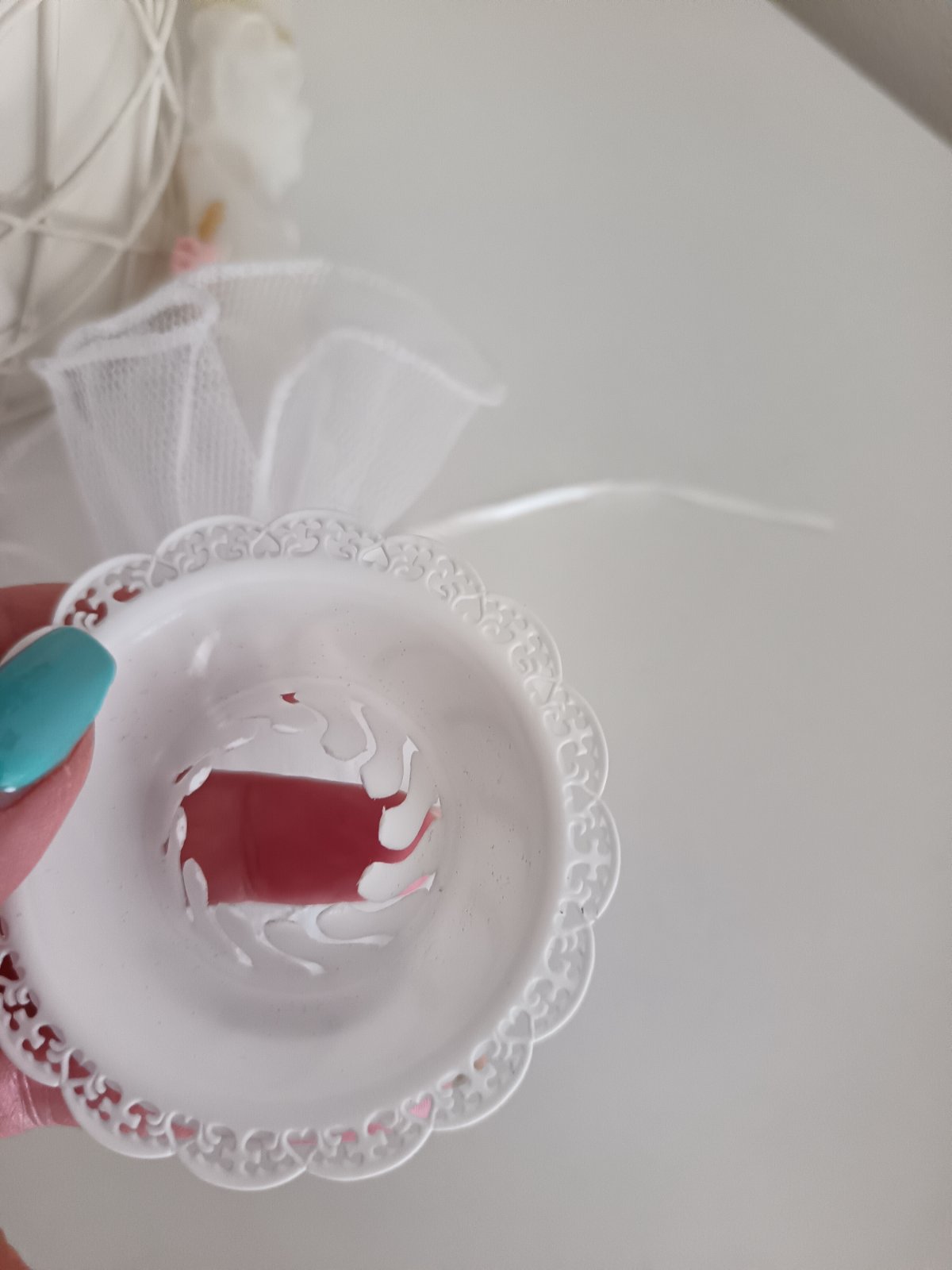 Predávam dokopy: tylovú ozdobu na sviečku + ochranná krytka na sviečku na stejajúci vosk.