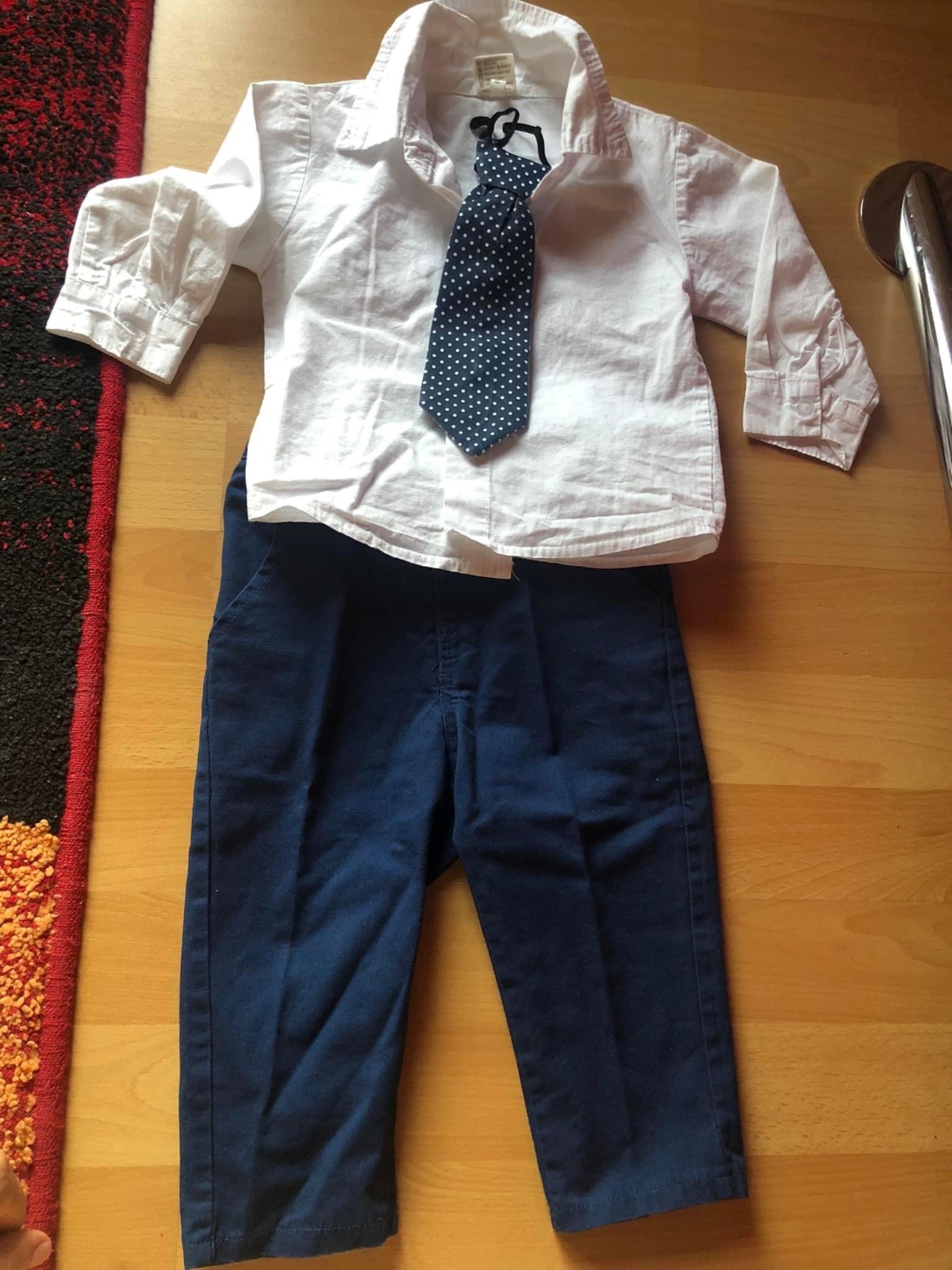 Predam detsky oblek (biela kosela dlhy rukav, kravata, modra vesta a dlhe nohavice). Kupene ako set.