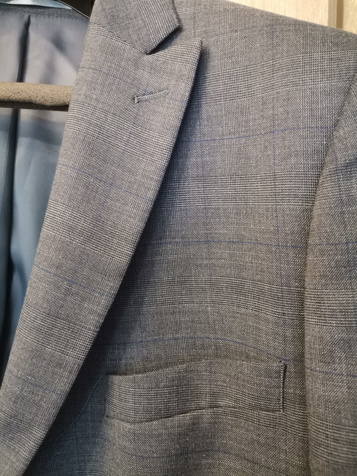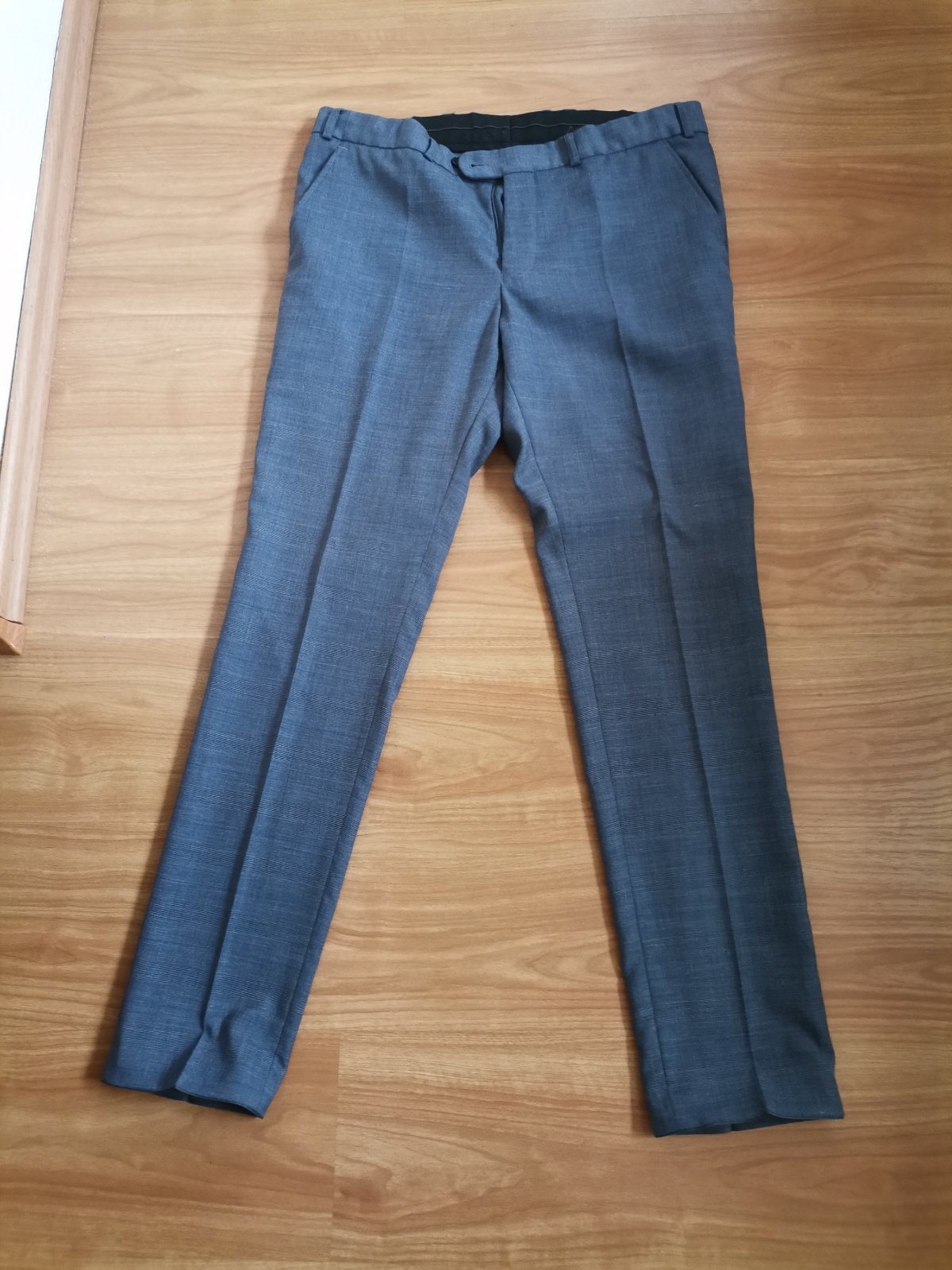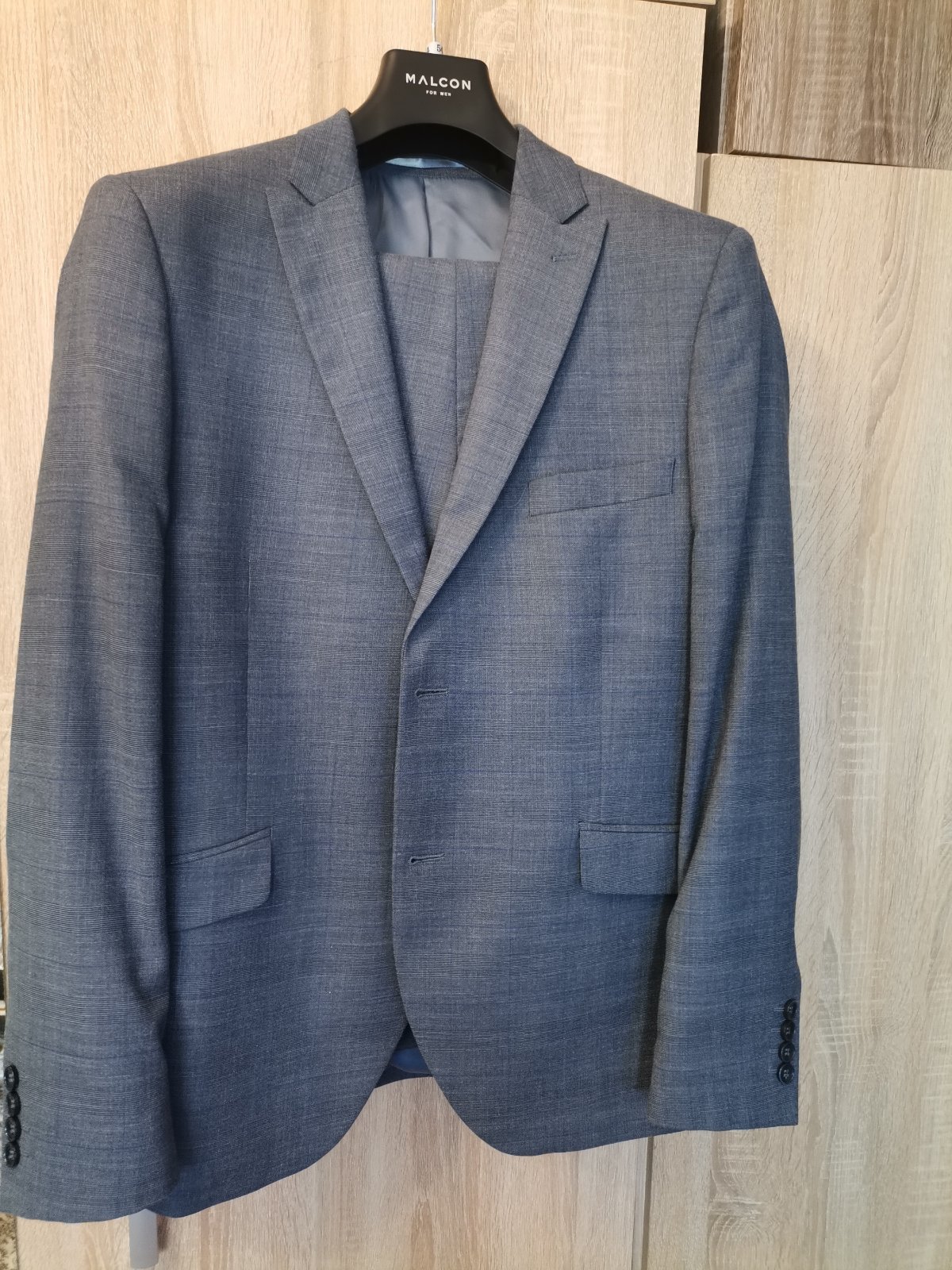 Kvalitný pánsky / chlapčenský oblek svetlosivej farby s károvaným vzorom - v odtieňoch sivej farby s modrým pásikom, bez poškodení. Bol kupovaný v OK móde. Syn ho mal párkrát oblečený, ale už z neho vyrástol.