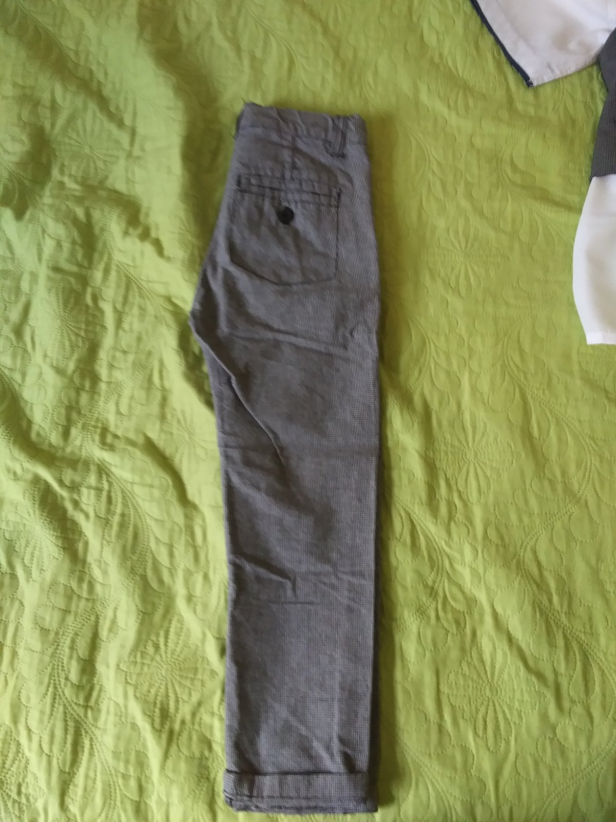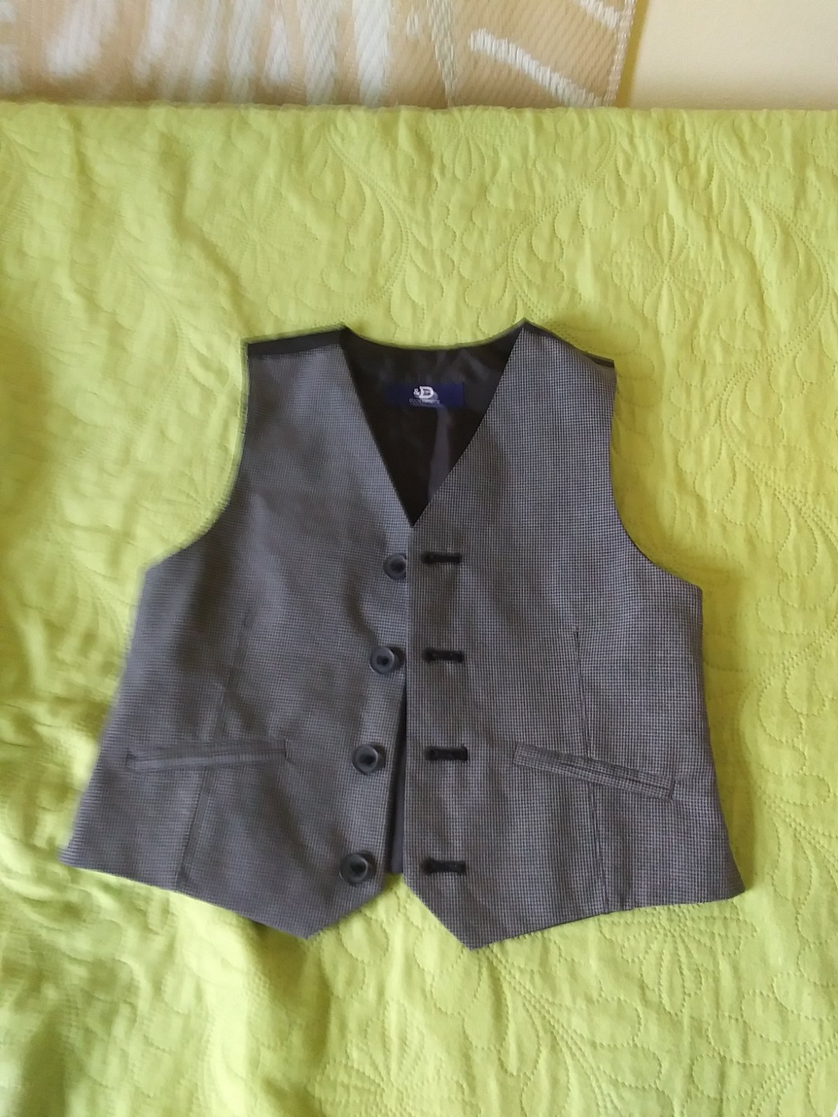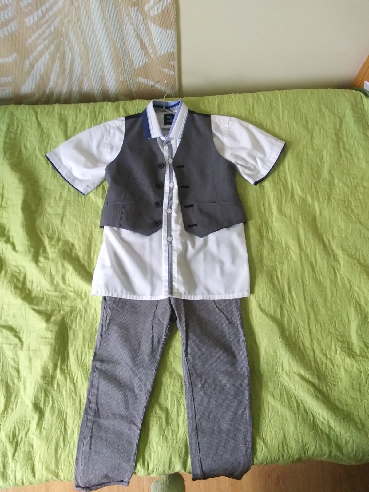 Predam krasny komplet vhodny na narodeniny svadbu krst a ine podujatie velkost 110 tak na 4roky velmi pekny detail na koseli ladeny s vestickou a nohavicami.