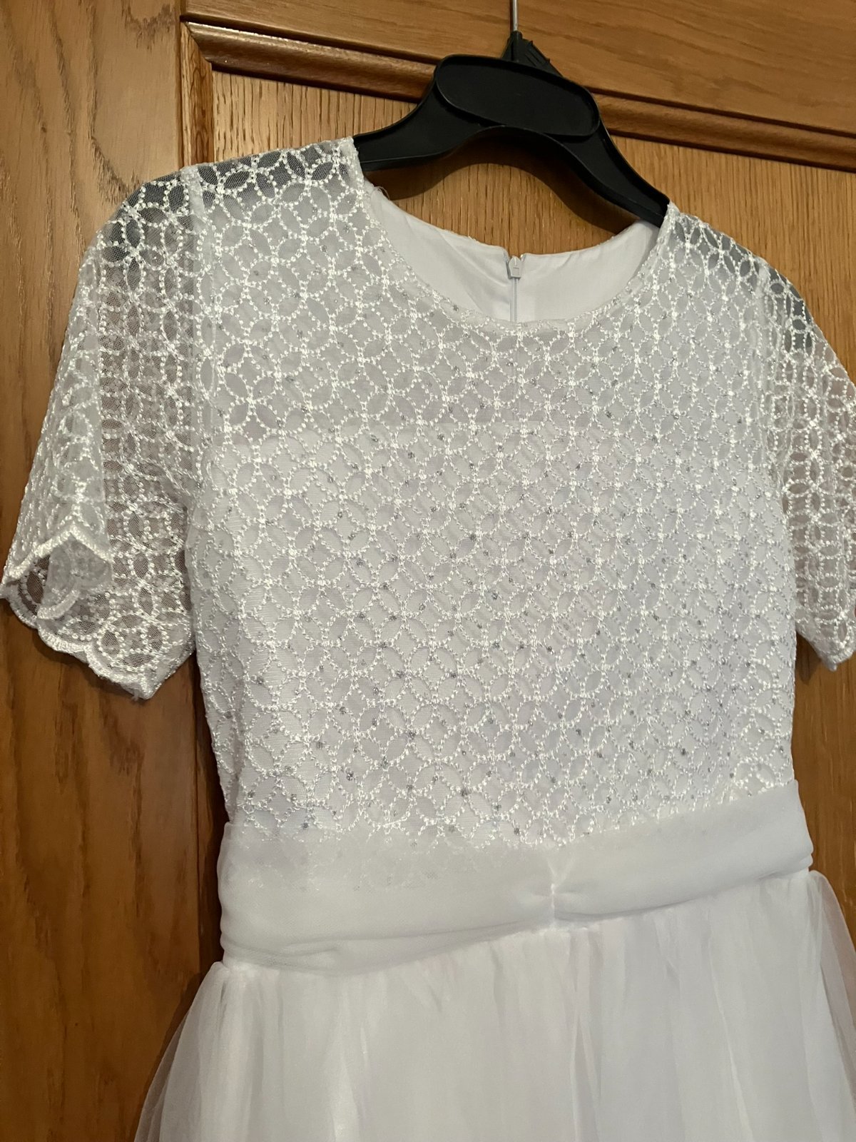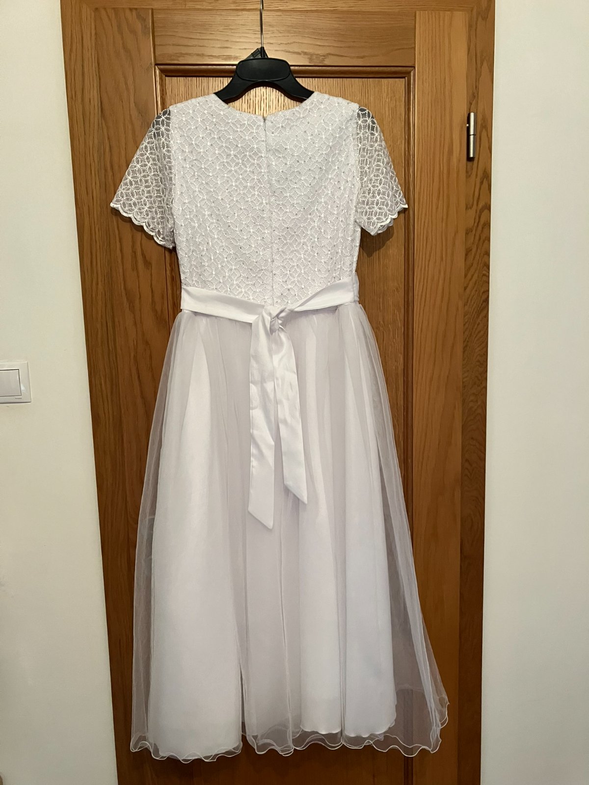 Predám šaty na 1. sv. prijímanie, 1x nosené, vyčistené, bez fľakov a poškodení. Je možné na bokoch zúžiť, prípadne zviazať stuhou, ak je užší driek. Vzadu zapínanie na zips. 4 spodničky, ľahké, vzdušné. Hore jemný vzor, vrchná vrstva sukne ľahký tyl.