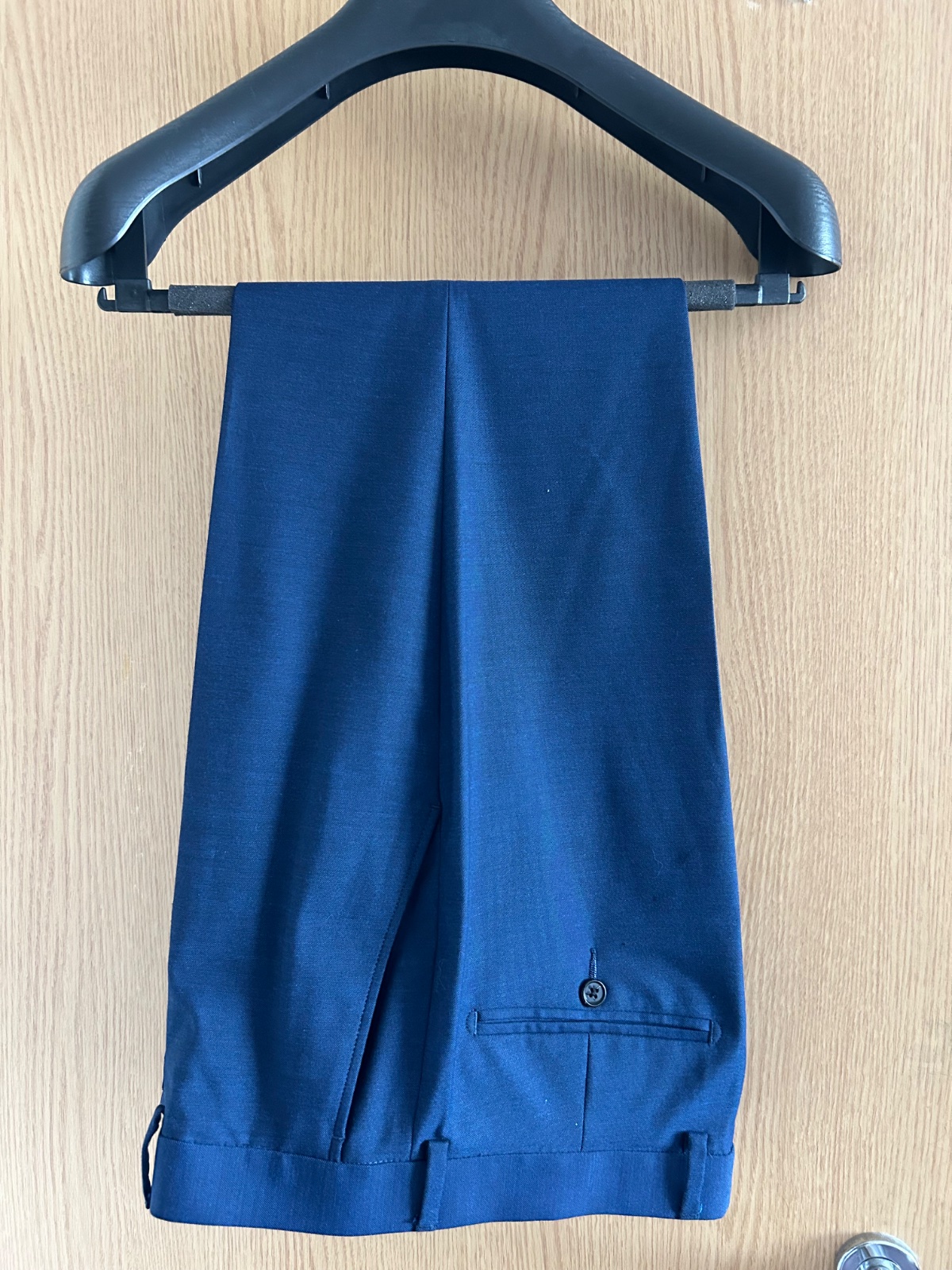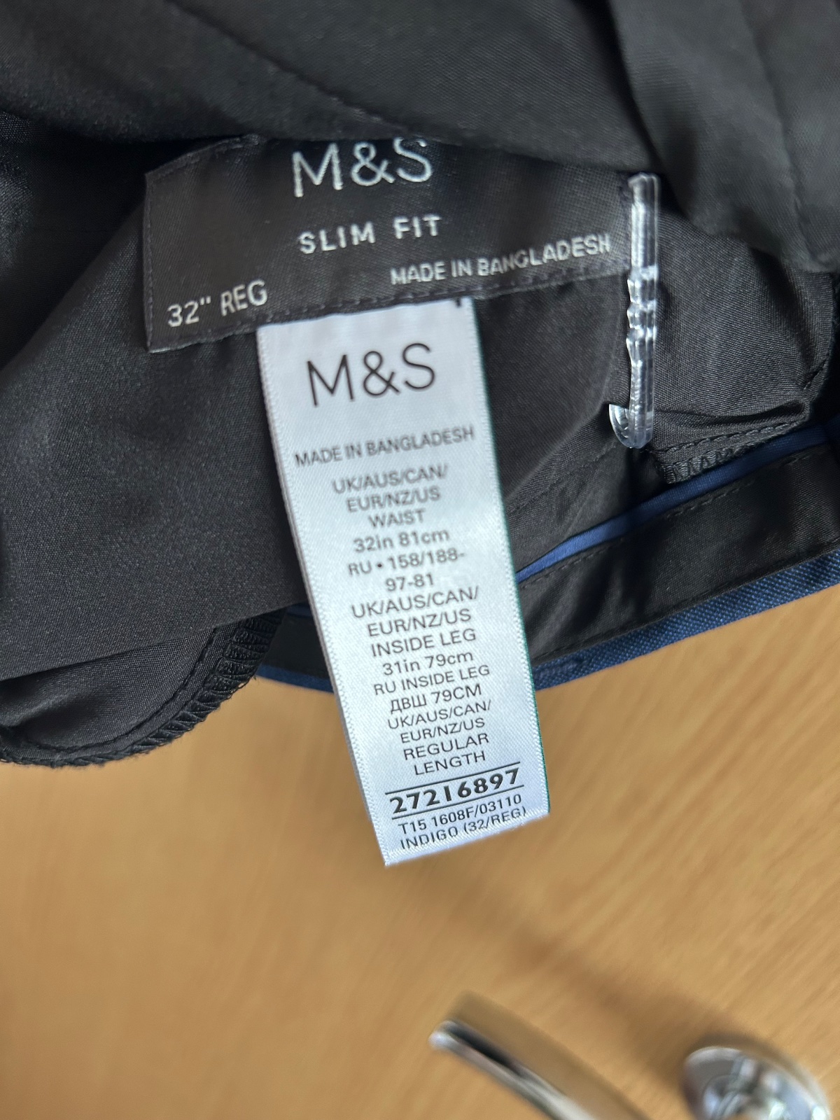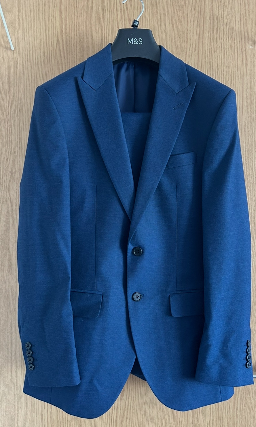 Elegantný tmavomodrý oblek pre štíhlu postavu na spoločenské podujatie.(M&S)