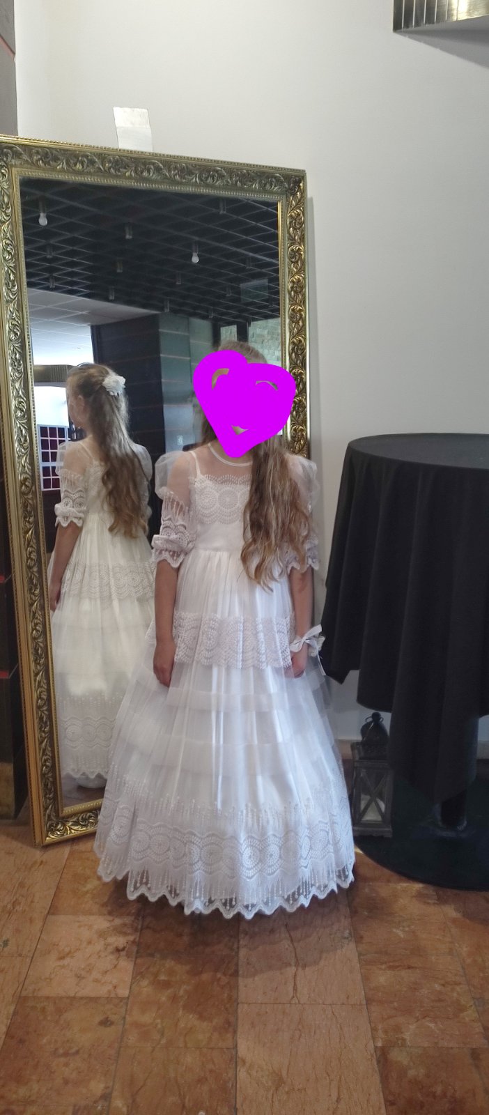 Krásne šaty na 1.sv.pr. pri záujme odmeriam.Obsahuju šaty,jednu klasicku rovnu spodnicku,jednu ktora trošku nanesie z tylu,tie mala dcéra na fotke a ešte jednu z kruhom pre ešte väčši objem,venček z kvetov na hlavu,a na ruku,su naozaj krásne.Daju sa troška upraviť ak je dievčatko tenšie.