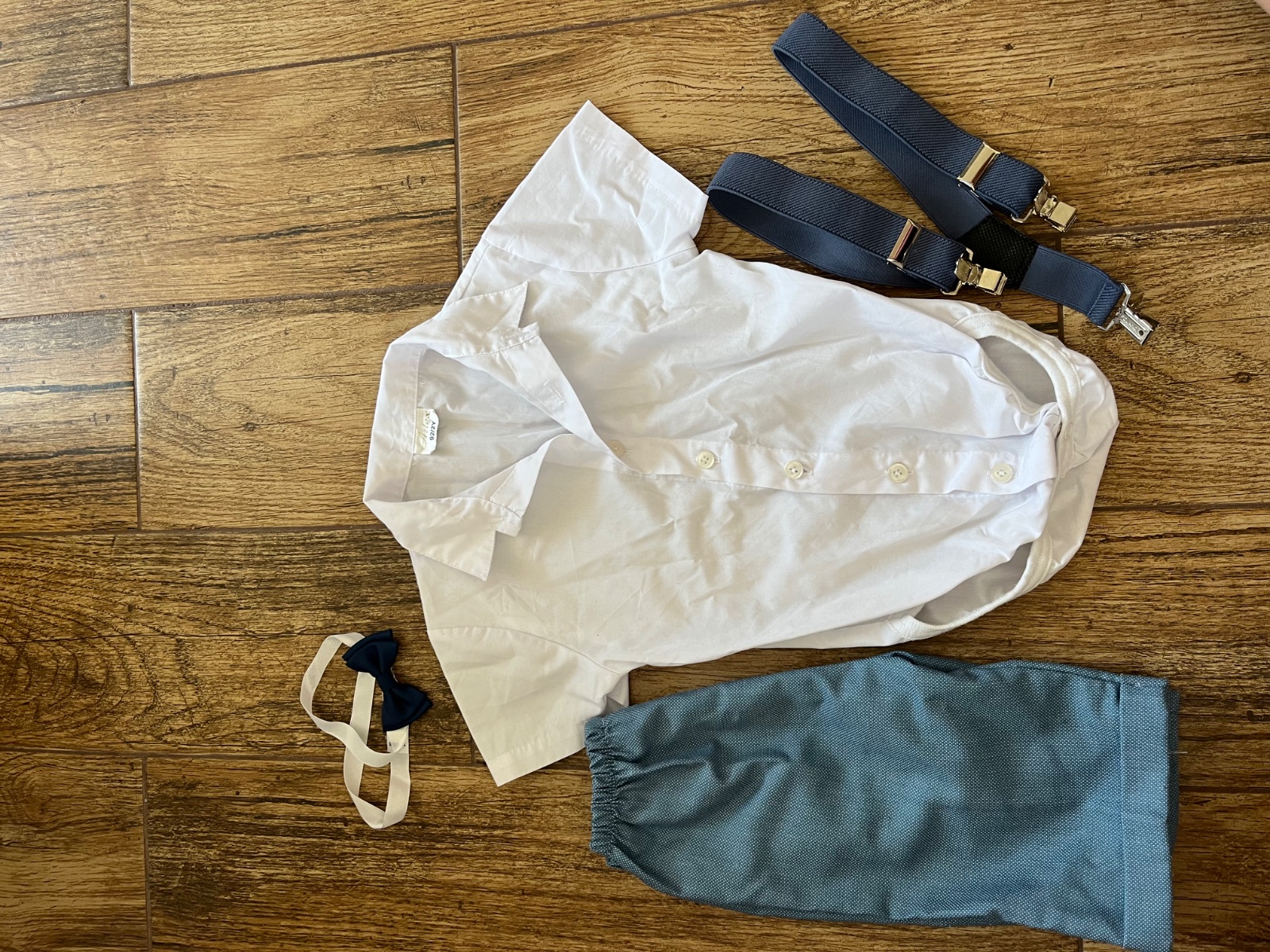Slávnostné oblečenie na rôzne príležitosti. 2x košeľa s krátkym rukávom, 1x nohavice, 1x krátke nohavice béžovej farby. Prosím, keďže mi nechodia upozornenia, píšte radšej SMS. Ďakujem.
