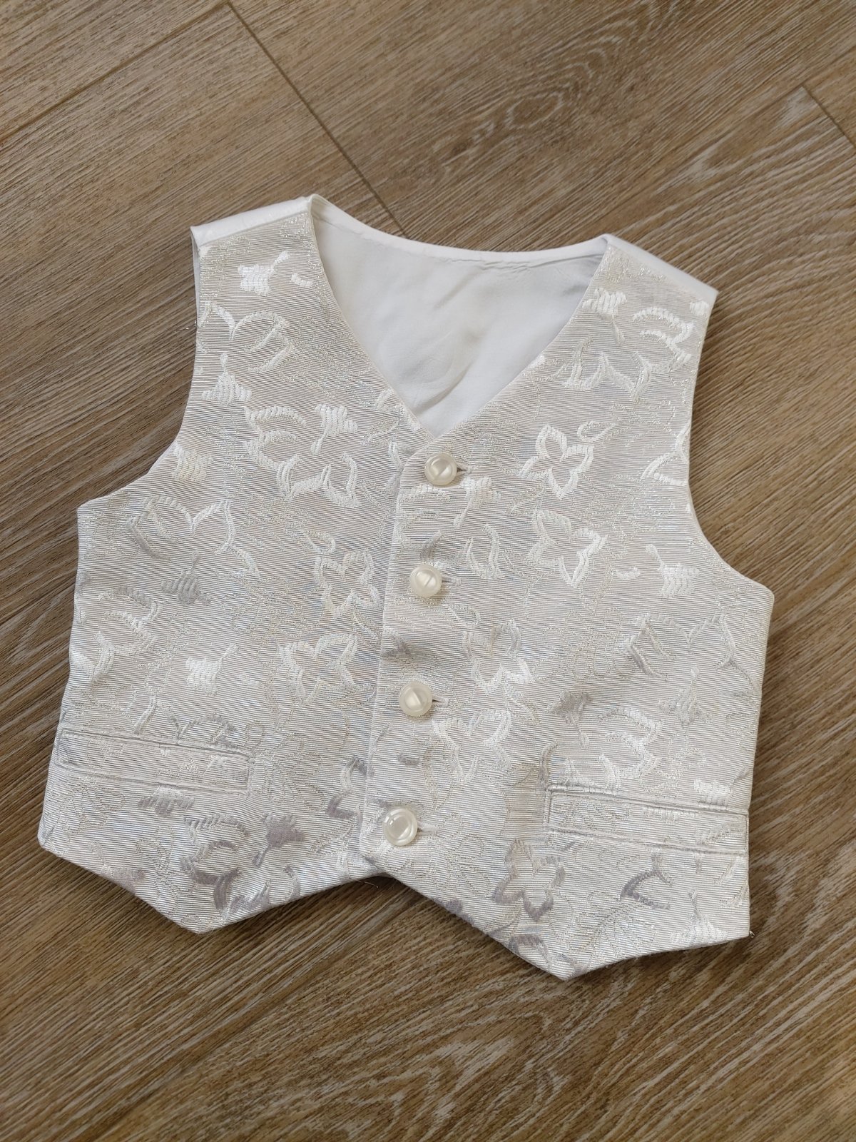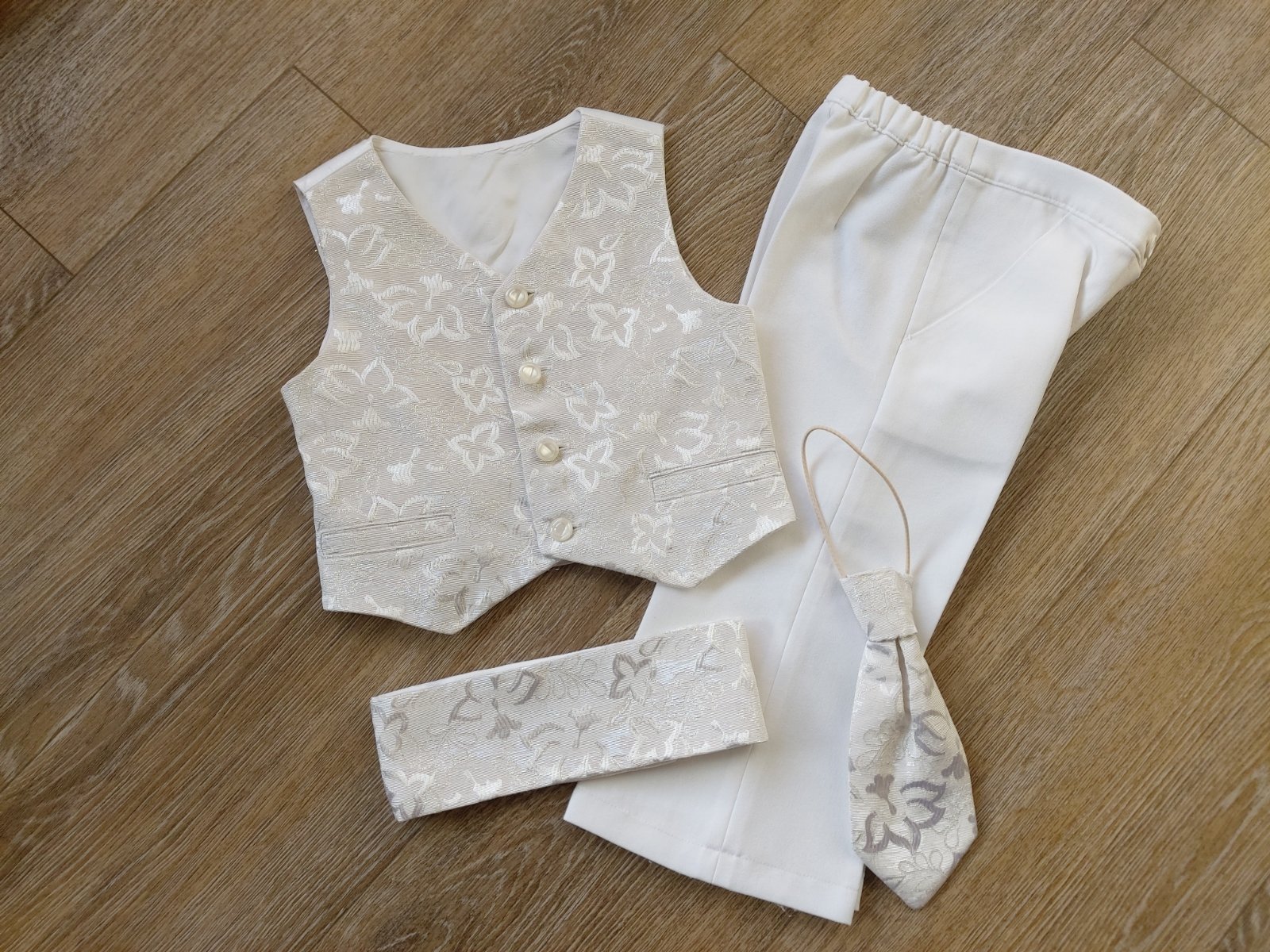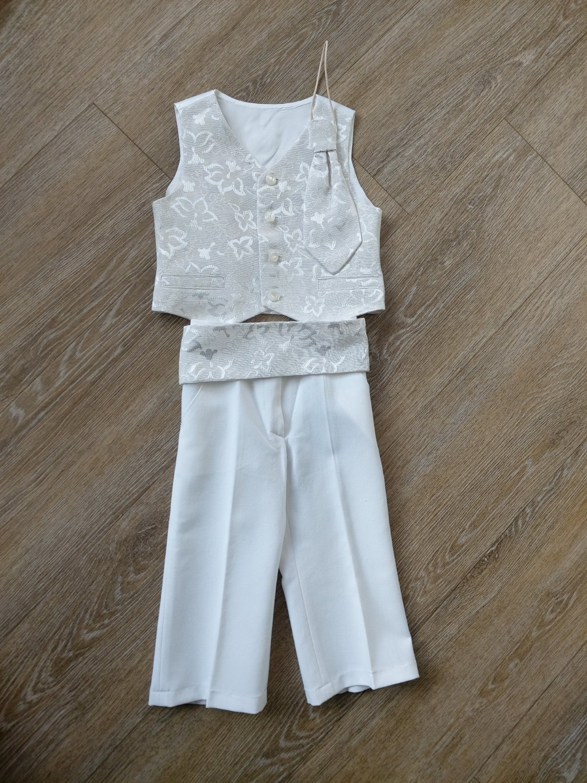 Ponúkam slávnostný komplet šitý na mieru. Vestička je podšitá s dvoma ozdobnými vreckami. Zadný diel je na stiahnutie. Nohavice sú v páse na gumku, čiže sa prispôsobia. Komplet je doplnený šerpou, ktorá je na suchý zips.