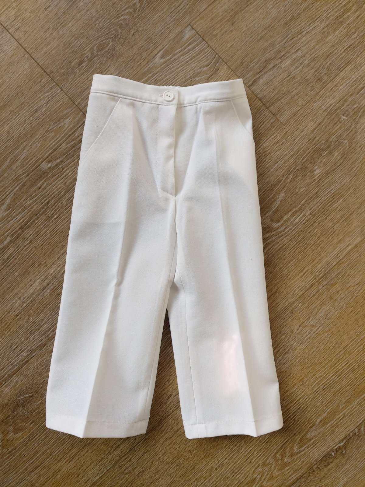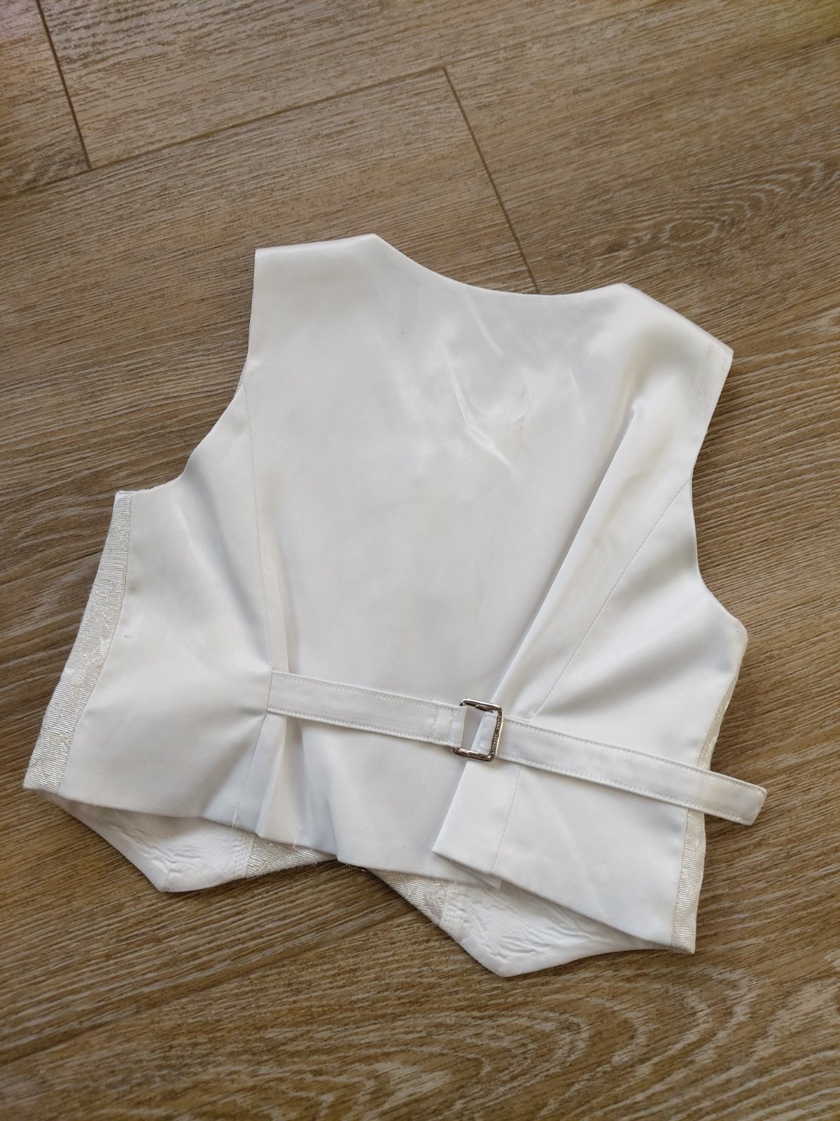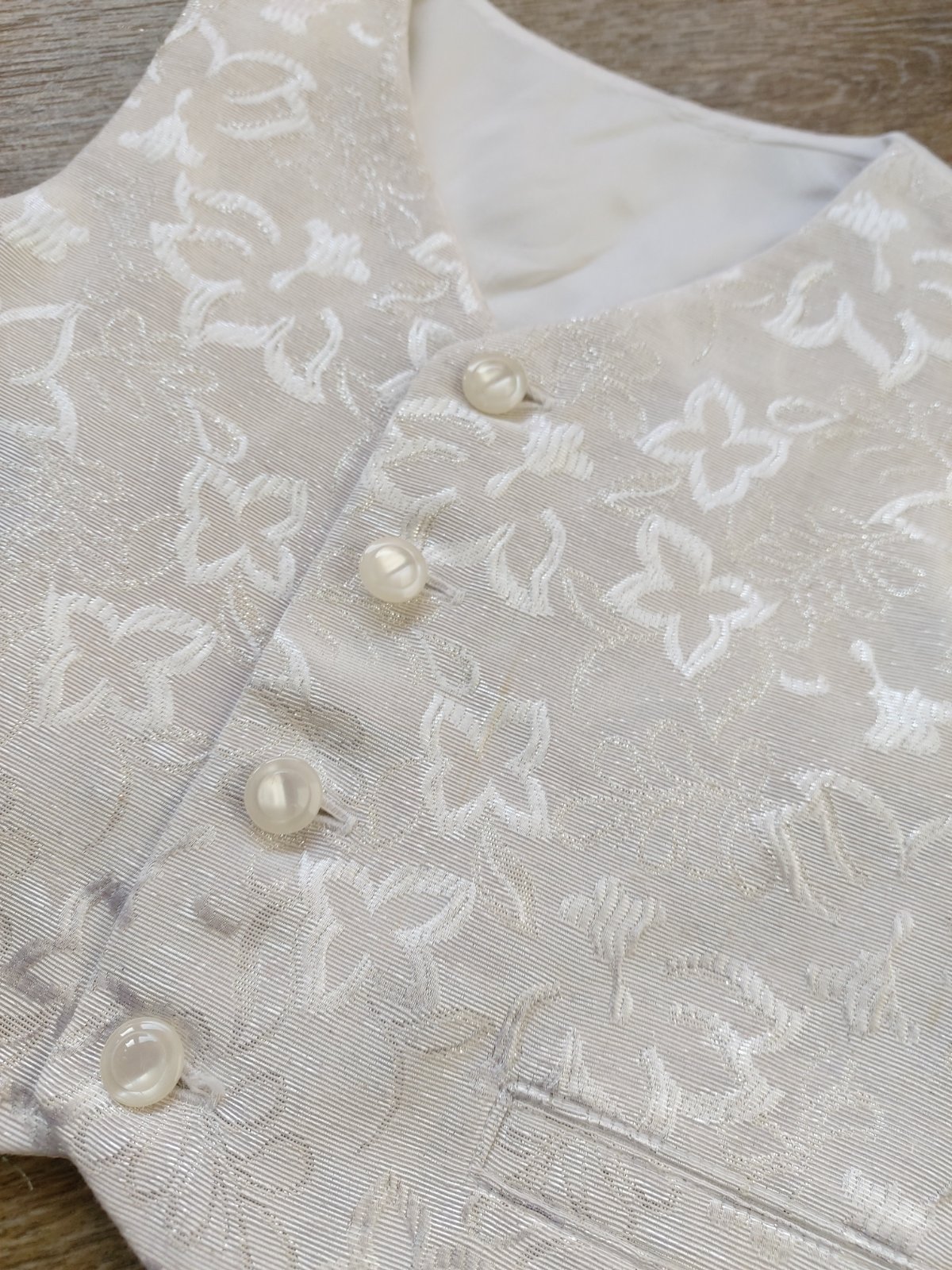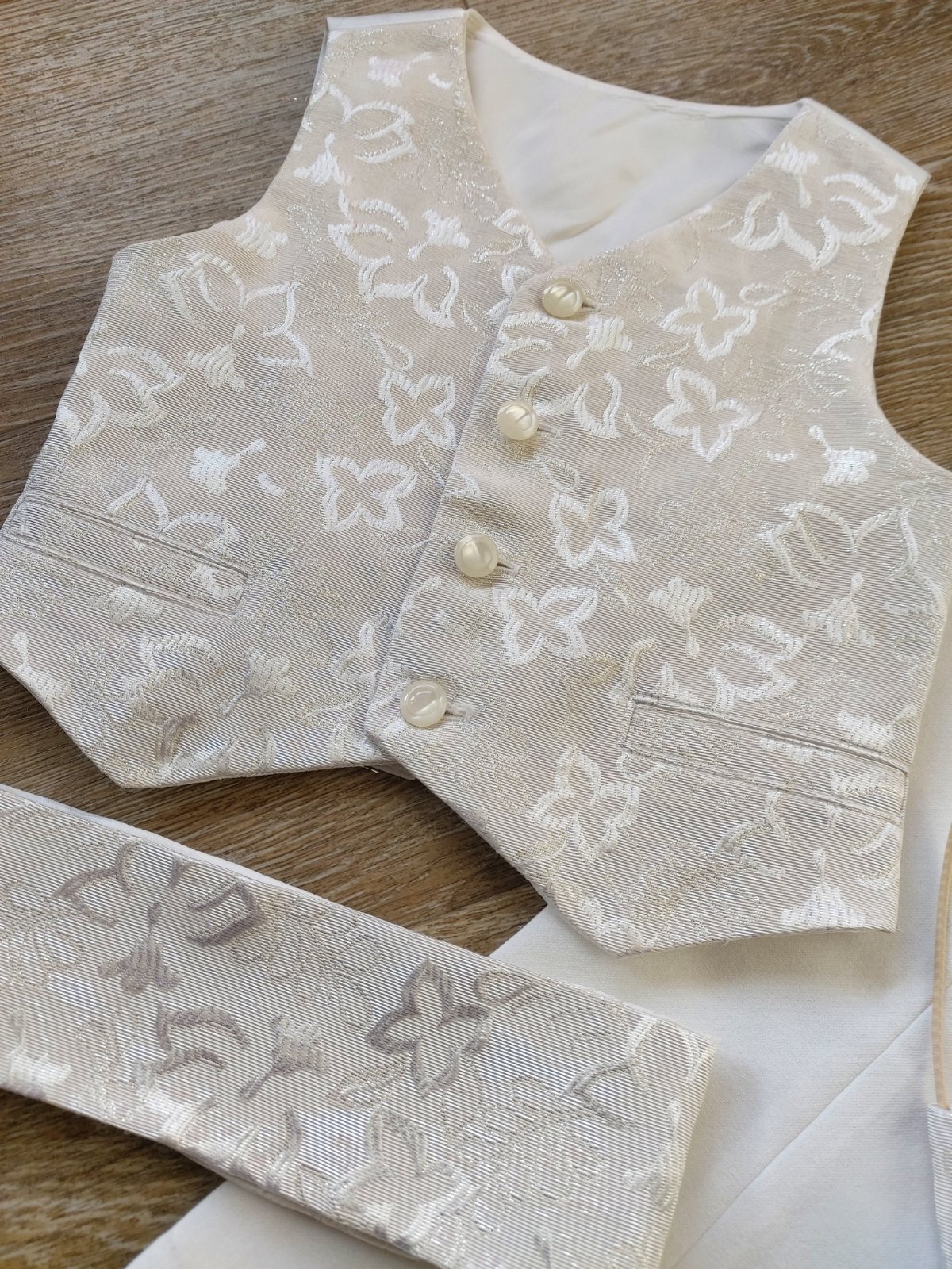 Ponúkam slávnostný komplet šitý na mieru. Vestička je podšitá s dvoma ozdobnými vreckami. Zadný diel je na stiahnutie. Nohavice sú v páse na gumku, čiže sa prispôsobia. Komplet je doplnený šerpou, ktorá je na suchý zips.