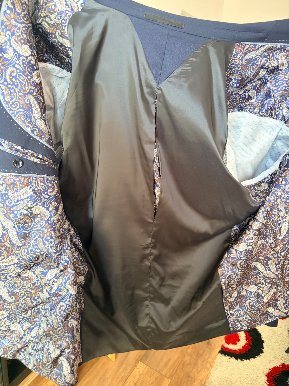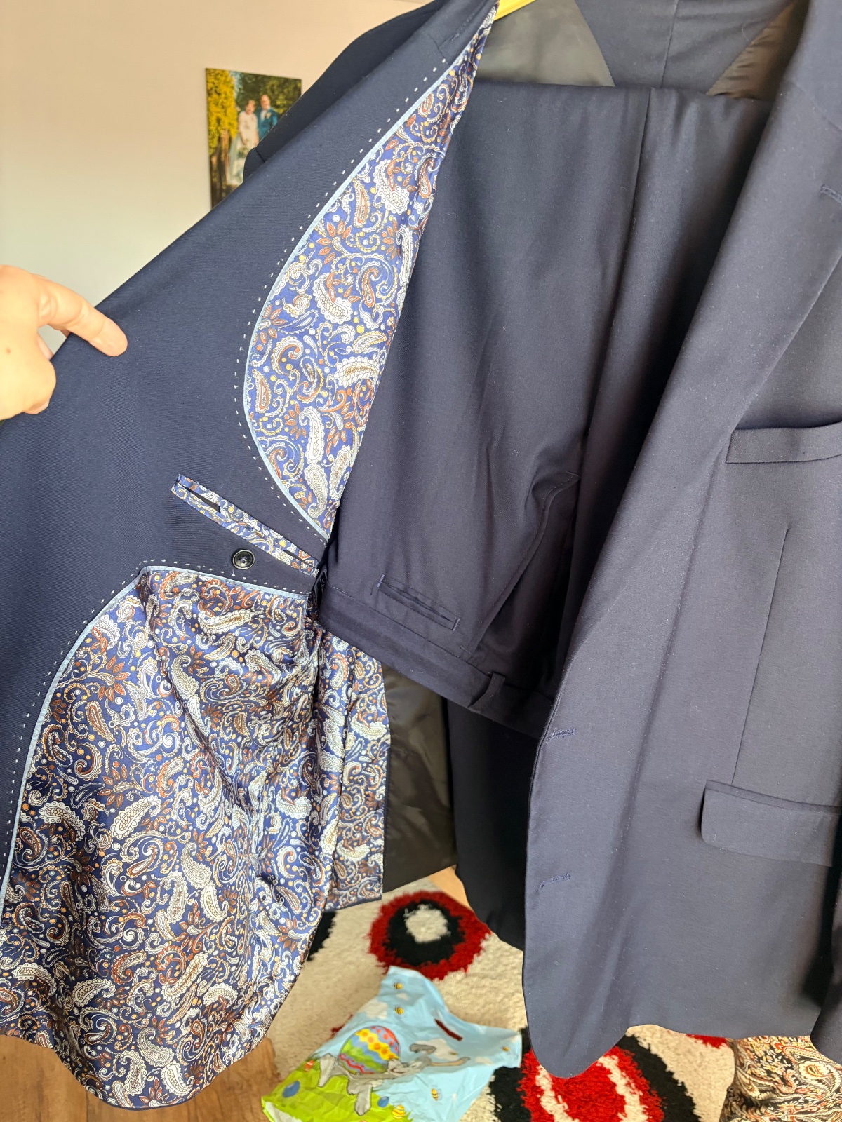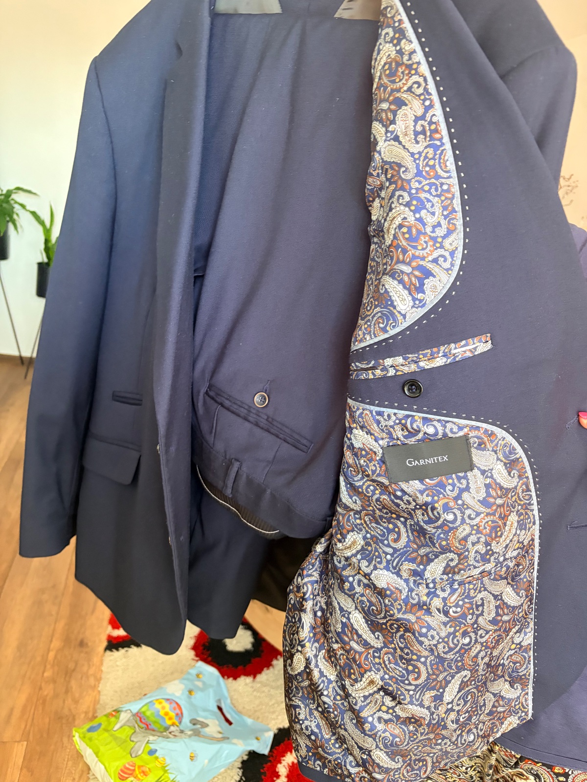 nádherný a kvalitný nadčasový oblek,vhodný na leto,dá sa nosiť aj ako voľnočasový s jemne vyhrnutými rukávmi,vyzerá super aj na silnejšej postave-vďaka jemnému zvislému geometrickému vzoru,kvalitný...