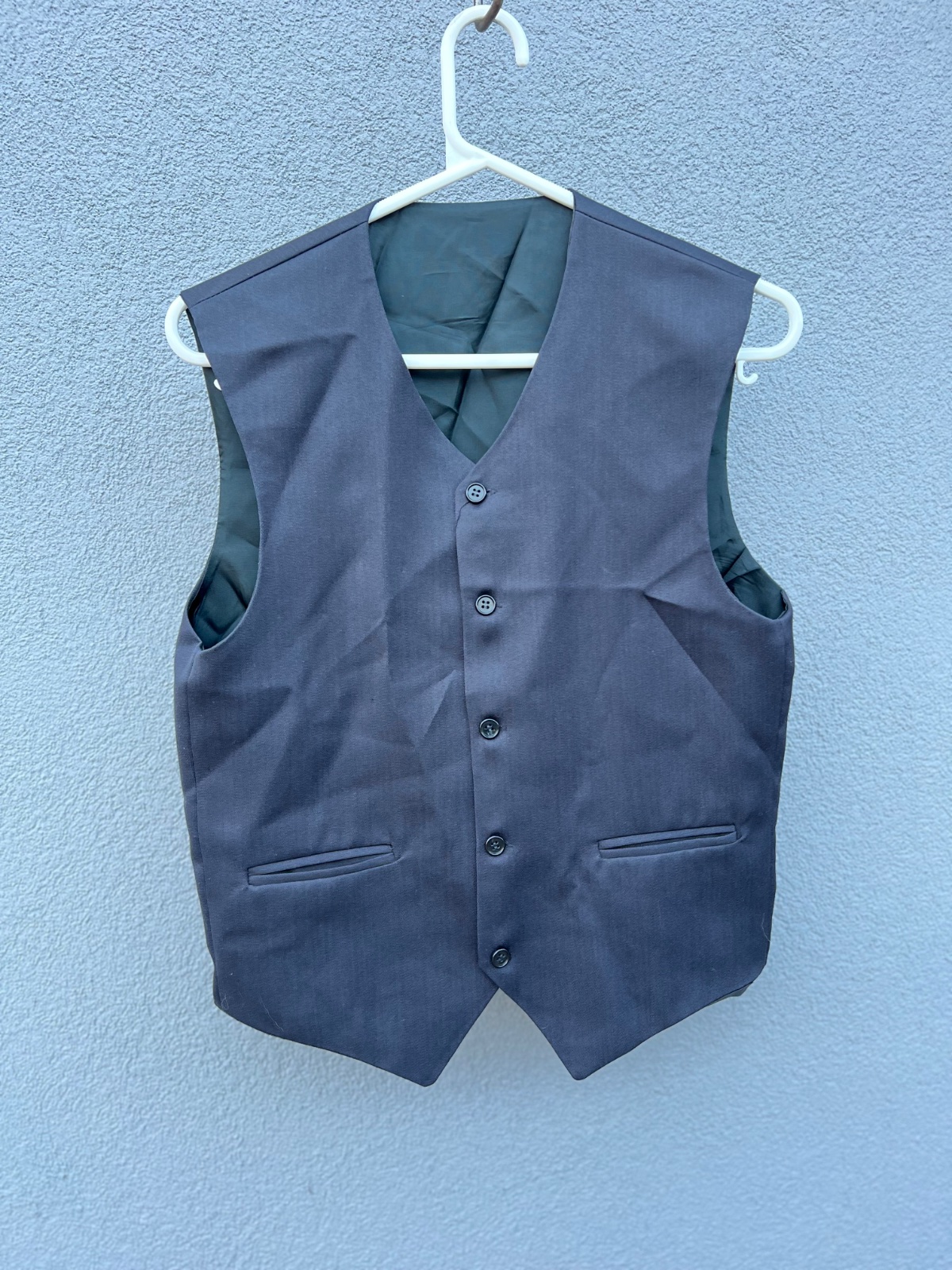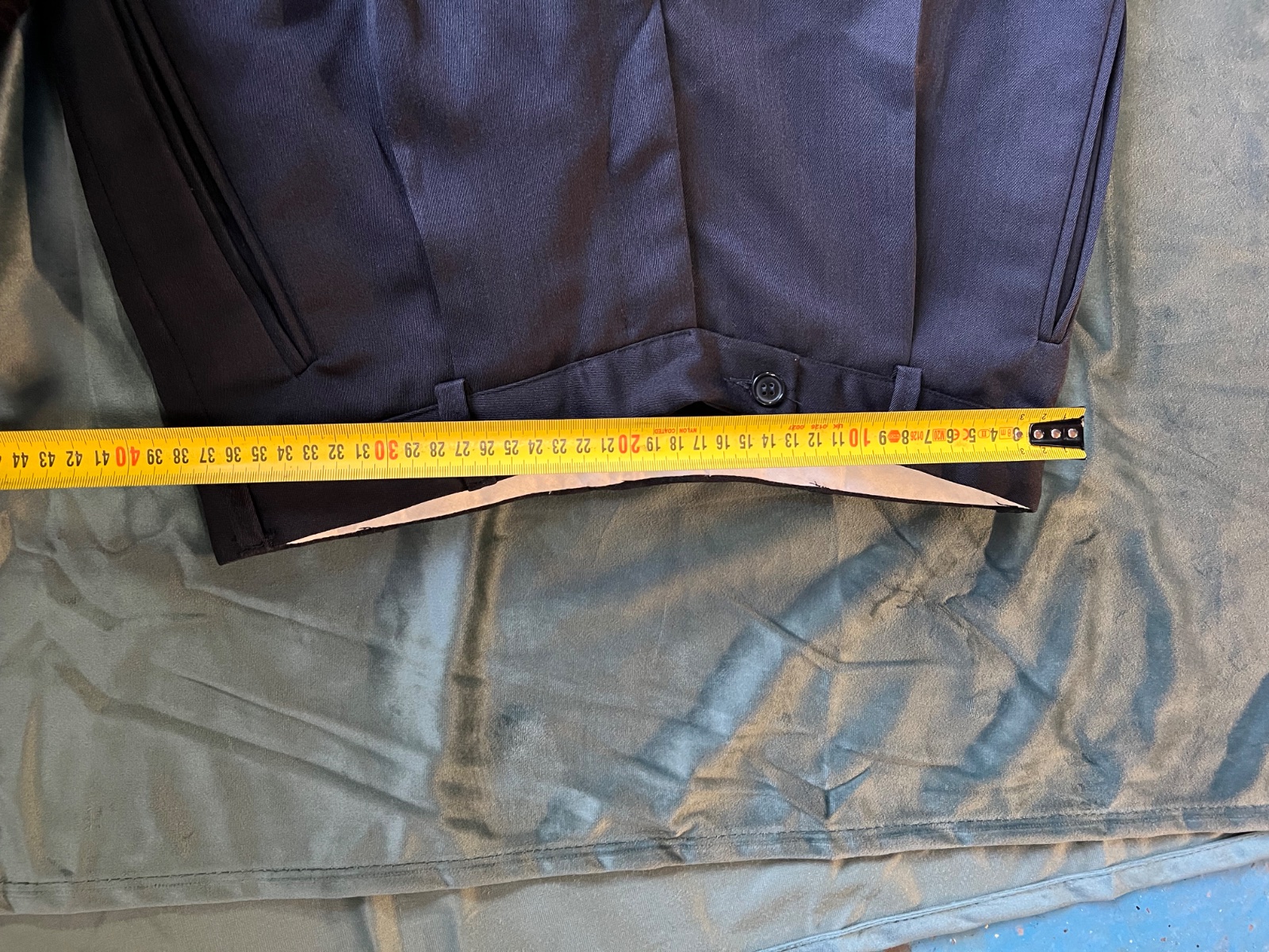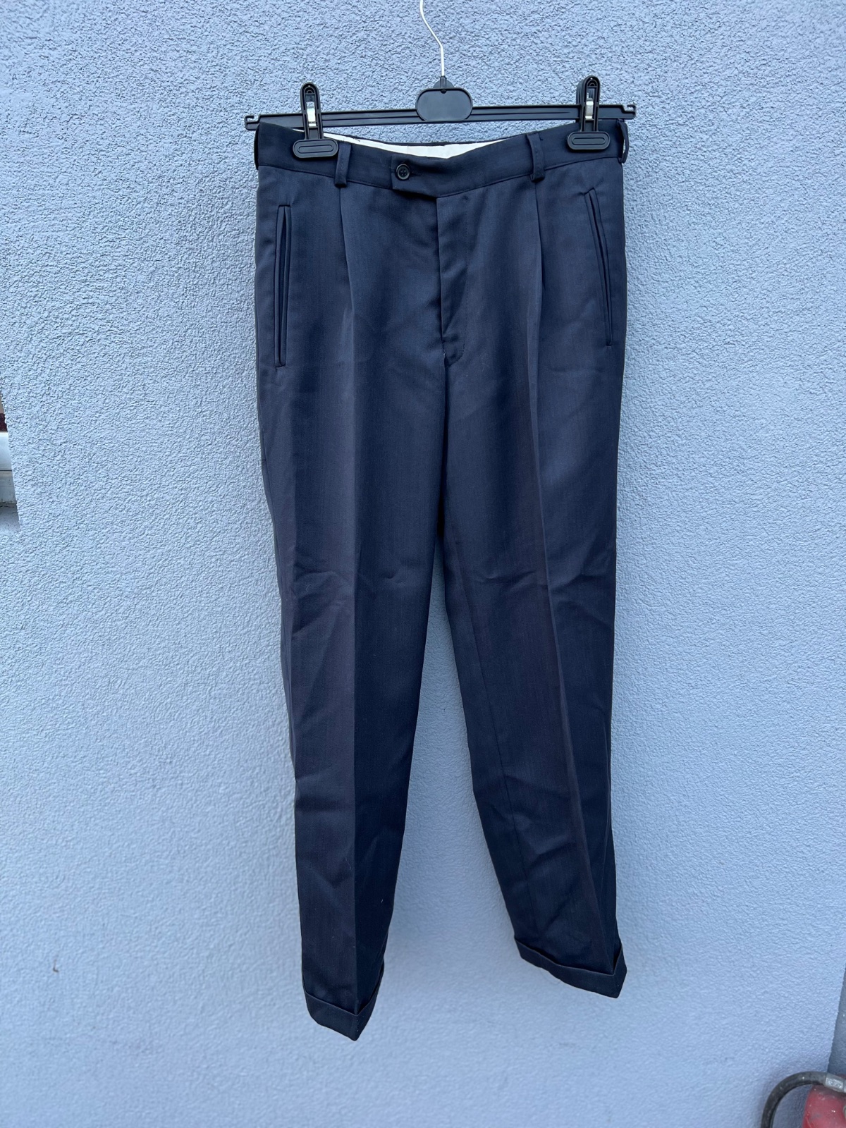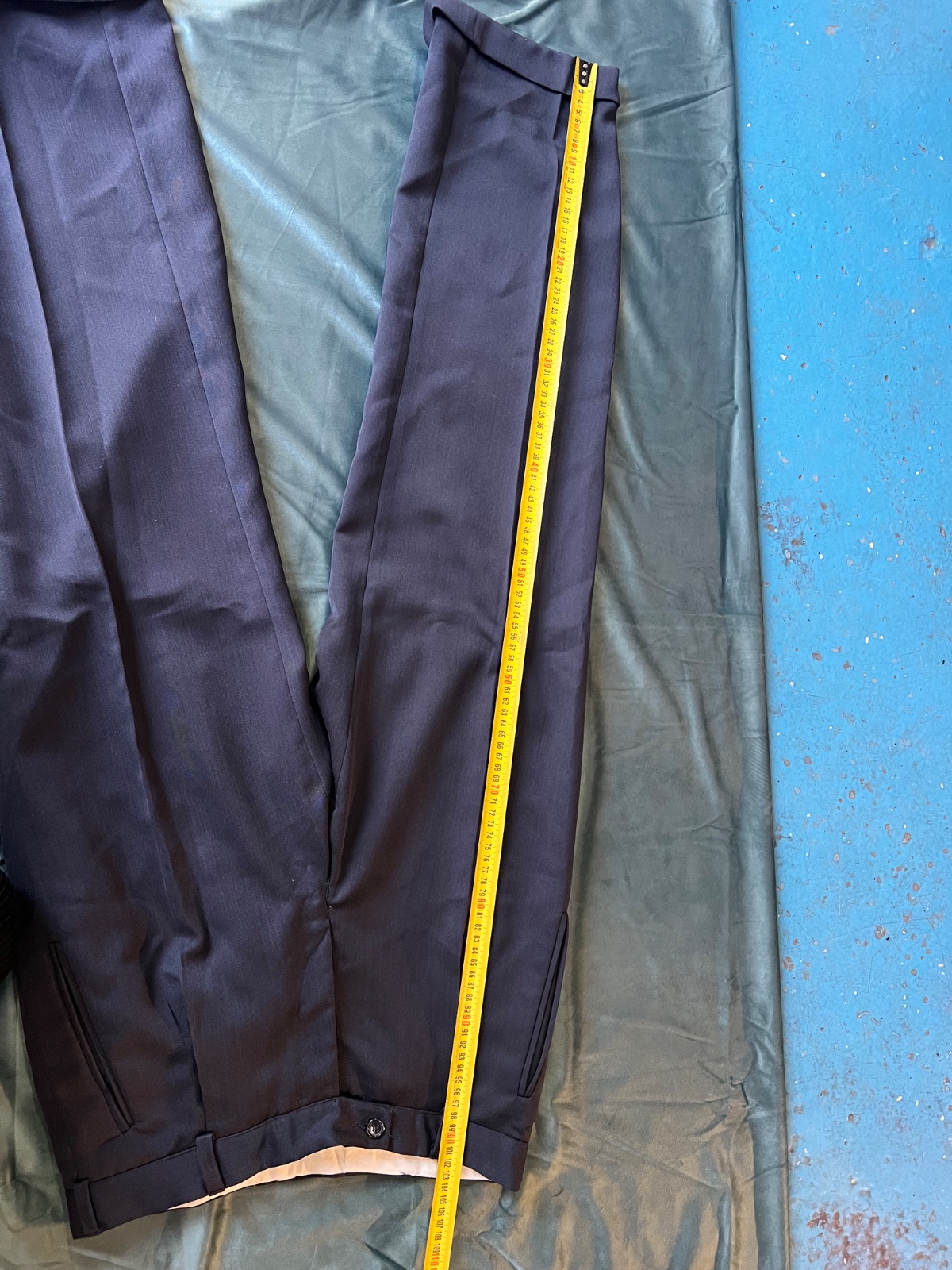 Noseny, starší oblek tmavomodrej farby s pruzkom, hrubší, šitý v odevnom závode Trenčín Sako veľ.M, 182-100-082 Vesta dĺžka 61cm,šírka 46cm + jemná gumička Nohavice celková dĺžka 108cm, od rozkroku...