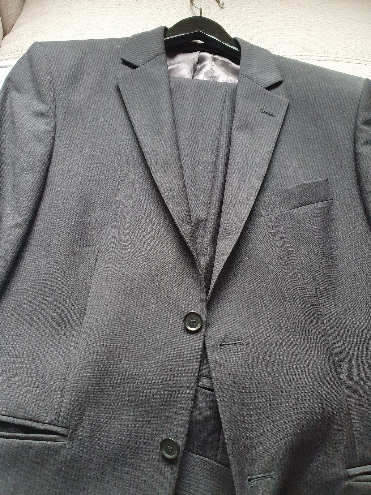 Pansky oblek 3 kombinacia - nohavice, vesta, sako Cena spolu Cierny s jemnym pasikom, sytocierna farba, nevyblednuty, fotene s bleskom Tmavosedy - tmavsi ako na foto, blesk osvetlil Oblecene prilez...