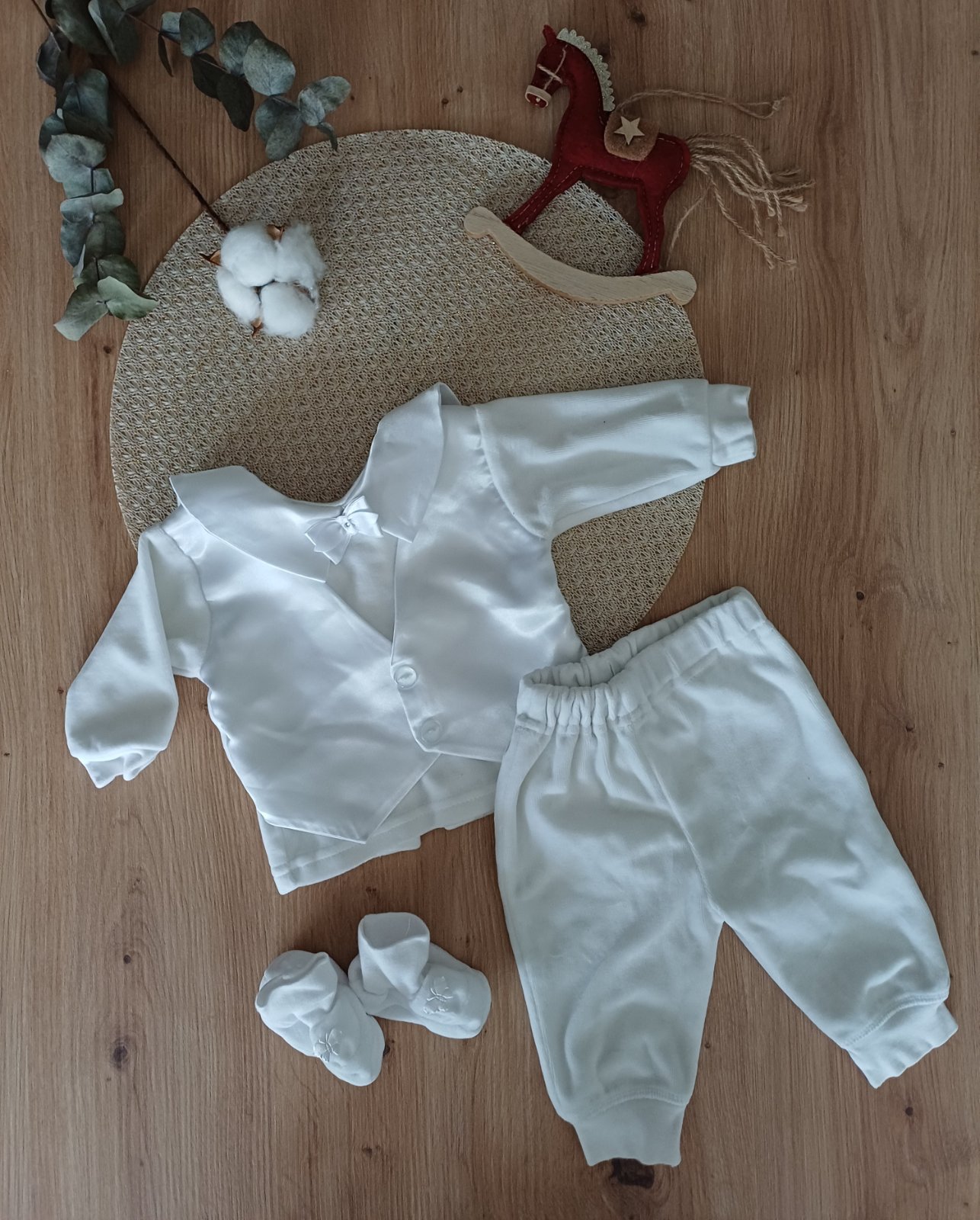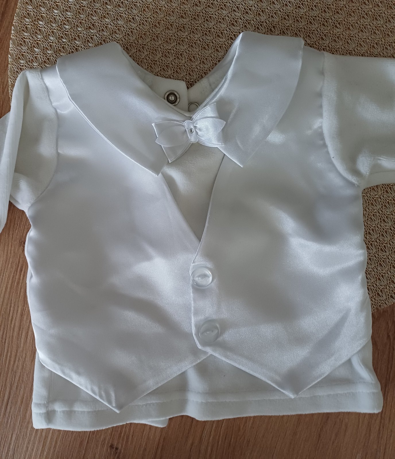 Súprava na krst Teodor zima Táto štýlová súprava obsahuje: - biela zateplená bundička - biela čiapočka - nohavice (podľa farby kompletu) - biele košeľobody - motýlik a traky - pletená vesti...