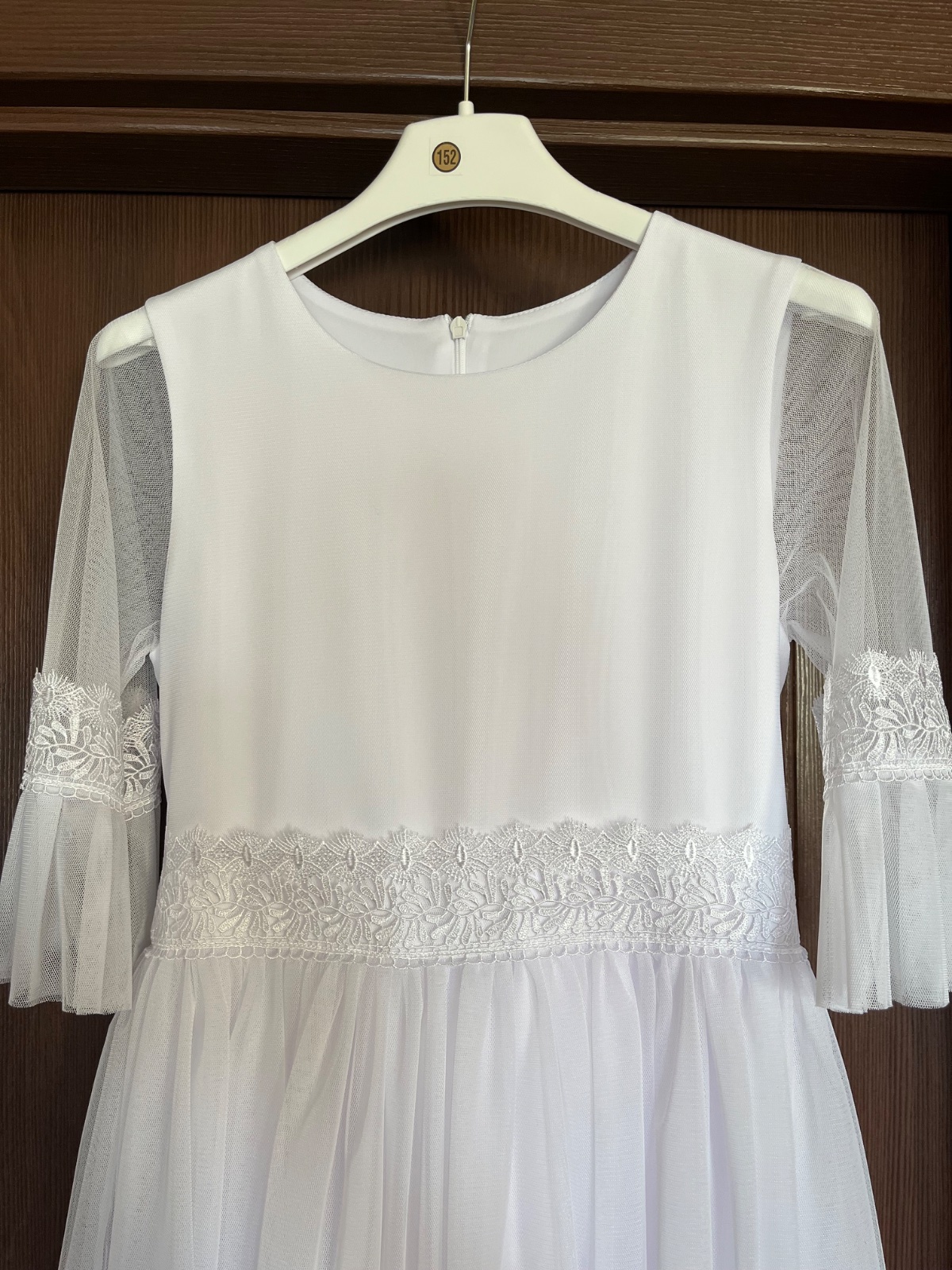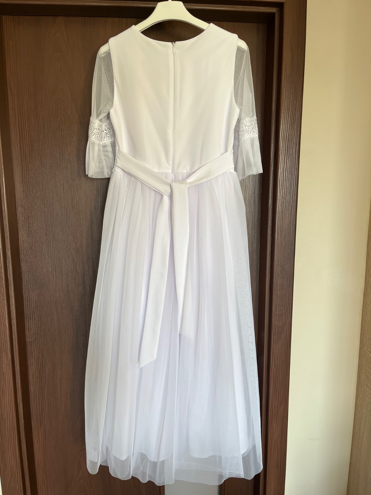 Krásne šaty, raz oblečené, vyčistené v čistiarni. Veľkosť uvedená 152. Dcera mala výšku 140 cm. K šatám mám aj bolerko a kruhovú spodničku, balerínky veľkosť 34, taštičku a ozdoby do vlasov. Pozrite si ostatné moje inzeráty.