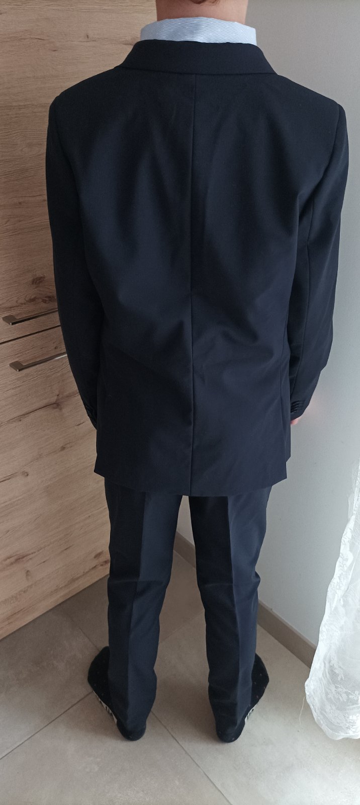 Predám chlapčenský oblek Zara, nohavice veľkosť 152 sú oblečené na chlapcovi s výškou 161cm, sako je veľkosti 164. Model má váhu 45kg, vnútri nohavíc je regulovatelny pás.