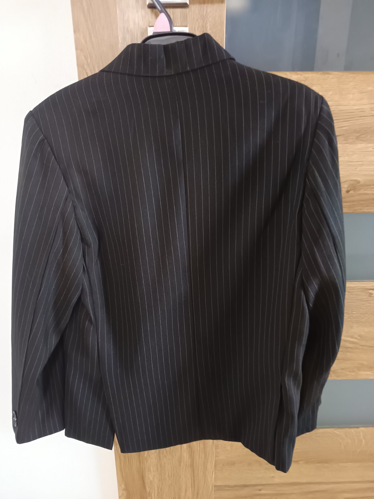 Chlapčenský oblek v top stave. V cene sako, nohavice a košeľa. Nohavice dĺžka 78 cm, pás v kľude 2x 28 cm, natiahnutý 2x 35 cm Sako dĺžka 58 cm, sirka pod pazuchami 41 cm, rukáv 44 cm. Košeľa krát...