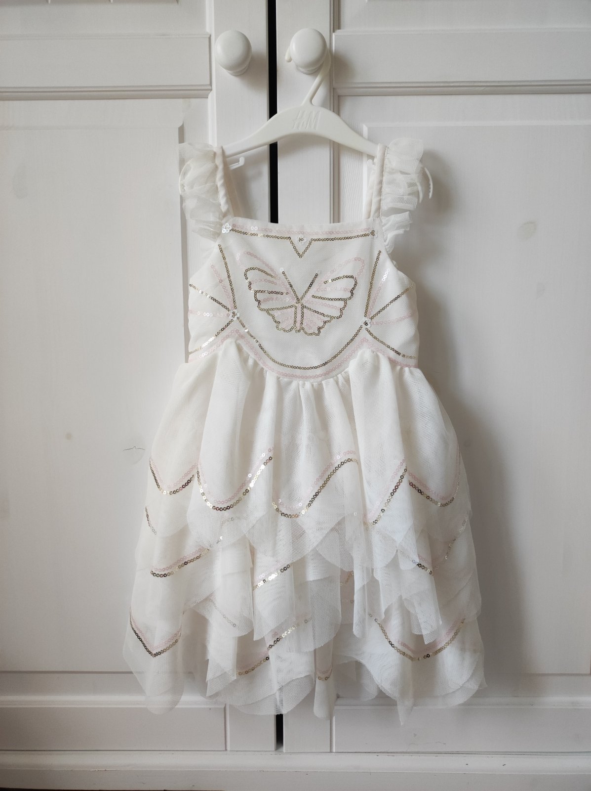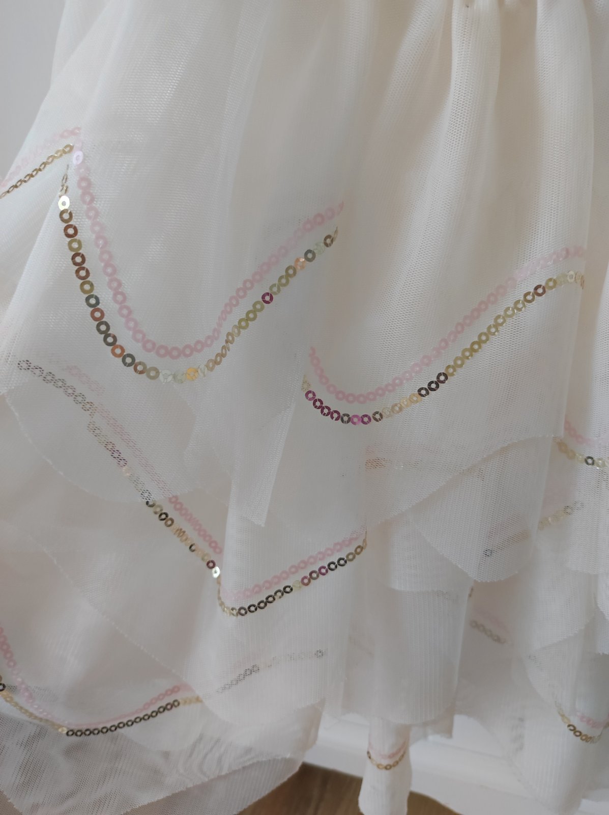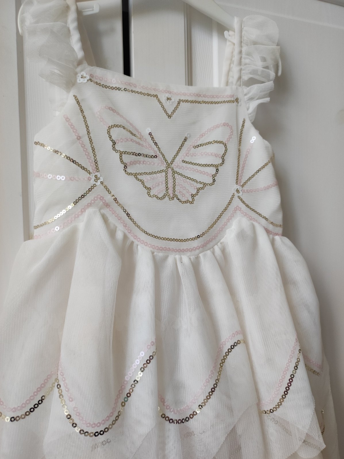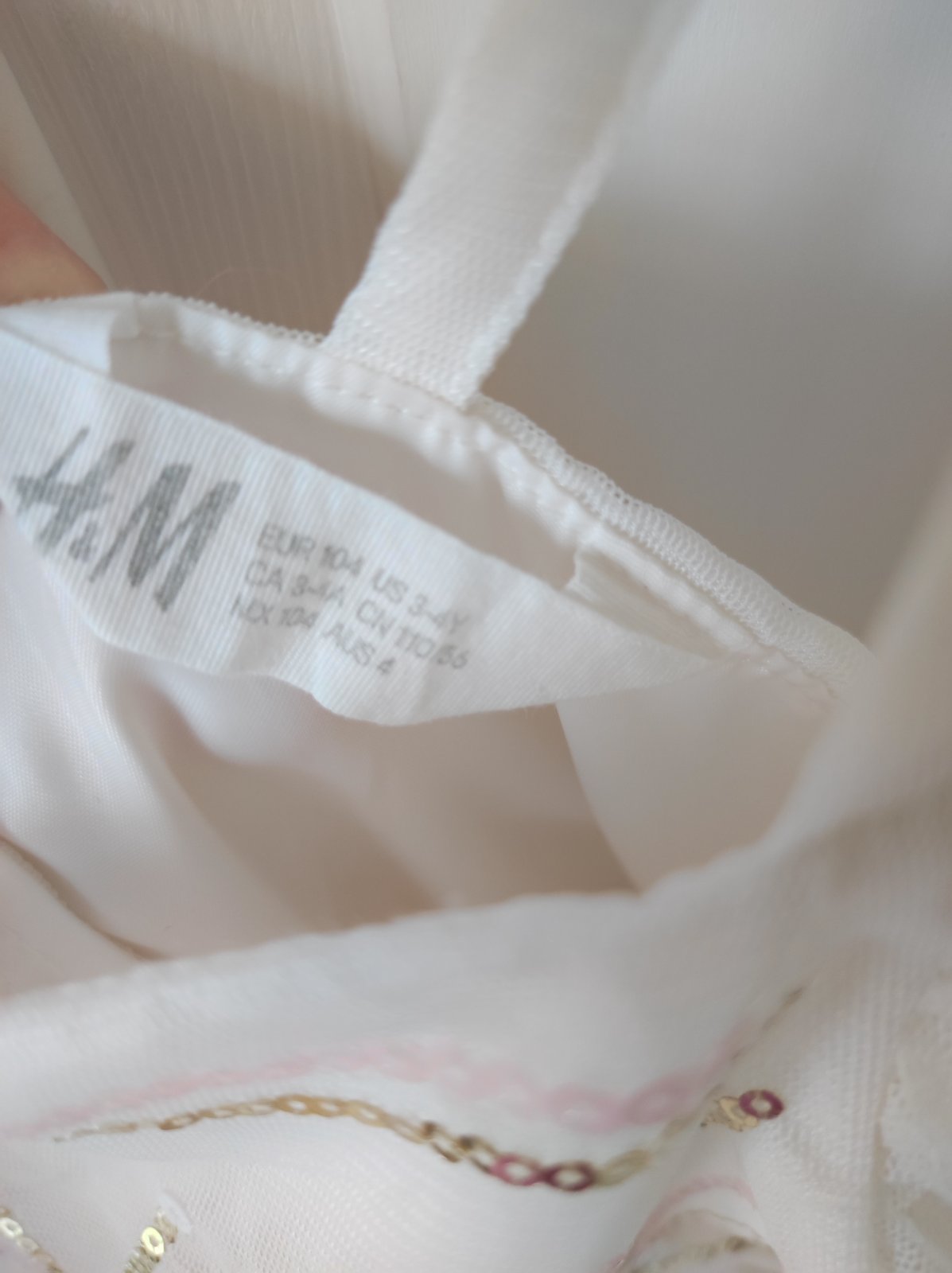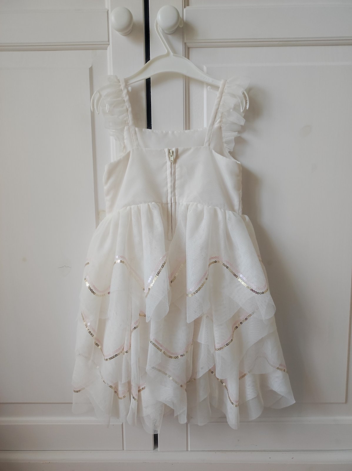Predám prenádherné ľahučké šaty H&M 104 v top stave. Šatičky sú smotanovej farby, s našitými ružovými a zlatými flitrami. Suknička je bohato riasená a podšitá spodničkou. Zapínanie vzadu je na zips. Použité len na dve letné svadby.