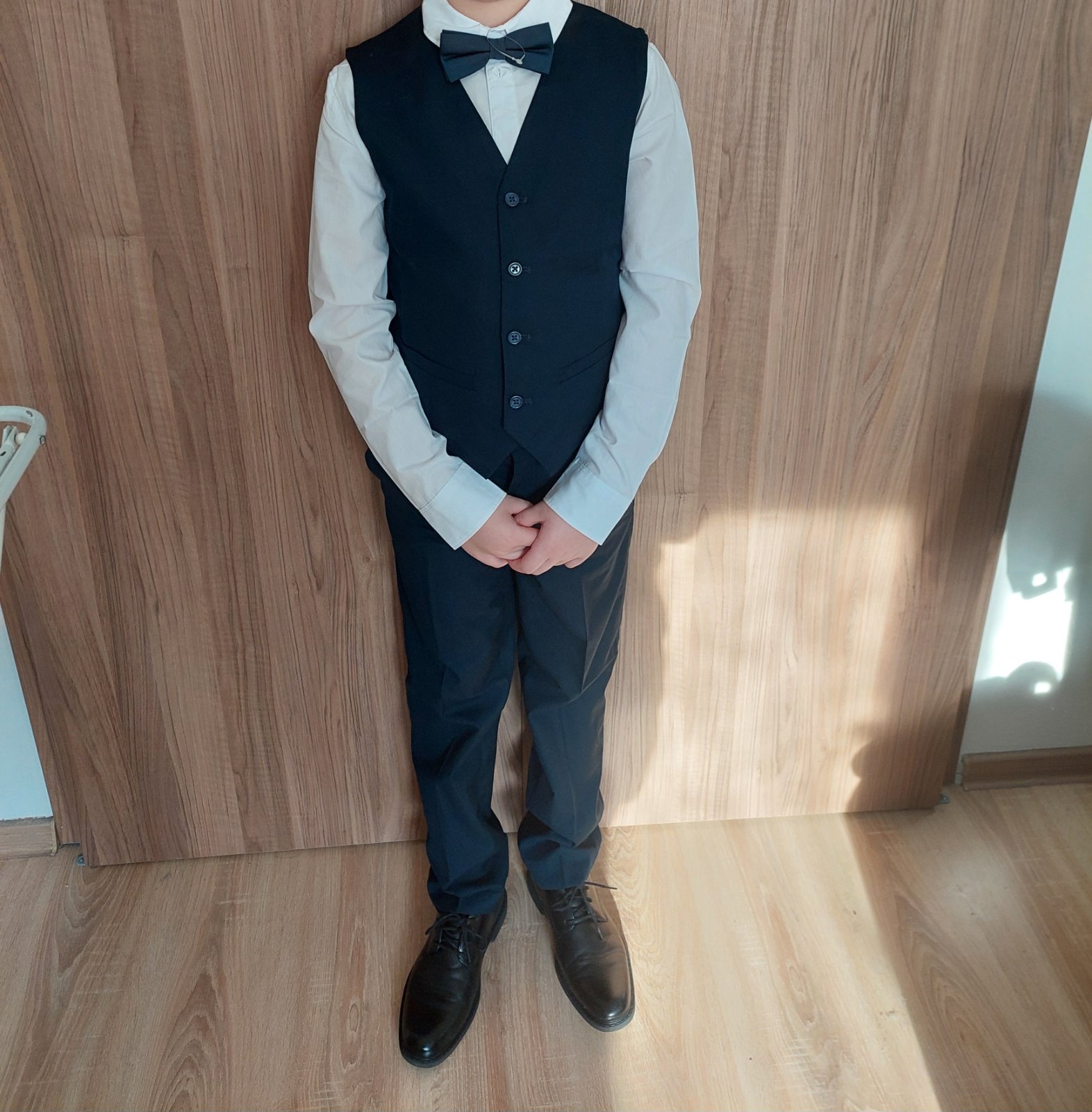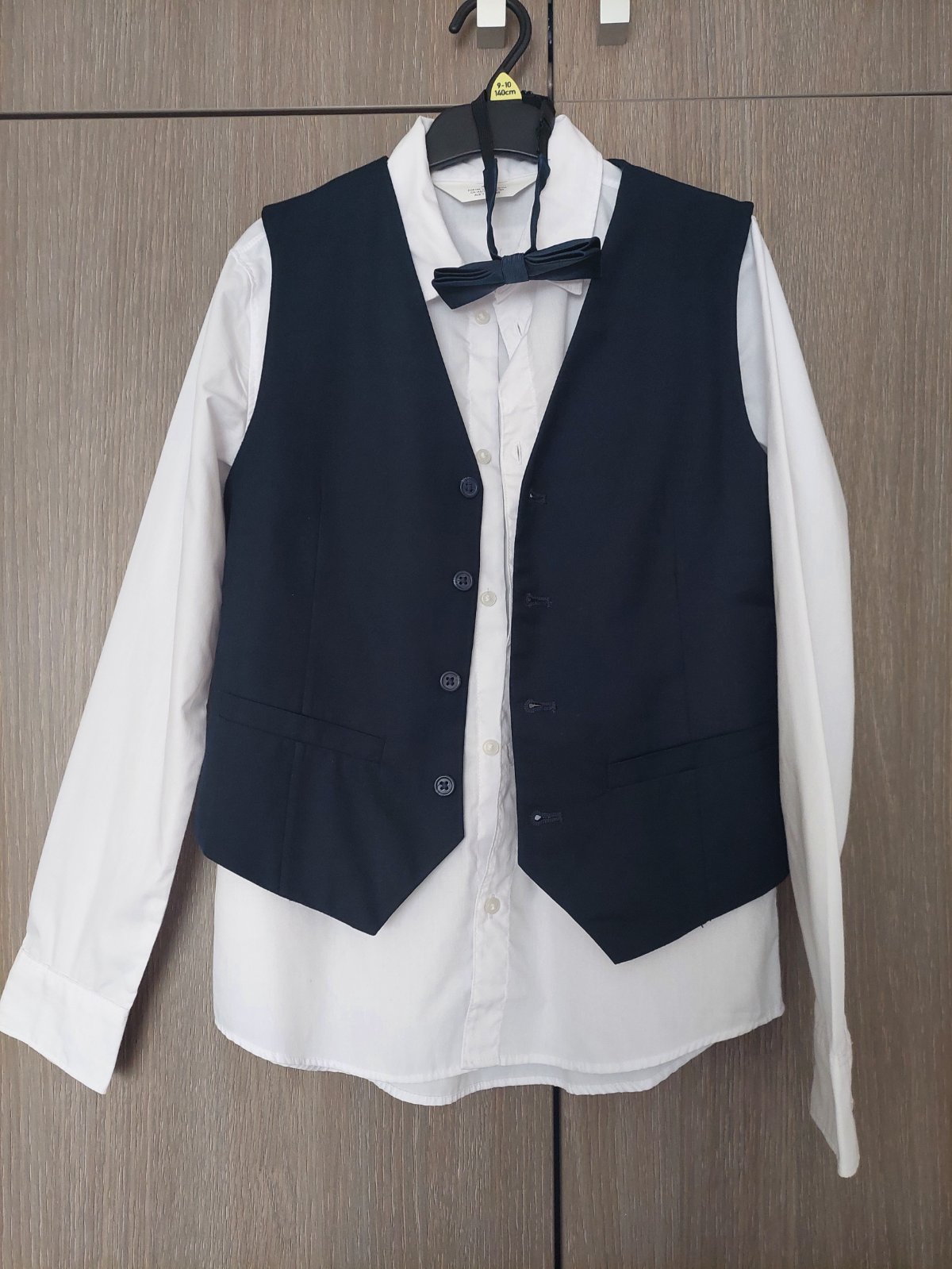Košeľa, vesta, motýlik z H&M, veľkosť 146, vesta zapnutá - šírka cca 39 x 2 cm.