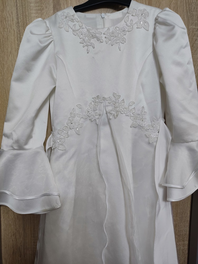 Šaty na prvé sväté prijímanie z bieleho saténu. Spodok šiat je vyrobený z bavlnenej podšívky, dodatočne zakončenej tylom. Krásna aplikácia ukončená perlami v páse. 3/4 rukáv. Dlhé šaty siahajú...