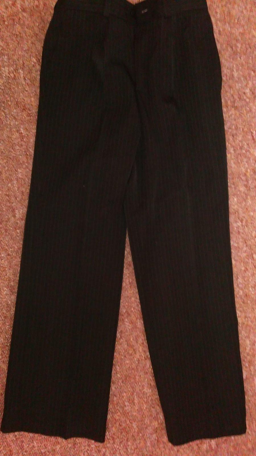 Predam tieto len raz oblečene na 1.sv.prijmani, spoločenske nohavice veľkosť pišu 140, mali manžety- dole su odhnute, takže veľkost je asi 146, daju sa podhnuť naspäť aby boli kratšie, dlžka 87cm, pas 32cn- po bokoch gumičky takže sa daju ešte natiahnuť, farba je čierna s jemnymi pružkami.