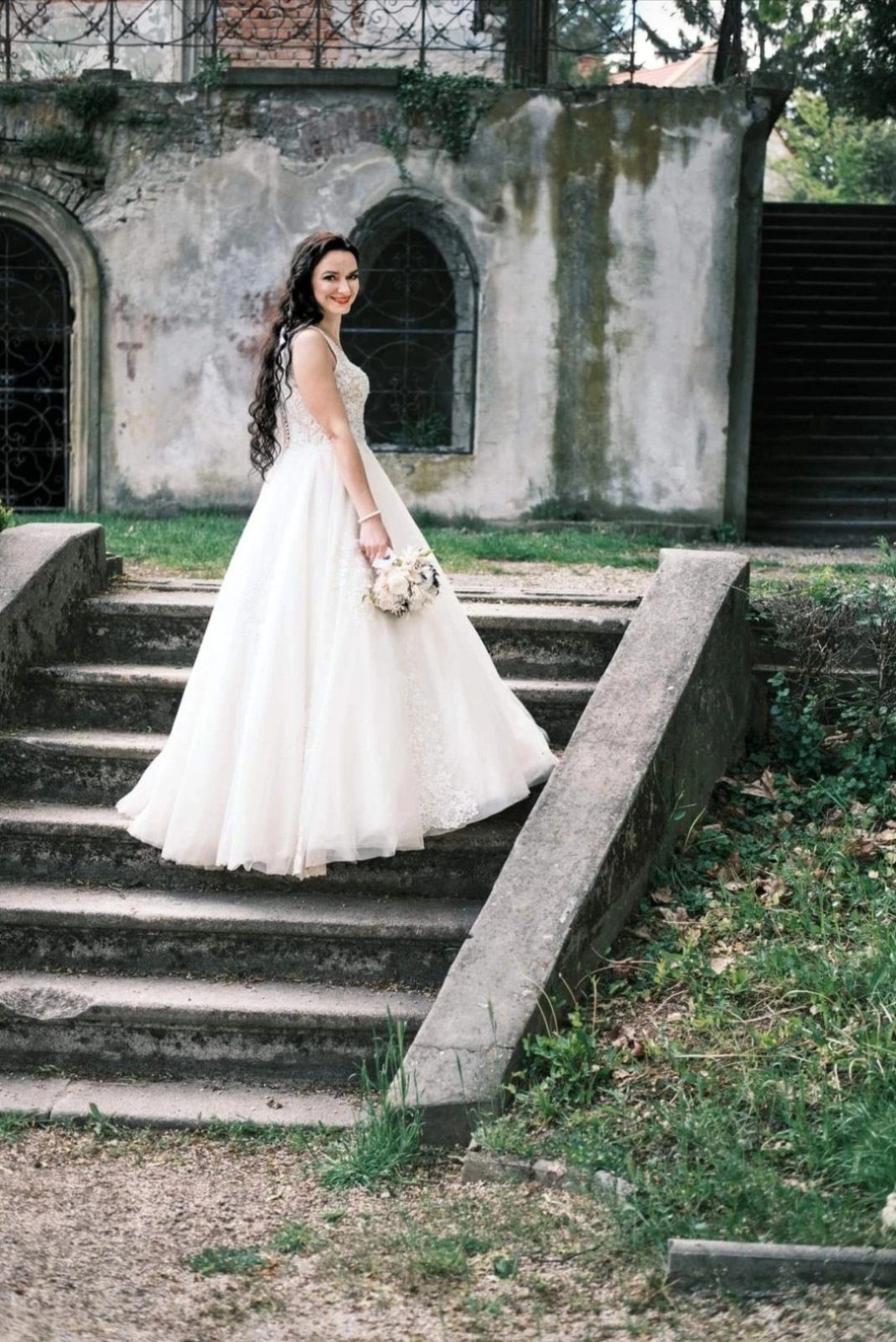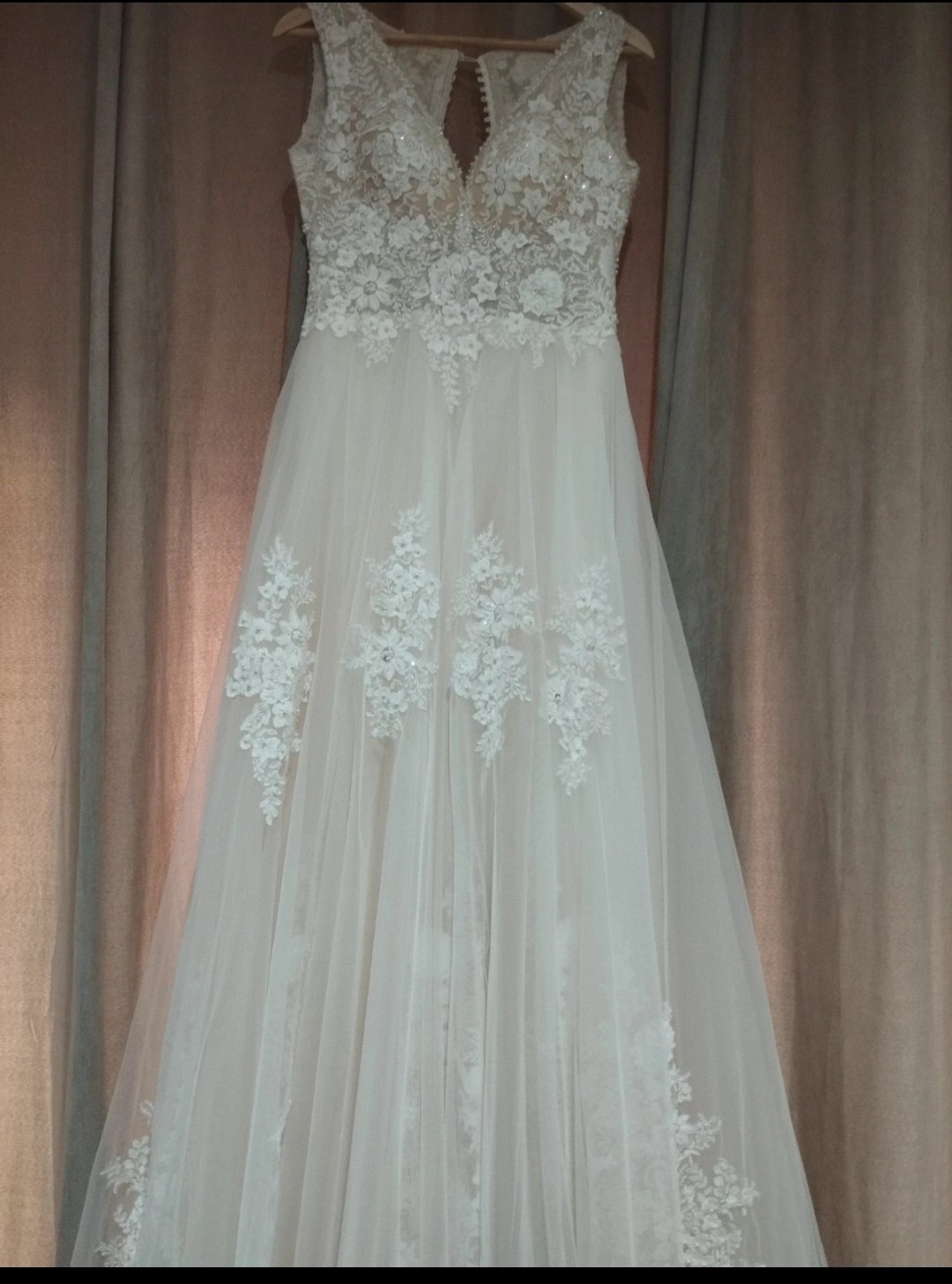 Predávam svoje veľmi pohodlné svadobne šaty velkost 36, S, značky Irian Sam, farba Ivory, pôvodná cena bola 680e, vycistene v cistiarni 33€, plus kruh pod šaty , vak. Moja výška 167 cm, mala som tenisky a ešte tam bola vola na vysoké opätky. Bez kruhu sú ešte dlhšie, takže kľudne aj na vyššiu postavu. Vzadu gombíky, zips.