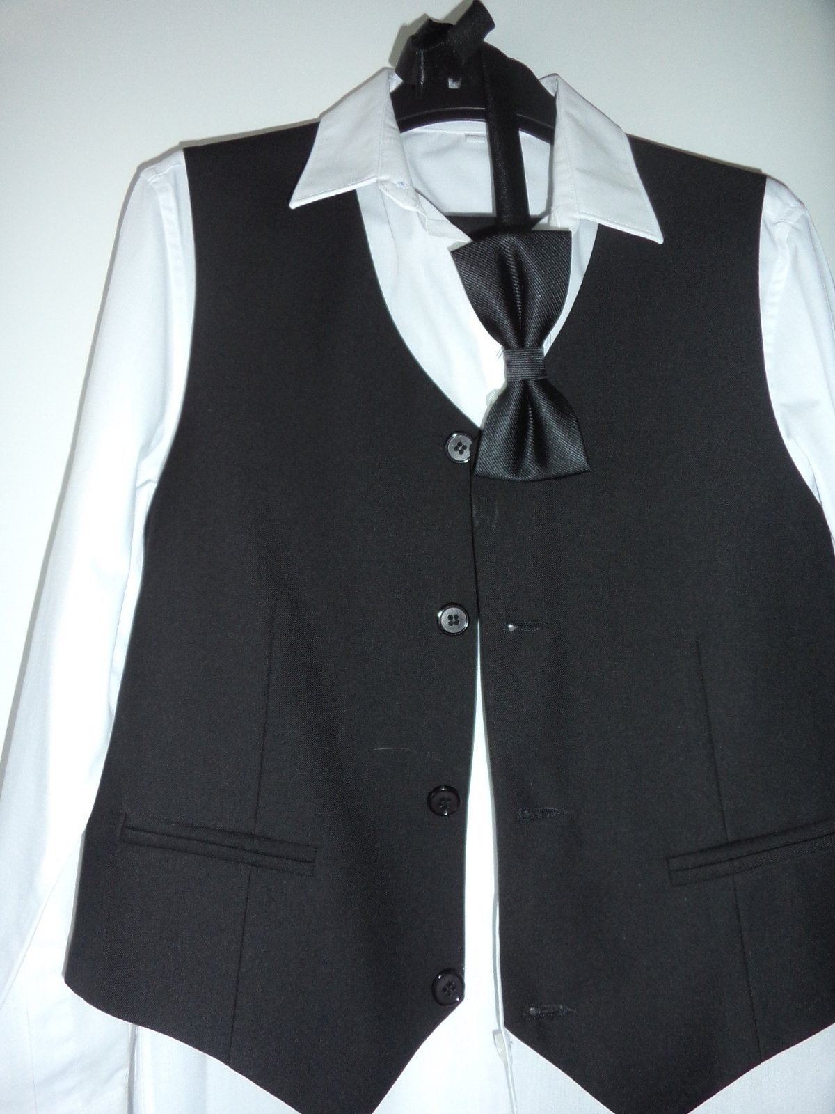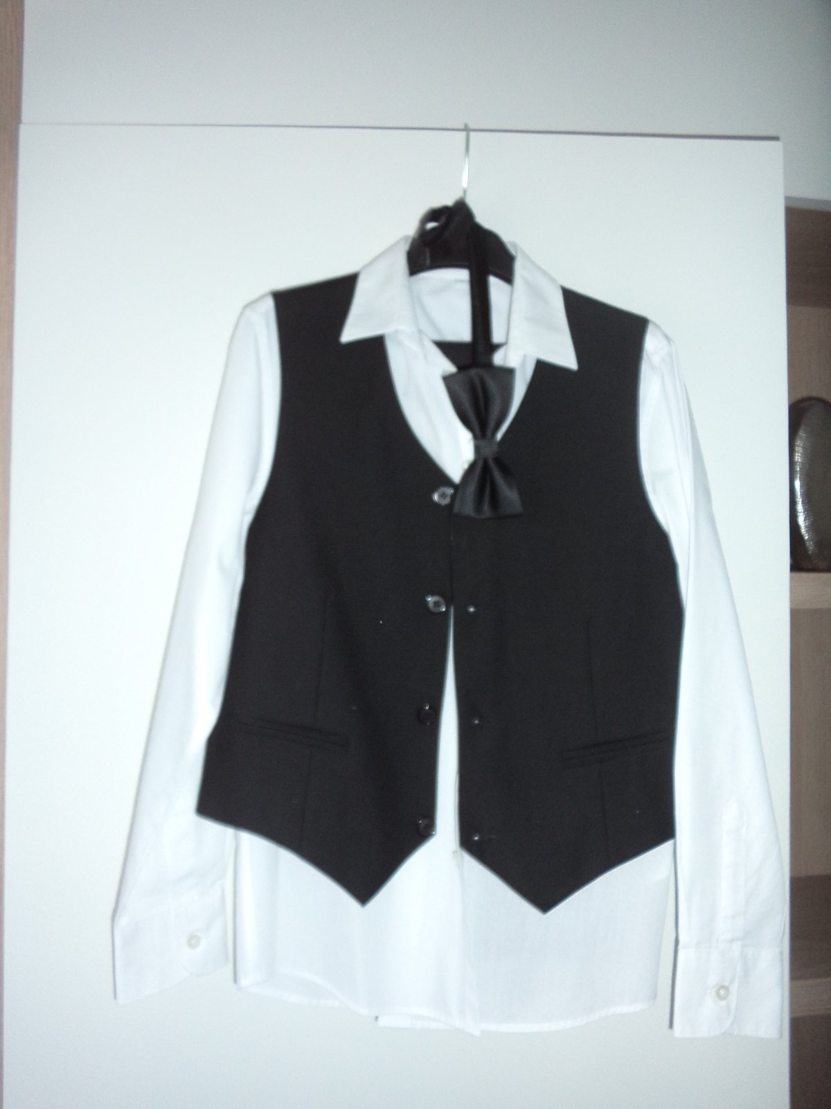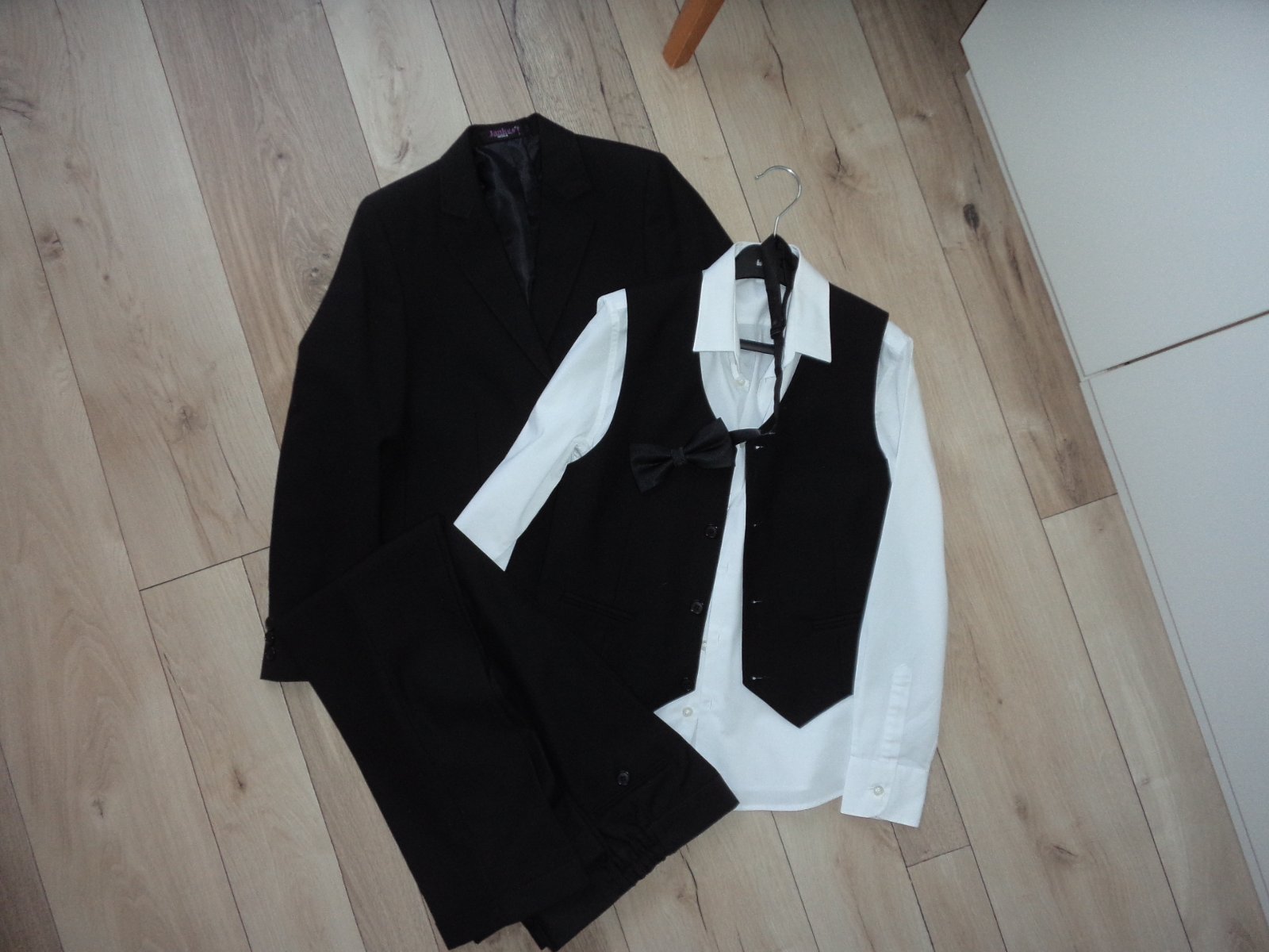 Chlapčenský čierny oblek (sako, vesta, nohavice, košela, motýlik) veľkosť 140 a košela veľkost 146. Oblečené 2x na sväté prijímanie a na svadbu. Cena za komplet 38eur