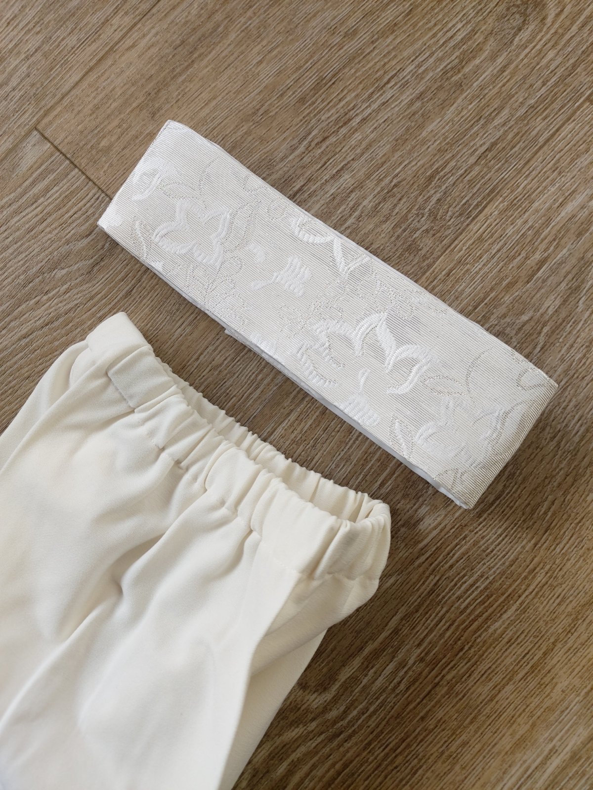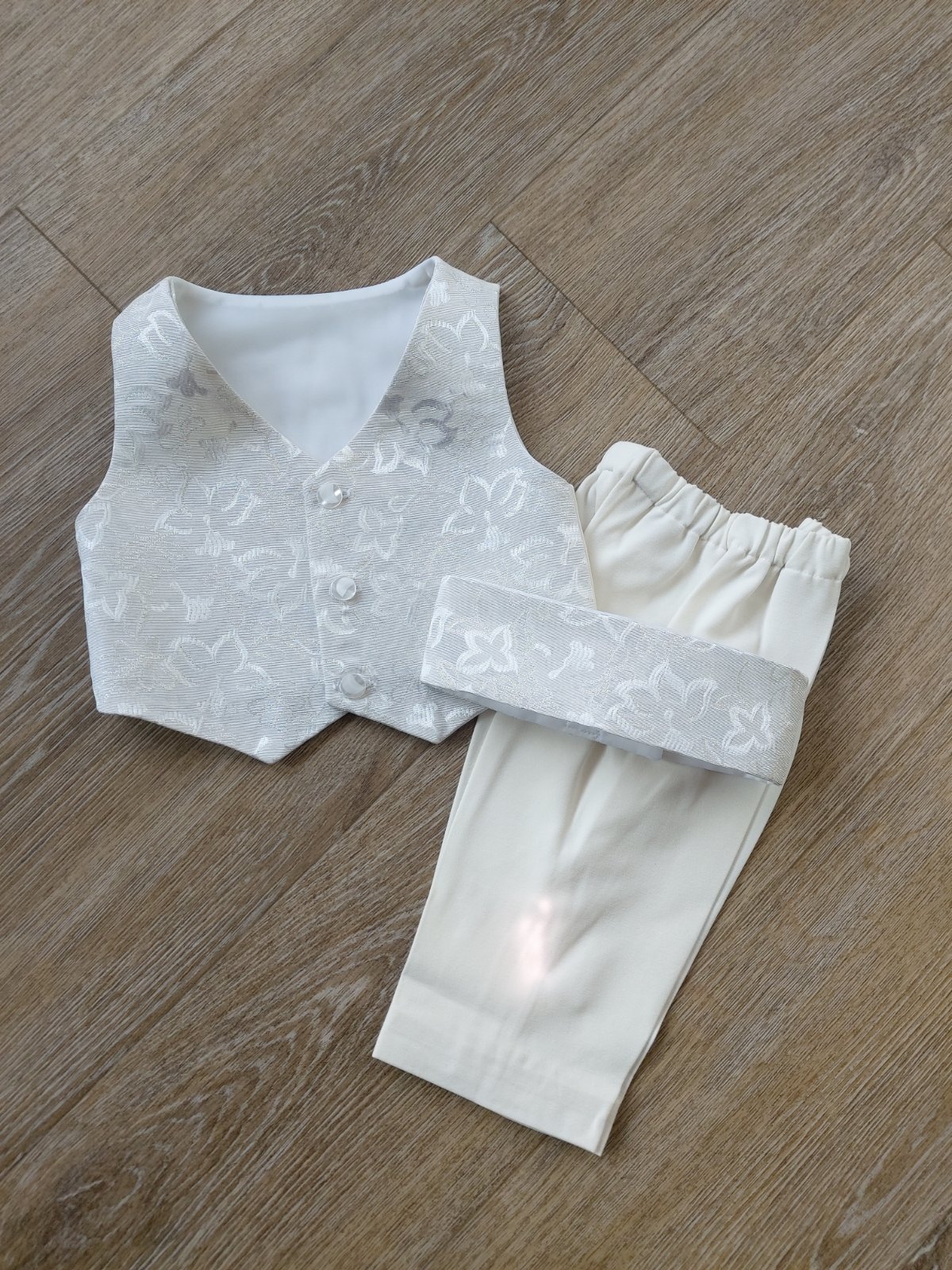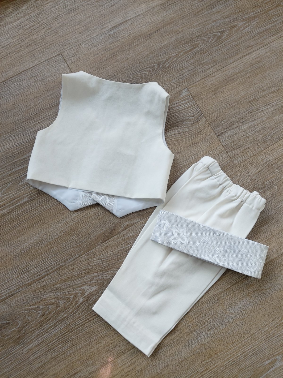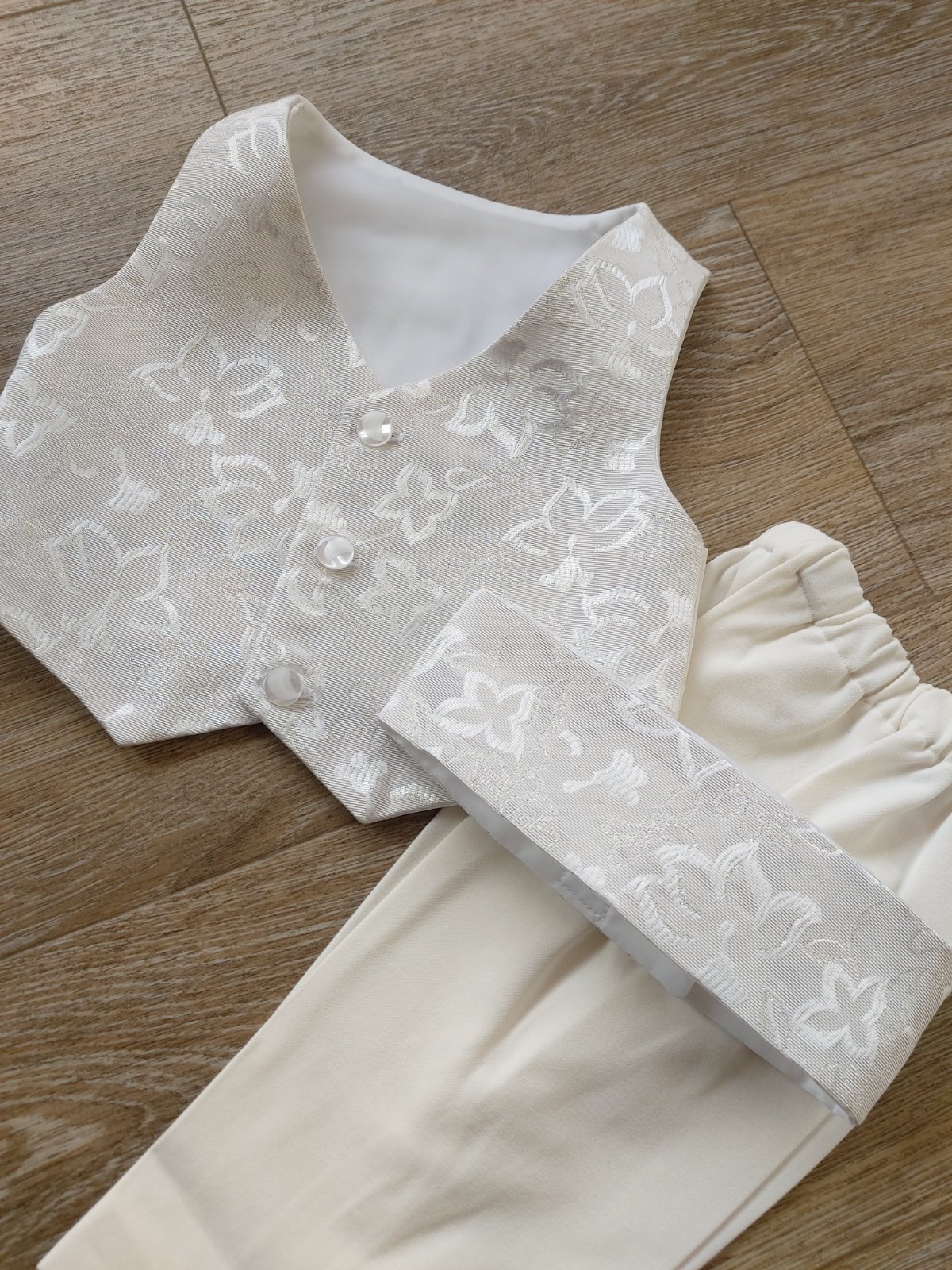 Ponúkam slávnostný komplet šitý na mieru. Vestička je podšitá. Nohavice sú v páse na gumku. Komplet je doplnený šerpou na suchý zips.
