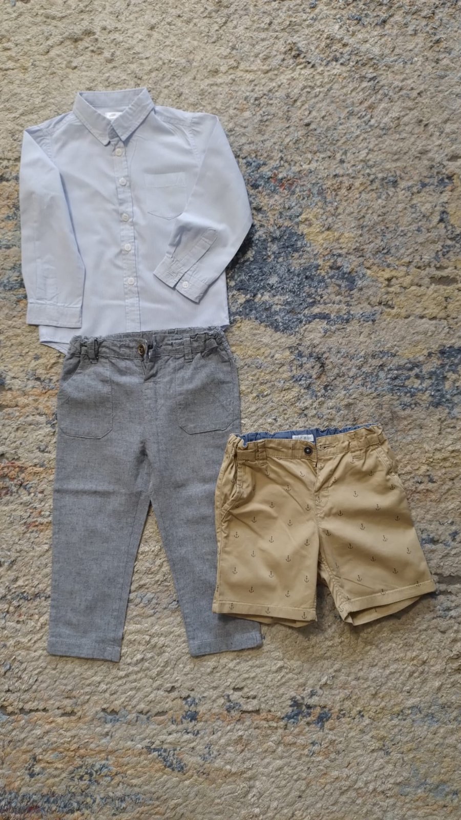 Slávnostné oblečenie na rôzne príležitosti. 1x svetlomodrá košeľa, 1x sivé nohavice a 1x béžové krátke nohavice. Prosím, keďže mi nechodia upozornenia, píšte radšej SMS. Ďakujem.