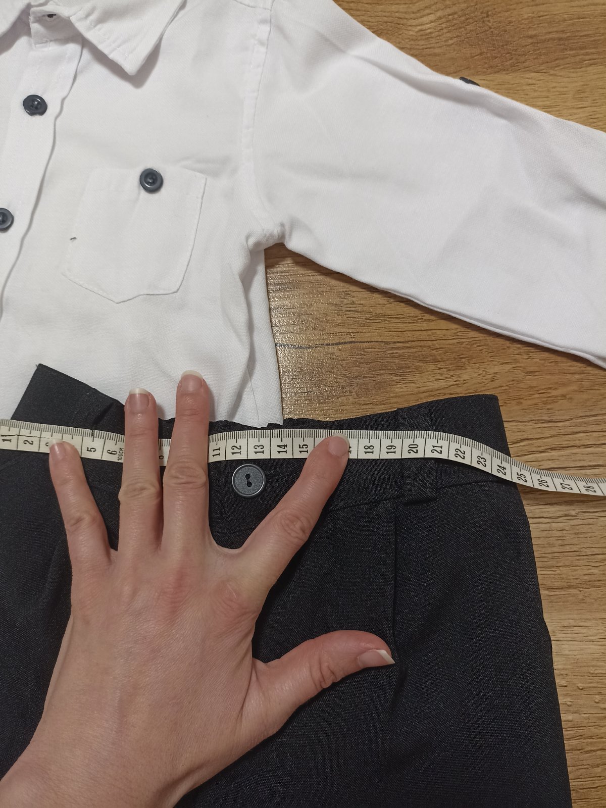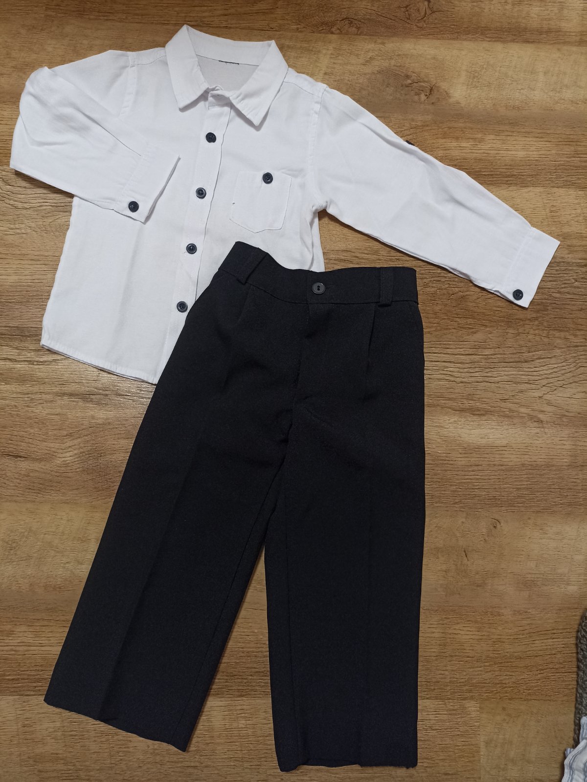 Krásny slávnostný set pre chlapčeka. Košeľa ja bavlnená a rukávy sa dajú vypnúť hore na trojštvrťový rukáv. Komplet nemá poškodenie a je v super stave.
