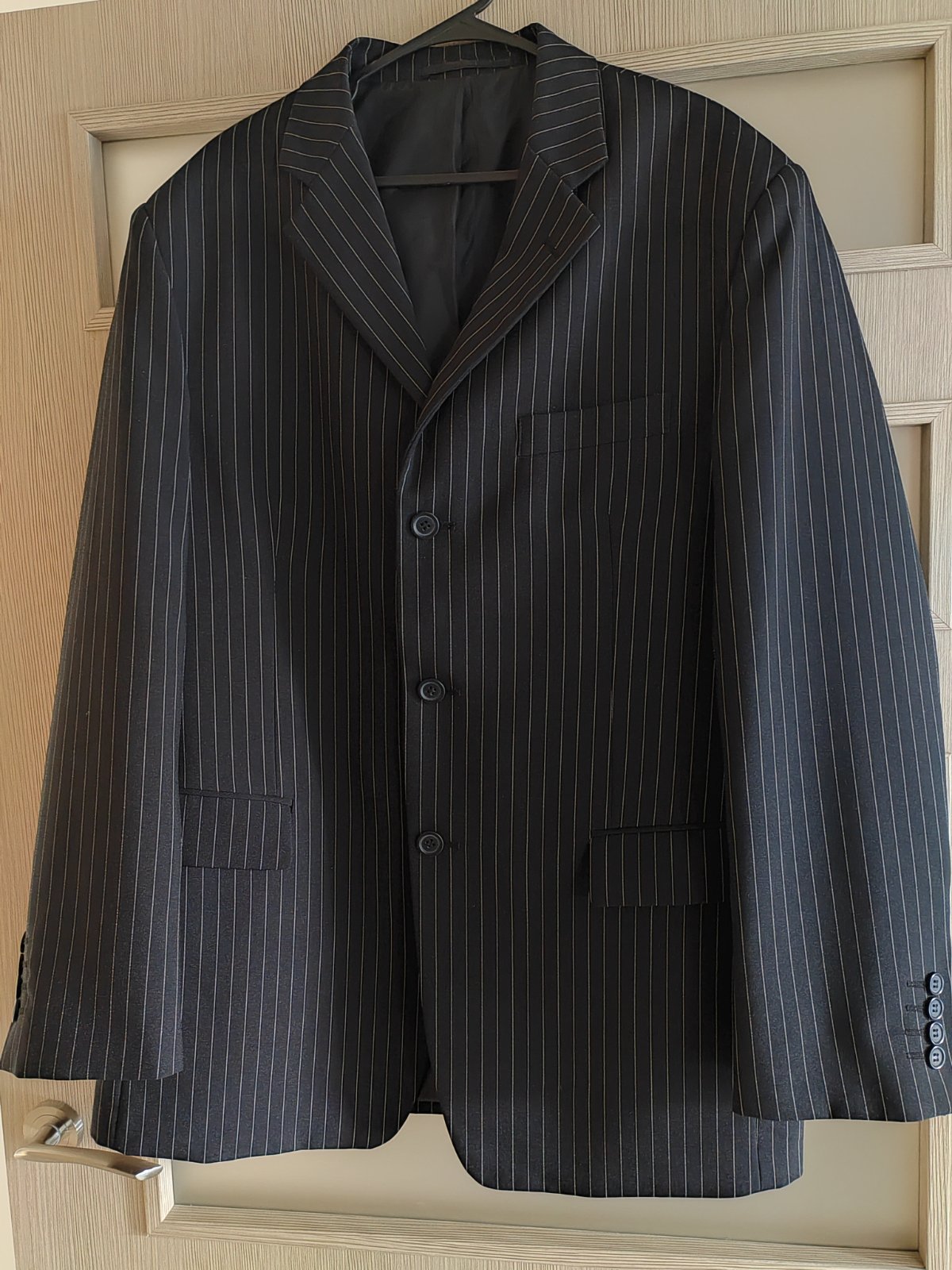 Pánsky oblek oblečený 1x na svadbe veľkosť 50 ako nový, čierny s jemným pásikom