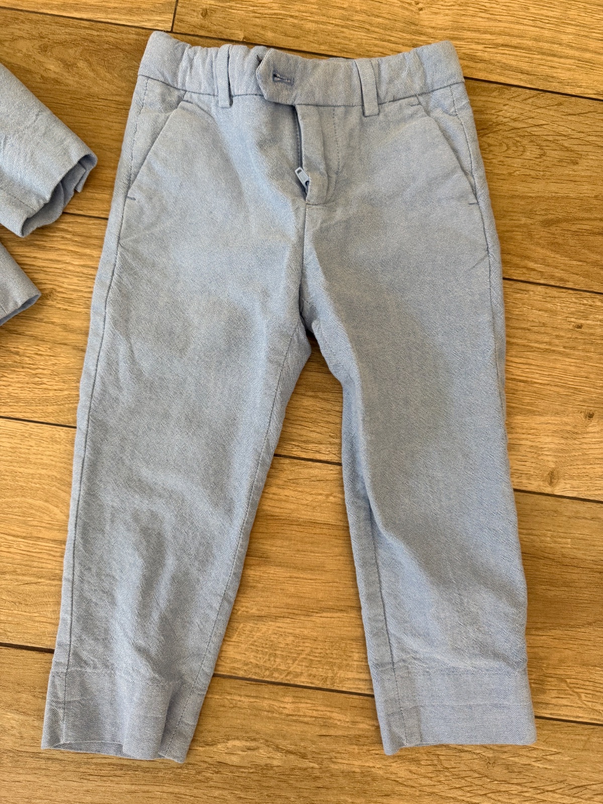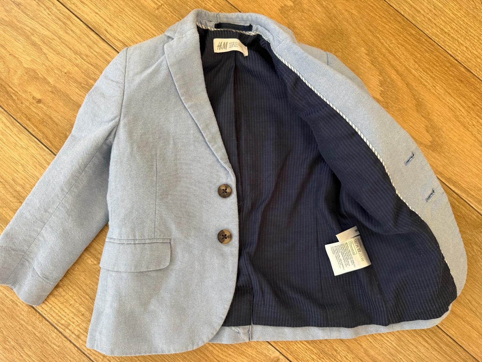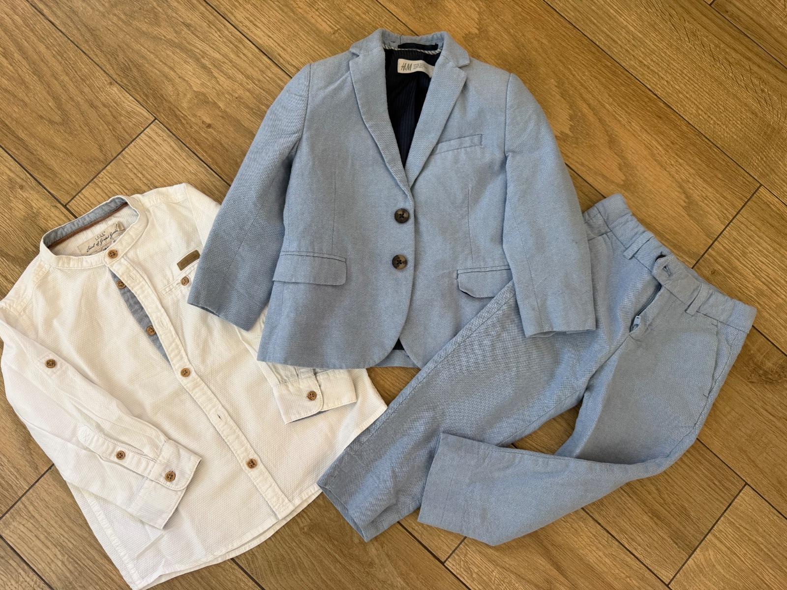 V super stave, bez akéhokoľvek poškodenia, oblečený len na chvíľku. Sako veľkosť 104, nohavice veľkosť 98( štítok som odstrihla, malého škriabal 🤷🏼♀️). Na foto je malý v takom obleku, len vo veľkosti 98