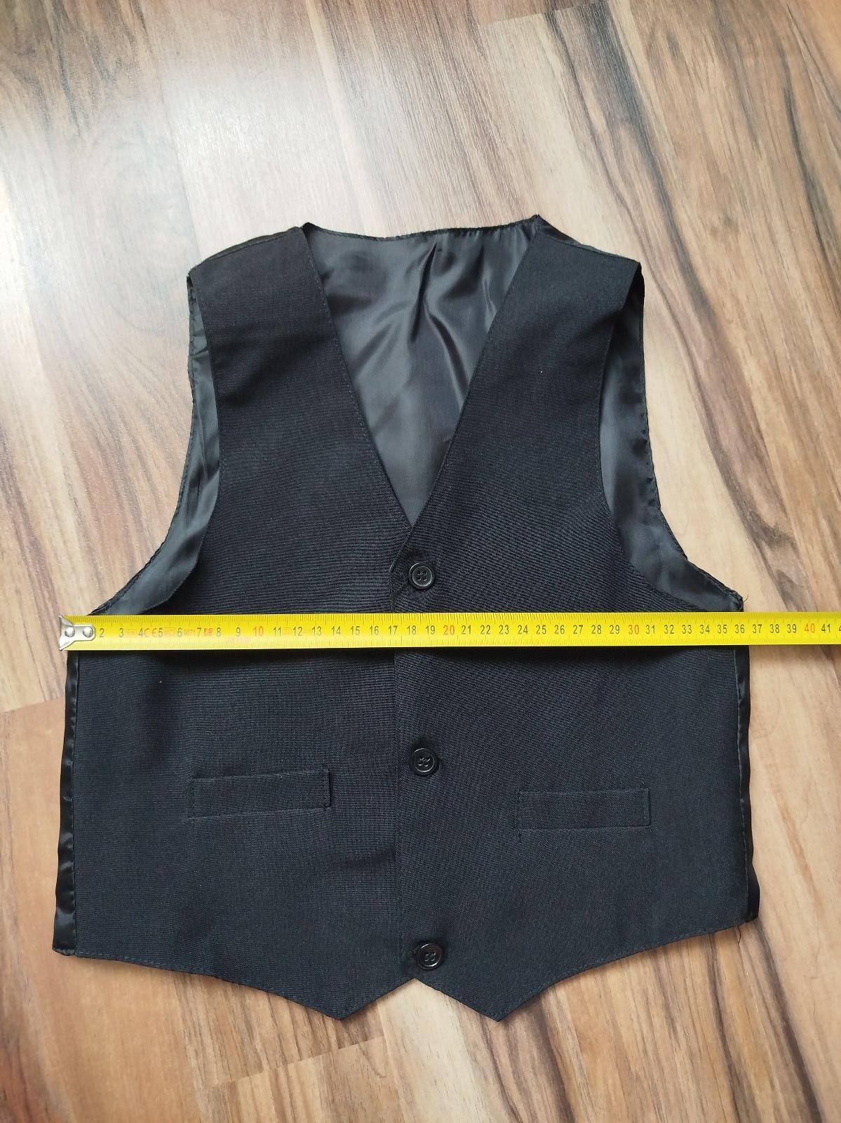Detský oblek Žakár Elegantný chlapčenský oblek obsahuje: - čierne nohavice - biela košeľa - sivá žakárová vesta - francúzska kravata 100% PES Nohavice majú v páse gumičku v zadnej časti ...