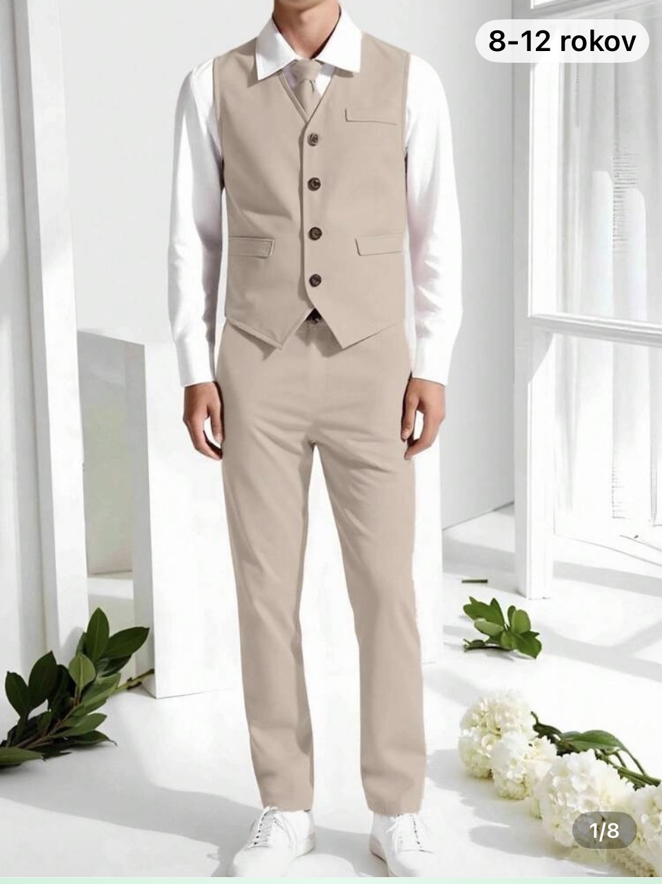 Predám krásny chlapčenský oblek (sako, vesta, nohavice). Veľkosť asi 152. Sako: šírka ramien 36cm, obvod pod pazuchami 88cm, dĺžka saka 68cm, dĺžka rukáva 54cm, vesta: šírka ramien 28cm, šírka pod...