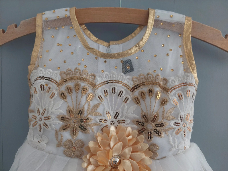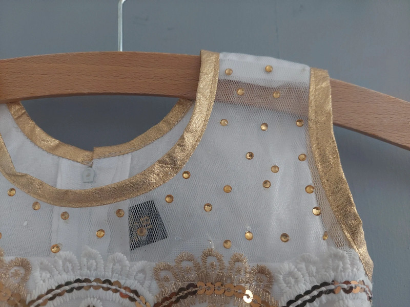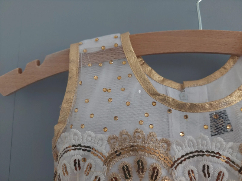 Stav: top stav, bez poškodení (na asi 3 miestach pod krkom chýba drobný zlatý kamienok, inak ako nové). Vzadu zapínanie na krytý zips. Bielo-zlatej farby.