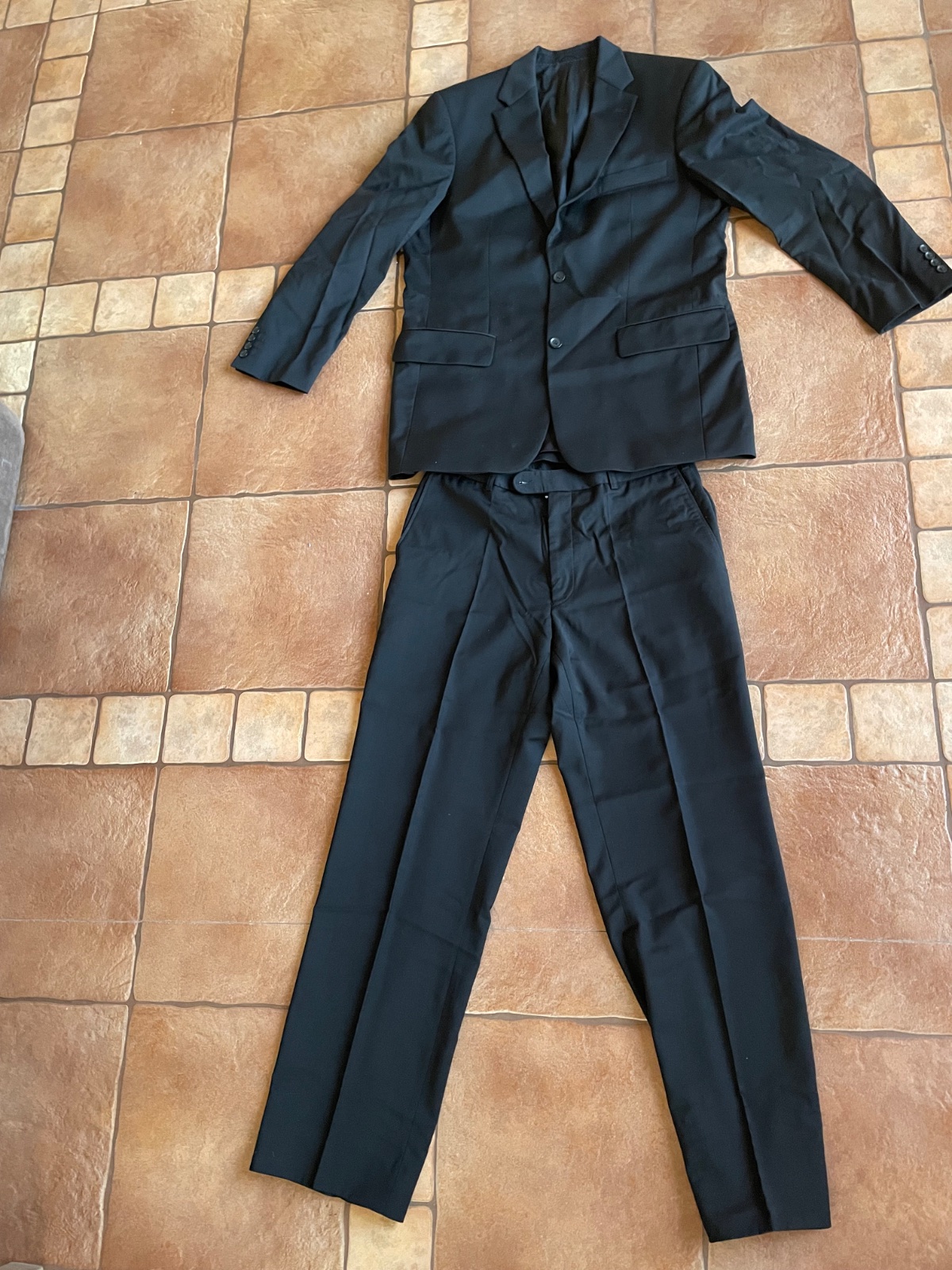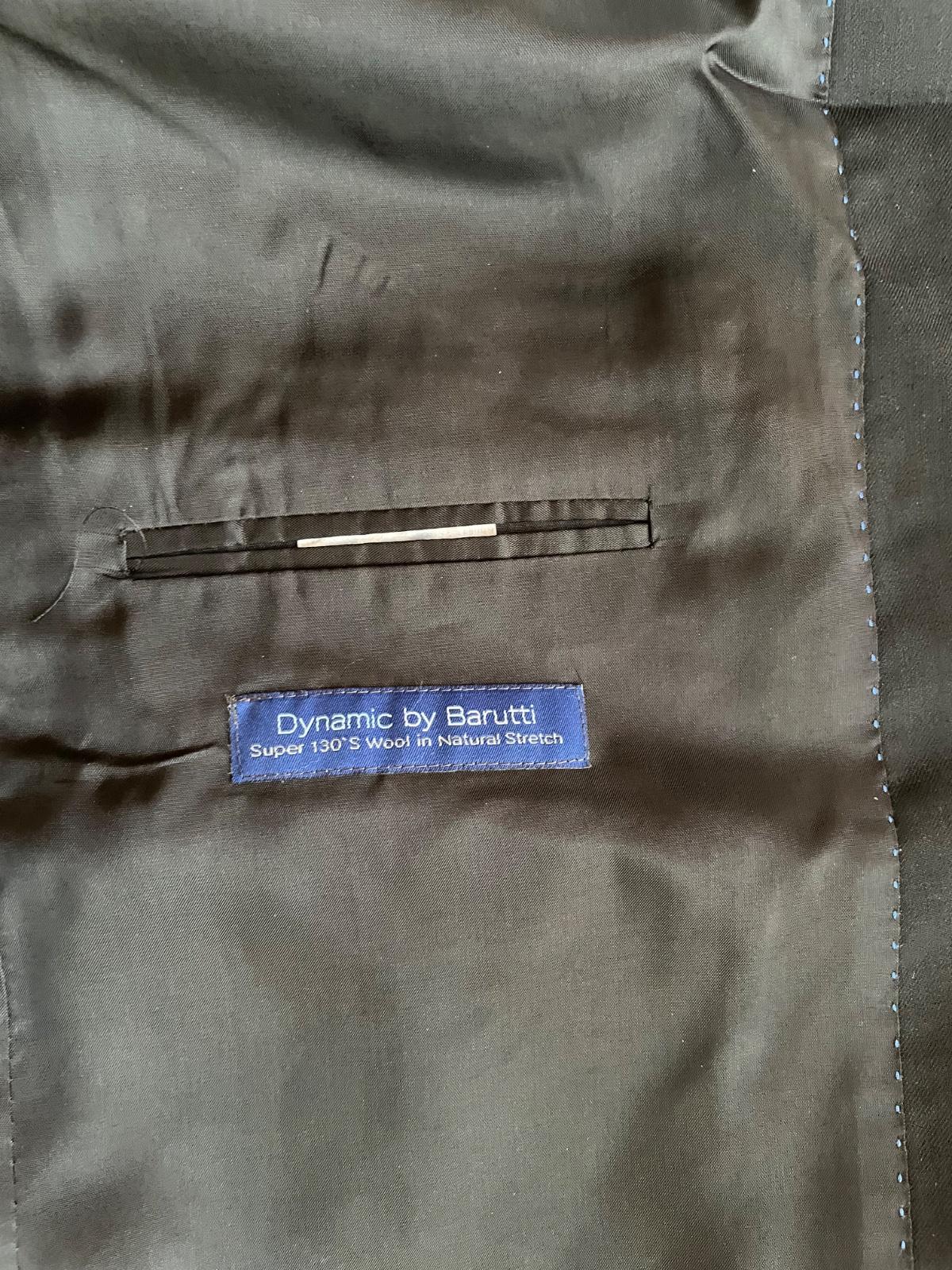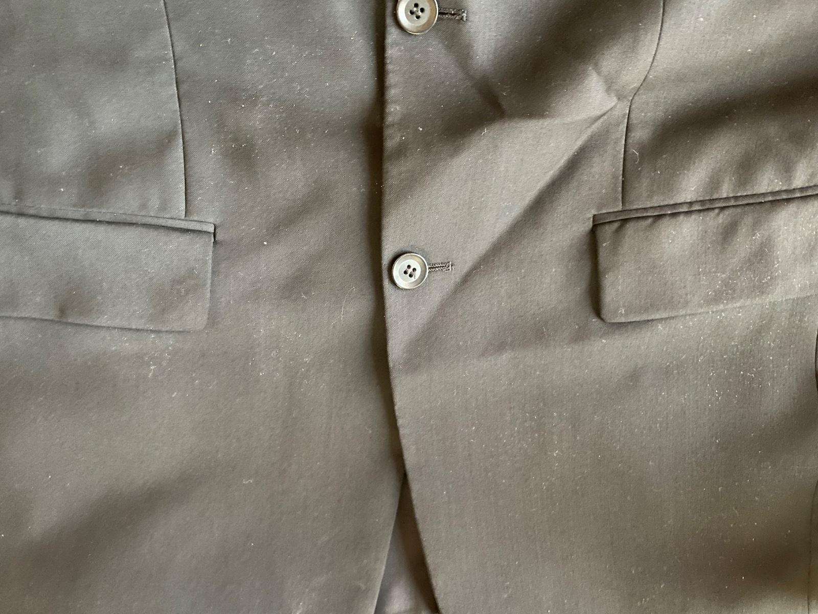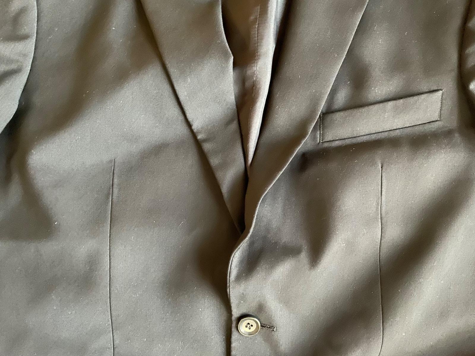 Značkový oblek. Raz oblečený. Ako nový. Top stav. Na ramenoch ma vypchávky. Treba ho vyžehliť. Nohavice dĺžka 106cm, pas 2x43cm. Sako celková dĺžka 79cm, sirka 2x57cm, rukáv 64cm, rameno 16cm. Oblek bol kupovaný v Londýne. Zdarma priložím aj obal na oblek.