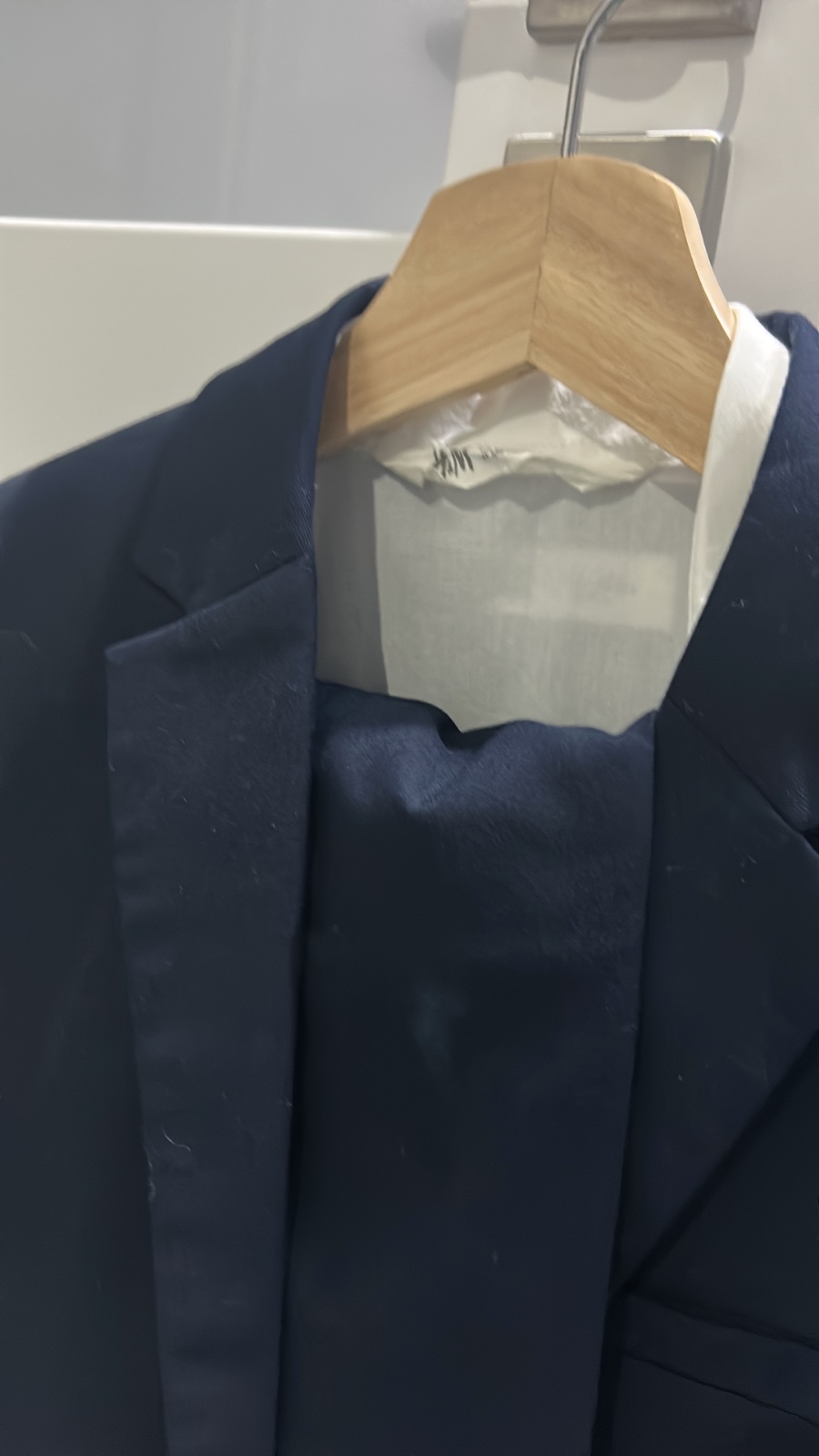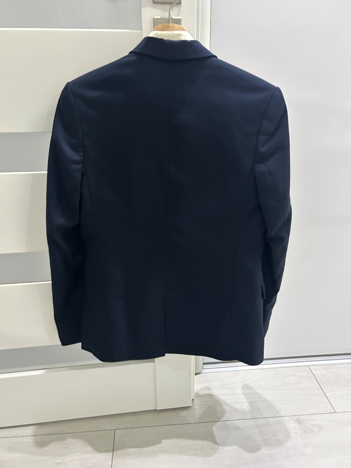Komplet oblek aj s košeľou, oblek top stav obleceny na 1.sv.prijímaní, 1x požičaných, na nohaviciach fliacik, na košeli z vnutra na golieri zažltnute. Pri noseni nevidiet.