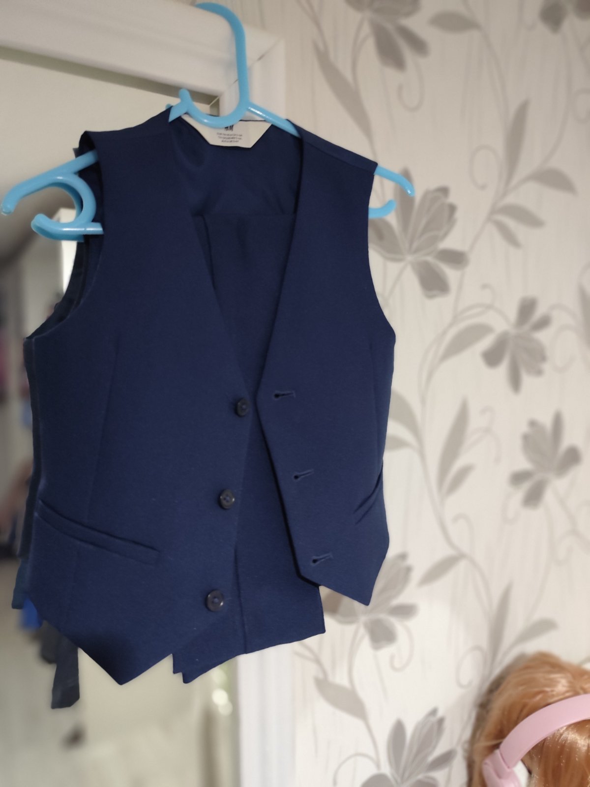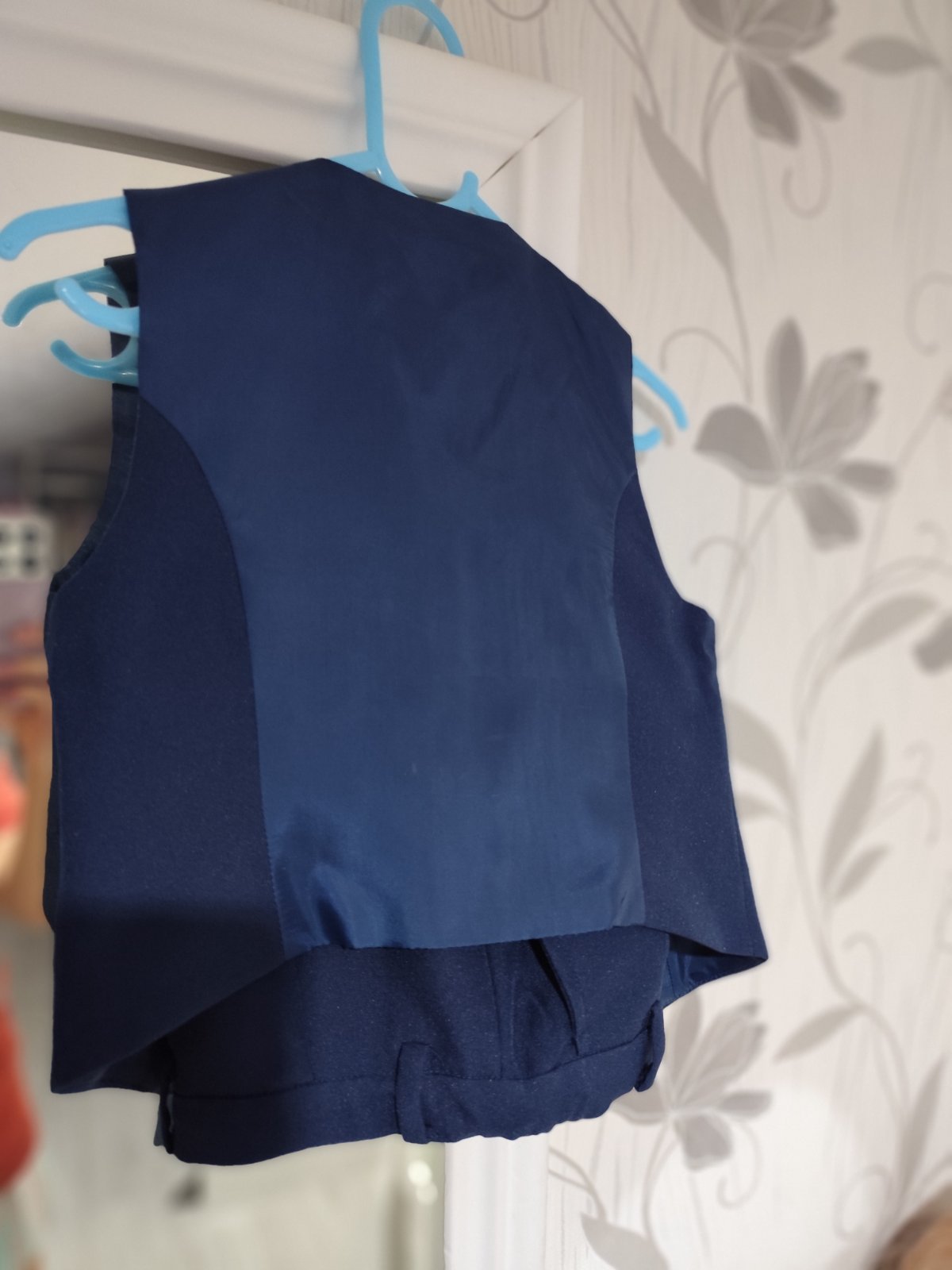 Chlapčenské elegantné nohavice a cestou v tmavomodrej farby, oblečené na jednu príležitosť bez poškodenia, ako nové, v páse guma na sťahovanie. Veľkosť 120, my sme to kupovali na 116. V top stave. Nepremeriavam.