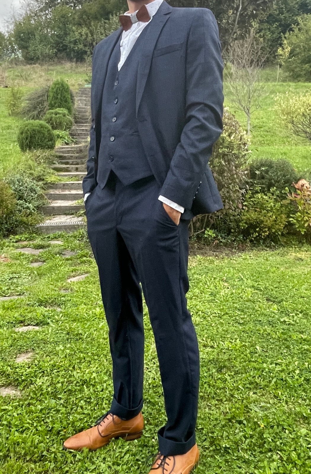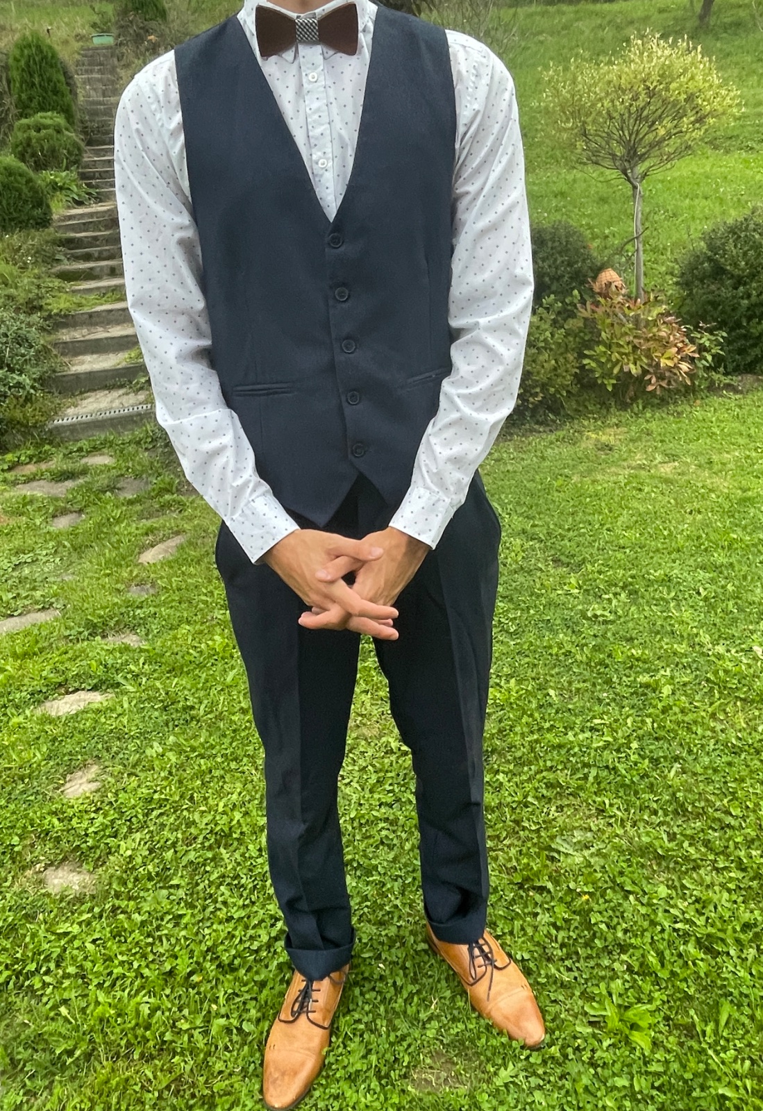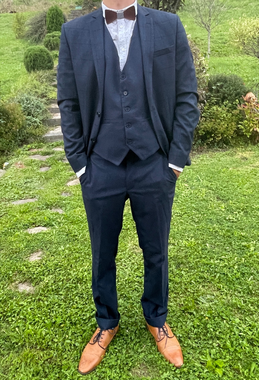 Nádherný tmavomodrý oblek, látka také mini pepito, krasny strih, nohavice, sako, vesta na chudsieho chlapca, výška cca 176-178, nohavice cca 80 cm.