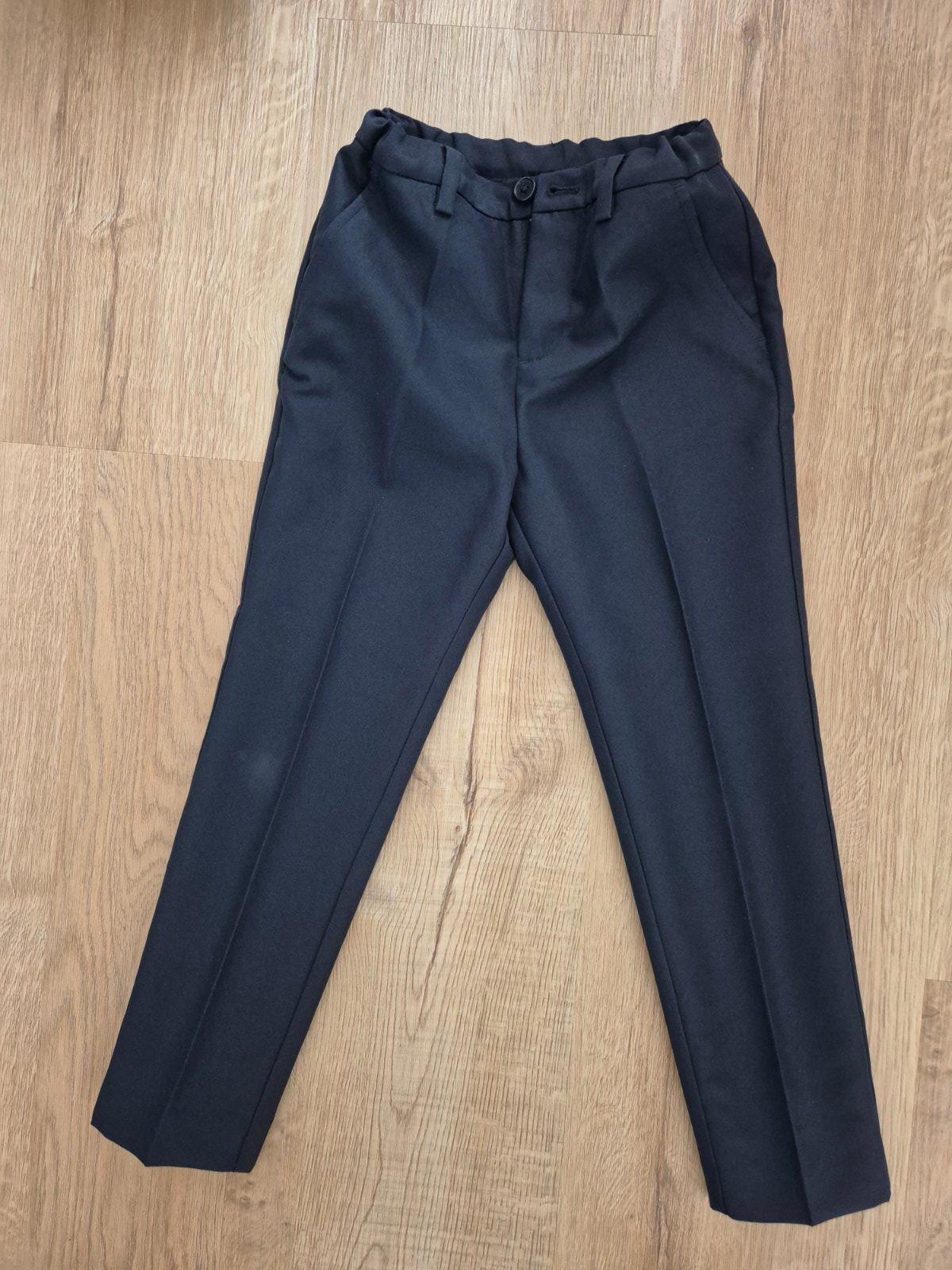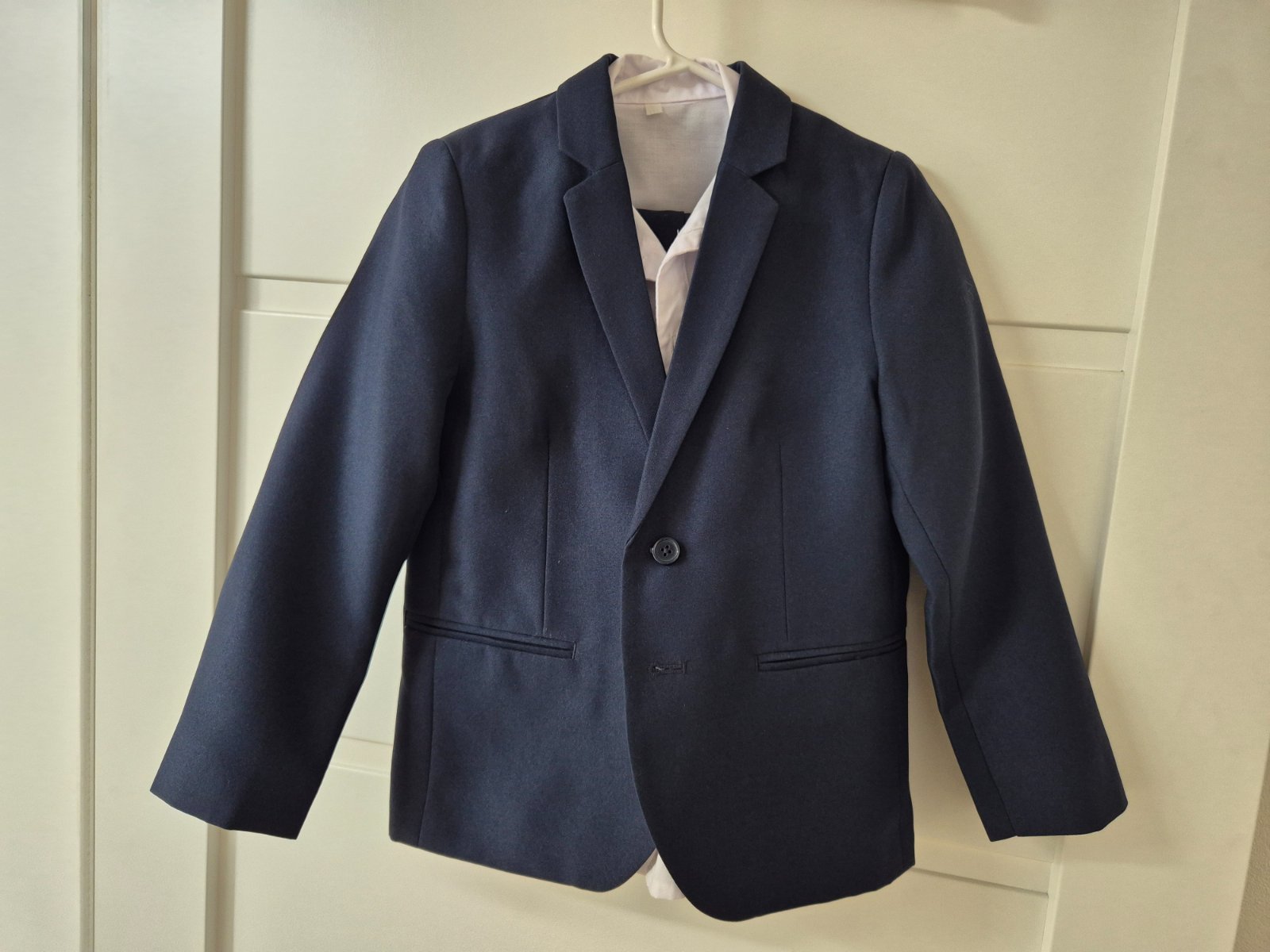 1x použitý komplet sako 116, nohavice 122 a košeľa s krátkym rukávom 116. Na nohaviciach je práve koleno trochu šuchnute. Reálne to nie je takmer ani vidno, na fotke sa to odráža od blesku-preto to tak vidno.
