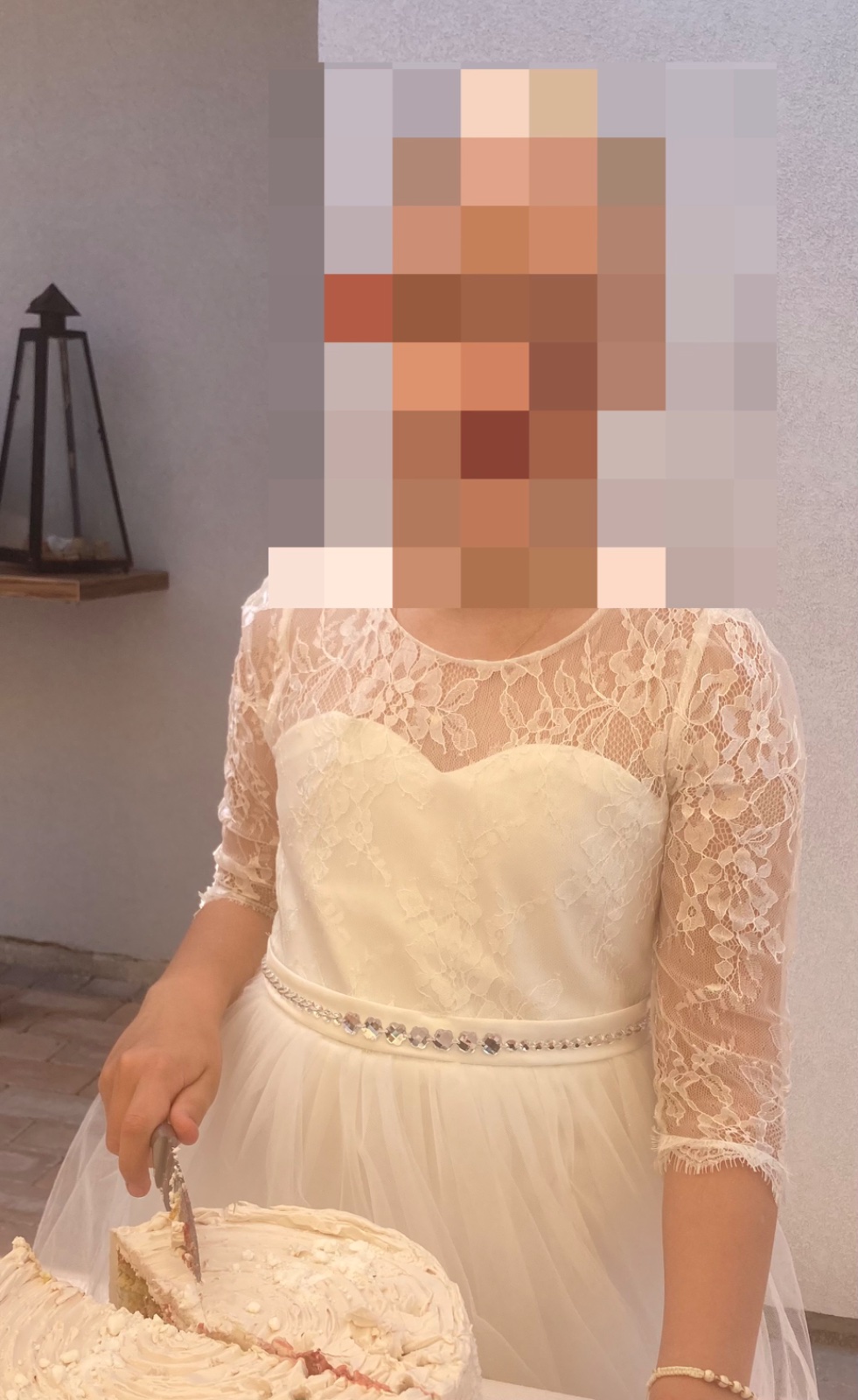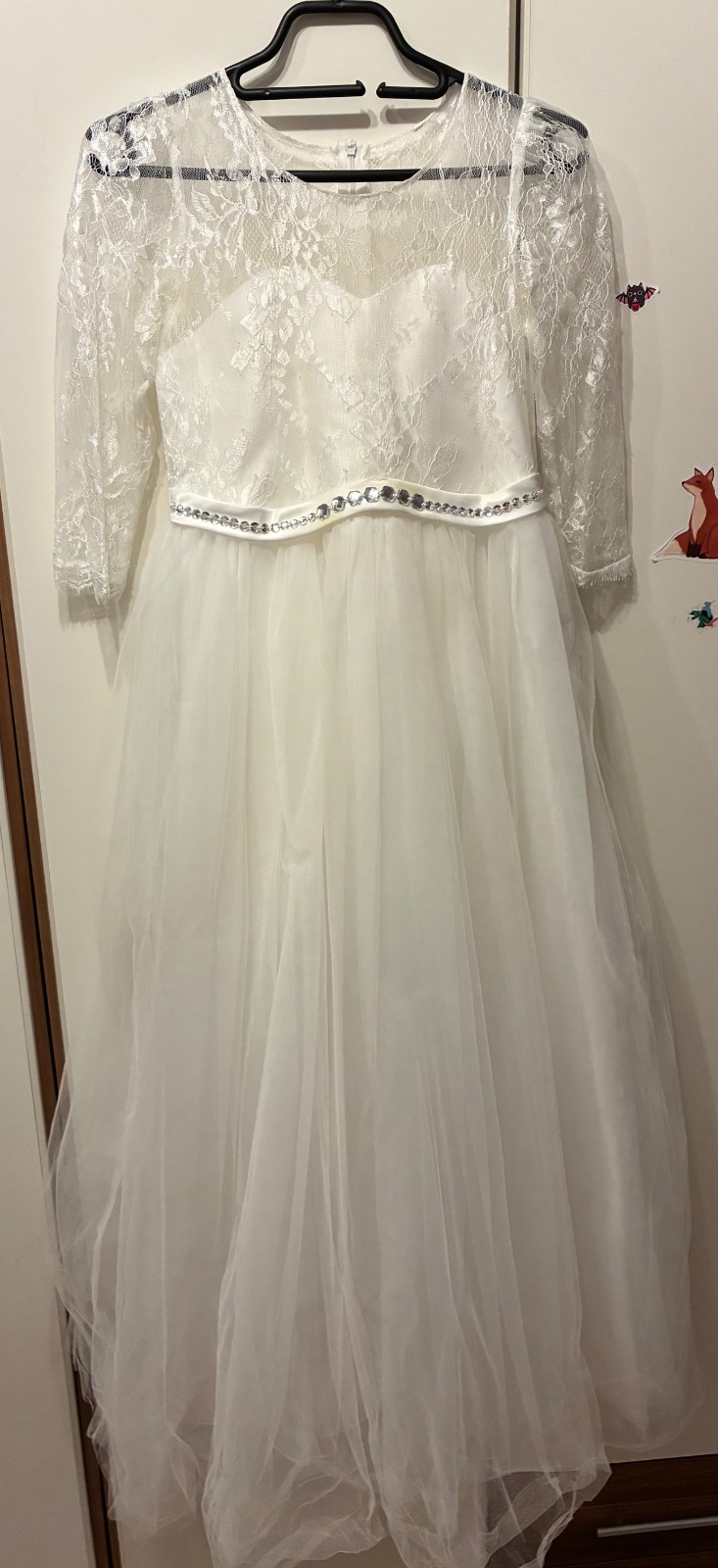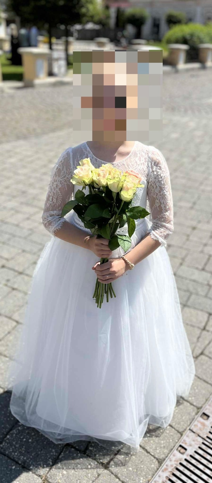Veľkosť 146/152, dĺžka šiat 120cm. Na pevnejšie dievčatko. Majú krásnu čipku, cez pás rad kamienkov. Sukňa je saténová s 3 vrstvami tylu, plus aj kruh pod sukňu. Ten sme my nevyužili. Malé chybičky krásy, natrhnutý tyl (na spodnej vrstve, ani to nie je vidno) a povolený šev (dá sa zašiť). Šaty si treba dať vyčistiť.