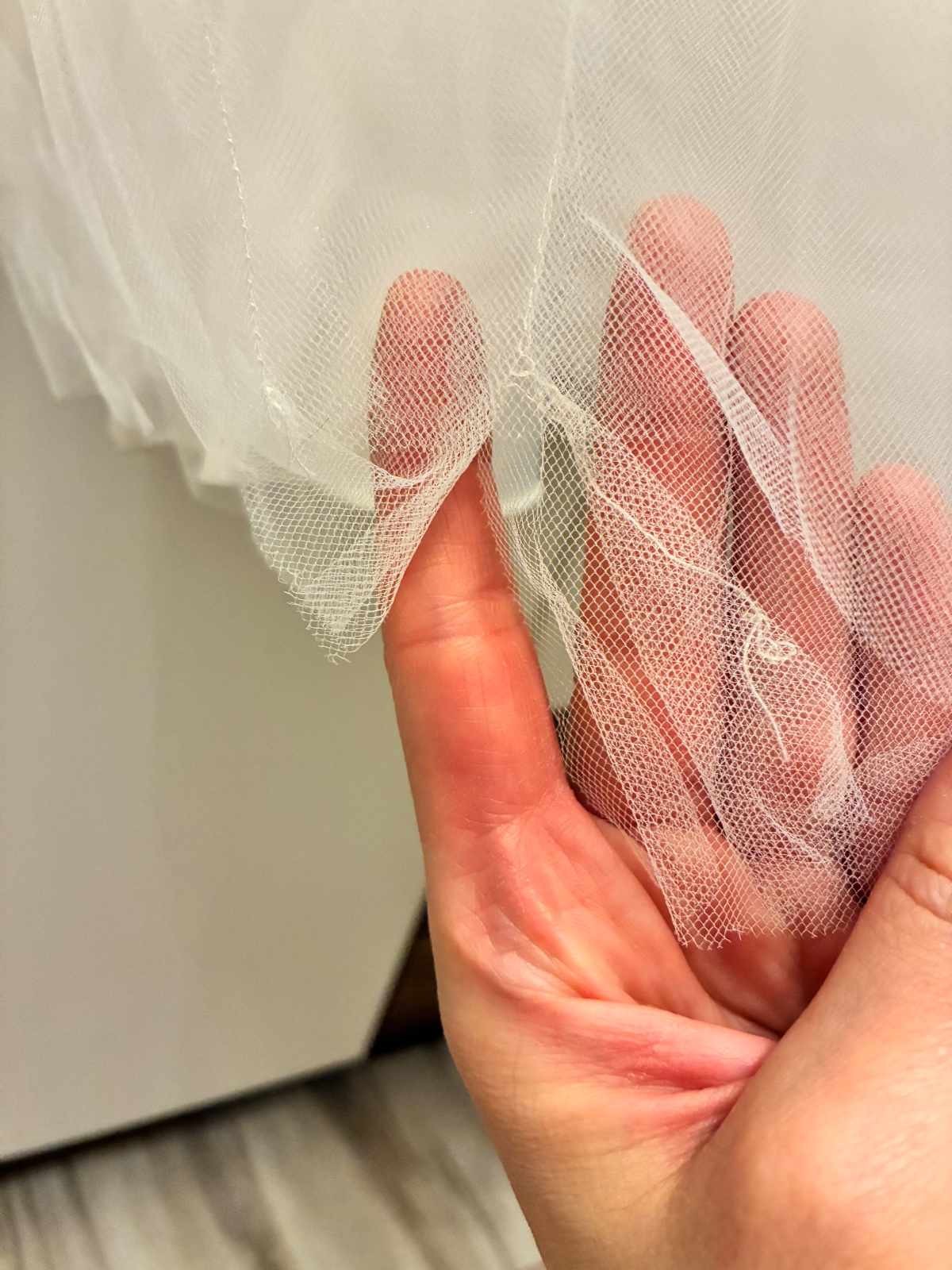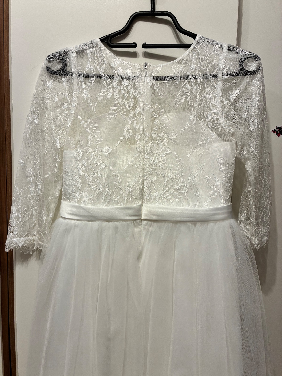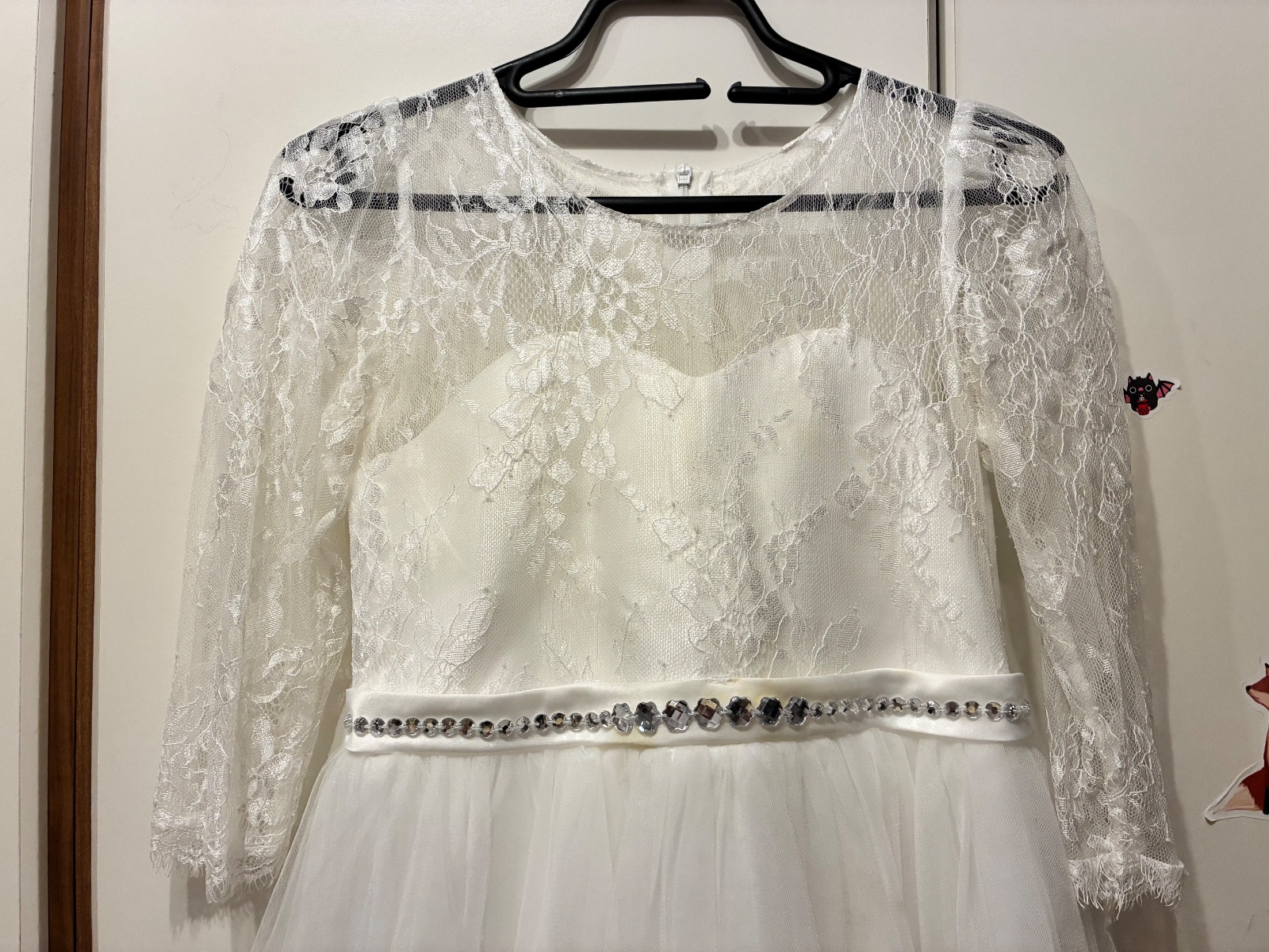 Veľkosť 146/152, dĺžka šiat 120cm. Na pevnejšie dievčatko. Majú krásnu čipku, cez pás rad kamienkov. Sukňa je saténová s 3 vrstvami tylu, plus aj kruh pod sukňu. Ten sme my nevyužili. Malé chybičky krásy, natrhnutý tyl (na spodnej vrstve, ani to nie je vidno) a povolený šev (dá sa zašiť). Šaty si treba dať vyčistiť.