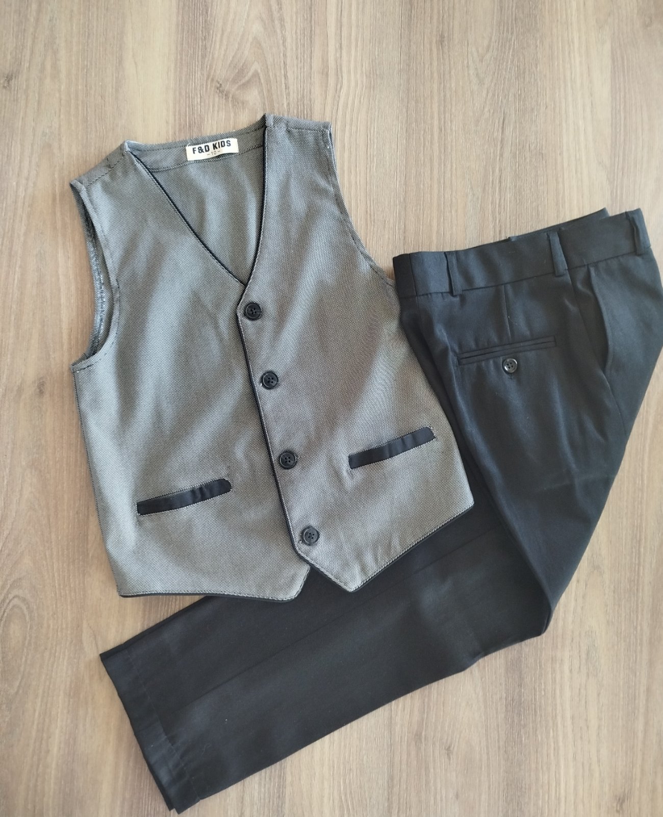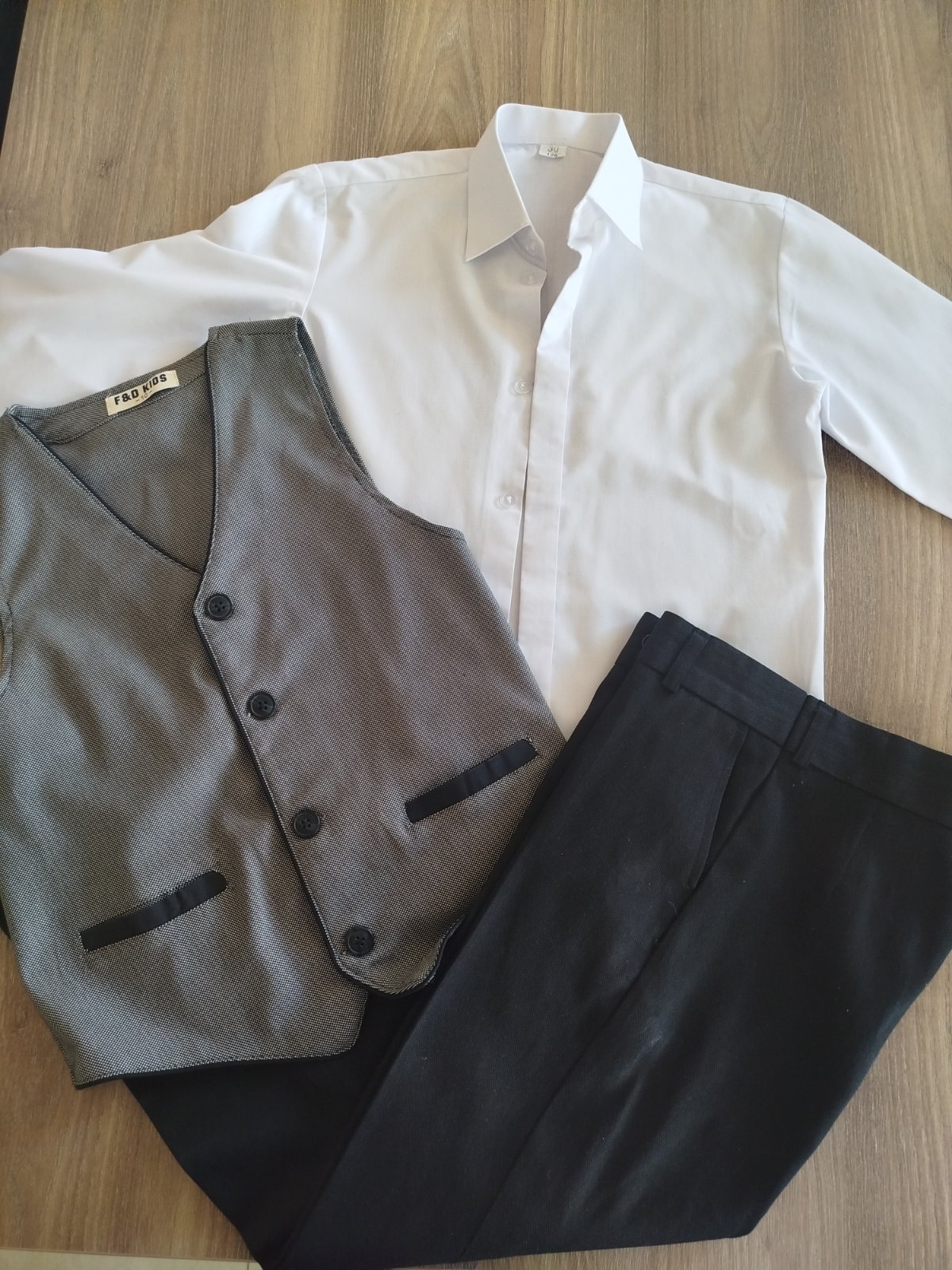 Detský oblek Žakár Elegantný chlapčenský oblek obsahuje: - čierne nohavice - biela košeľa - sivá žakárová vesta - francúzska kravata 100% PES Nohavice majú v páse gumičku v zadnej časti ...