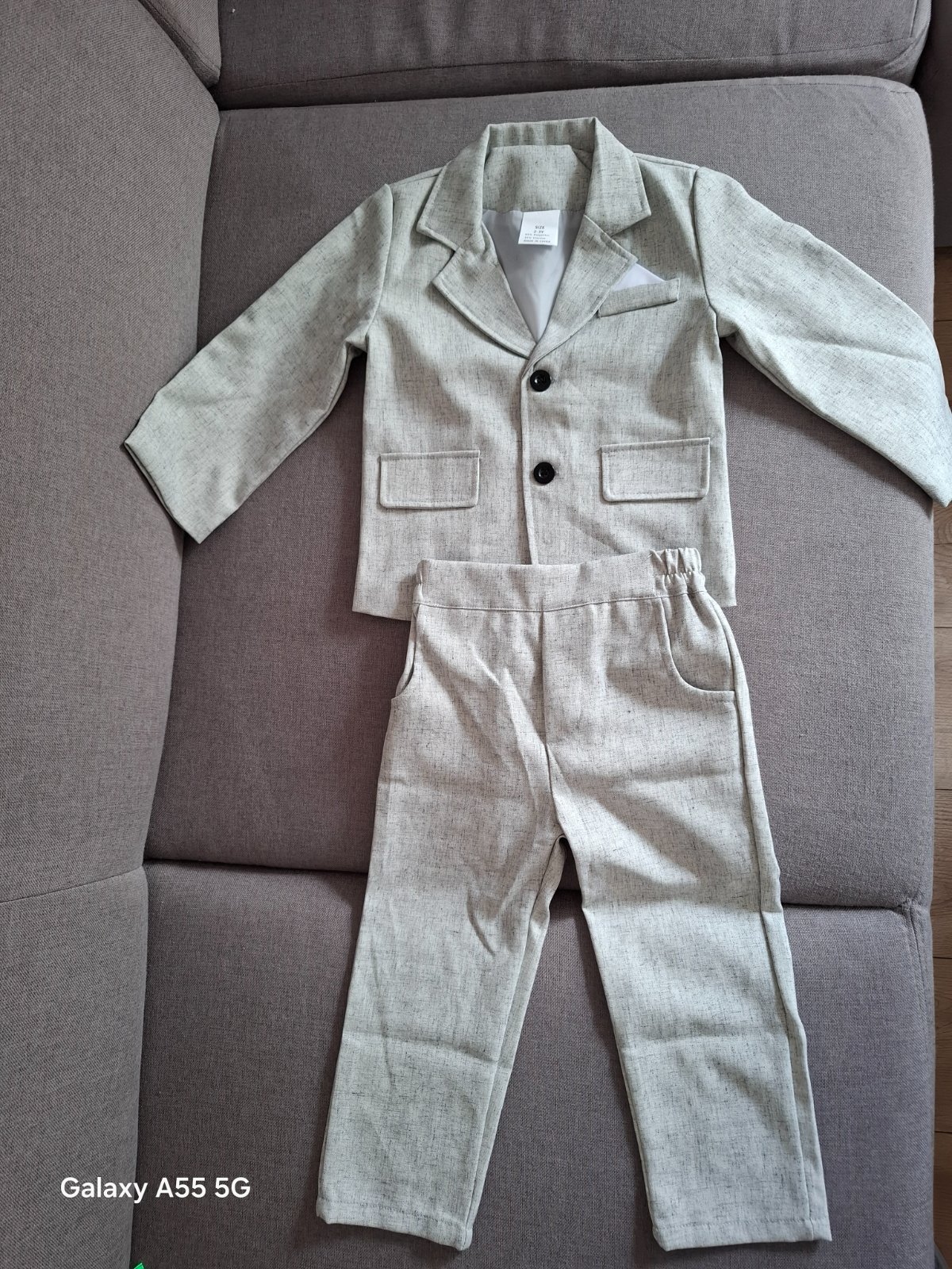 Chlapčenský oblek nový nesadla veľkosť. Veľkosť písaná na 2-3 roky závisí podľa typu postavy . Dĺžka saka 39 cm , dĺžka rukávu 34 cm , dĺžka nohavíc 54 cm , pás 23,5 cm . Odchylka max 0,5 cm