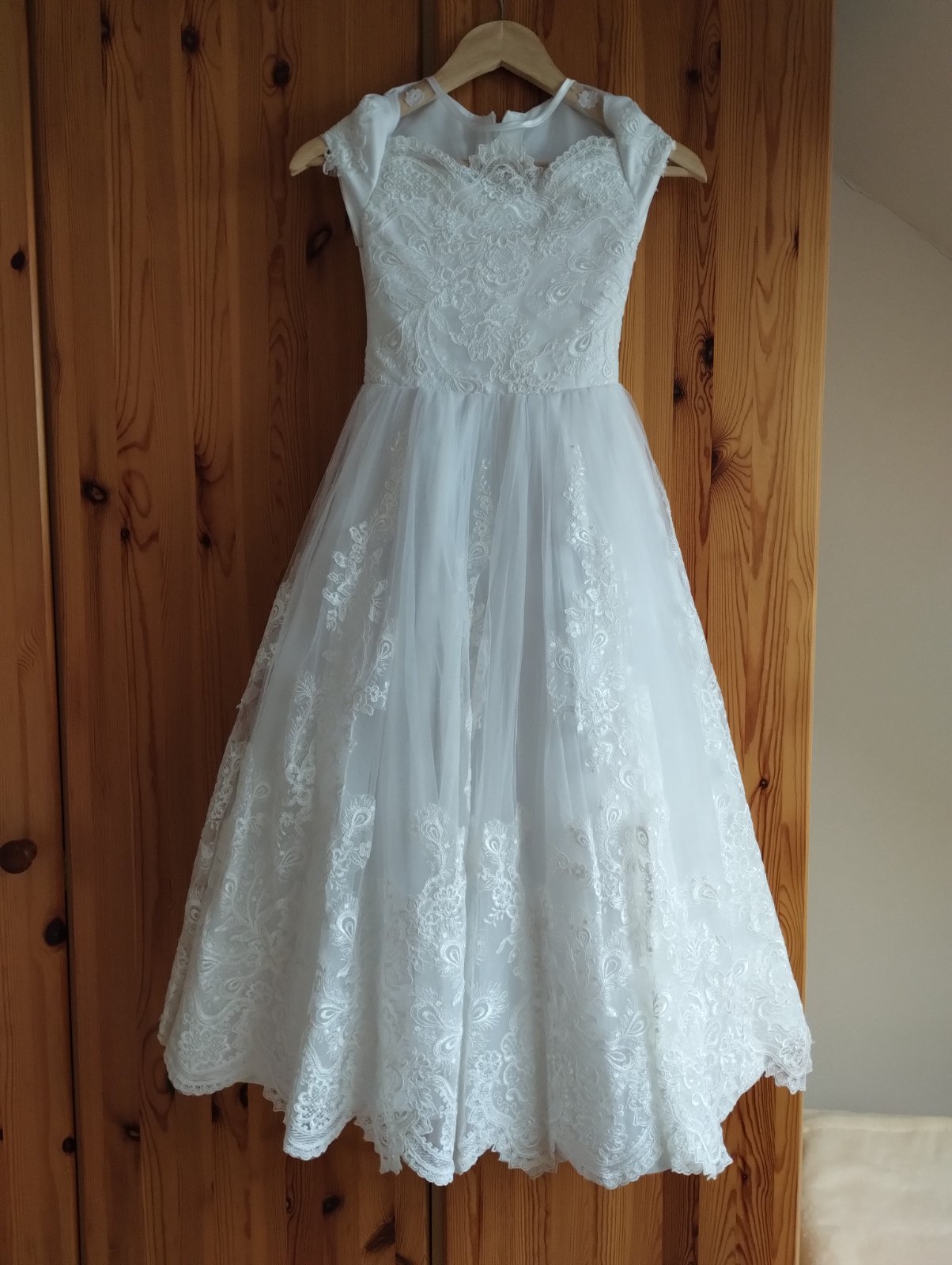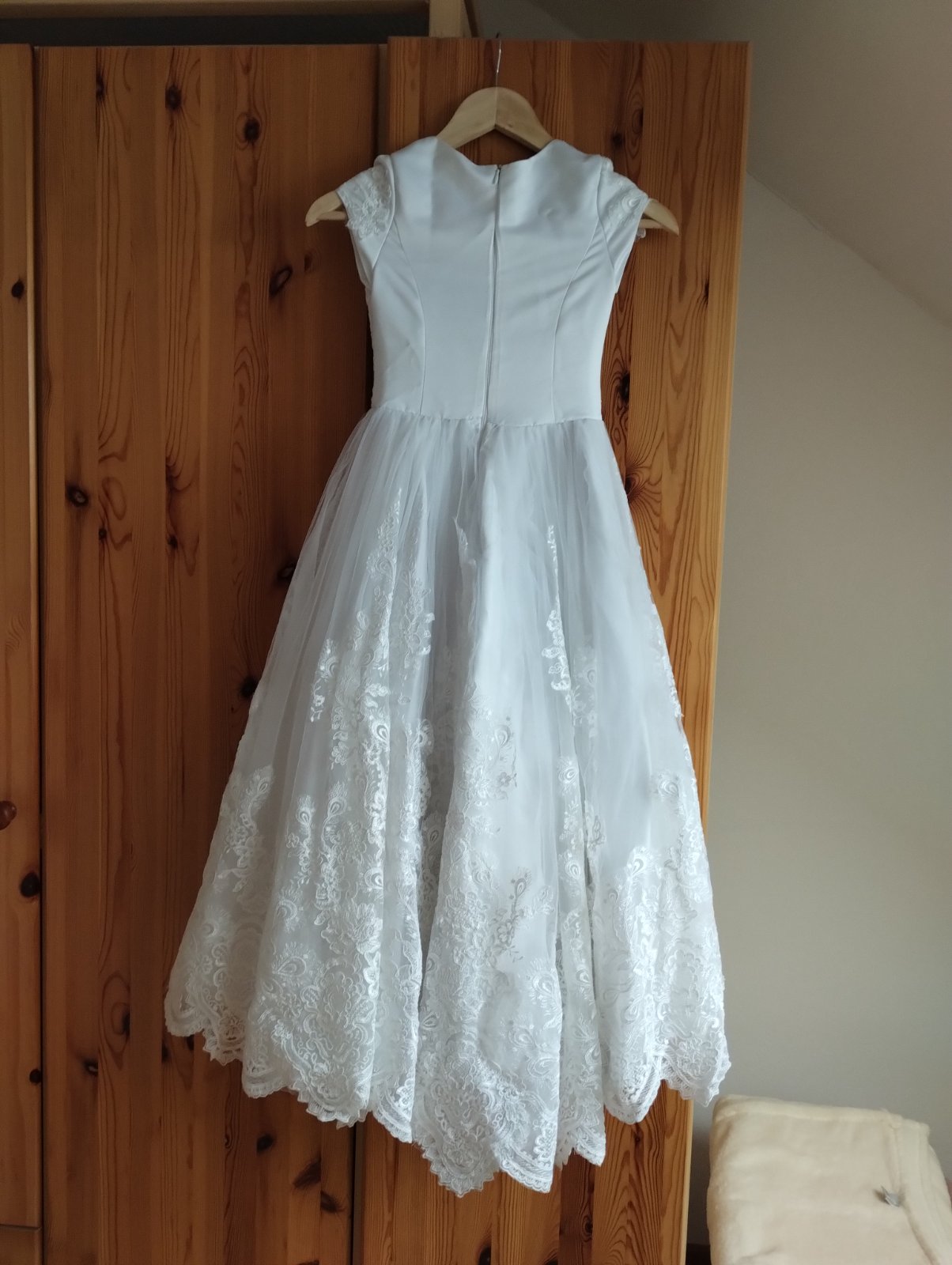 Nikdy nepoužité šaty, dcéra slúži len ako model, pôvodne bolí pre ňu. V zadu su predlzene, 4spodničky. Dĺžka predného dielu 102 cm, dĺžka zadného dielu 122 cm+čipka. Šírka pod pazuchami je 32 cm, v...