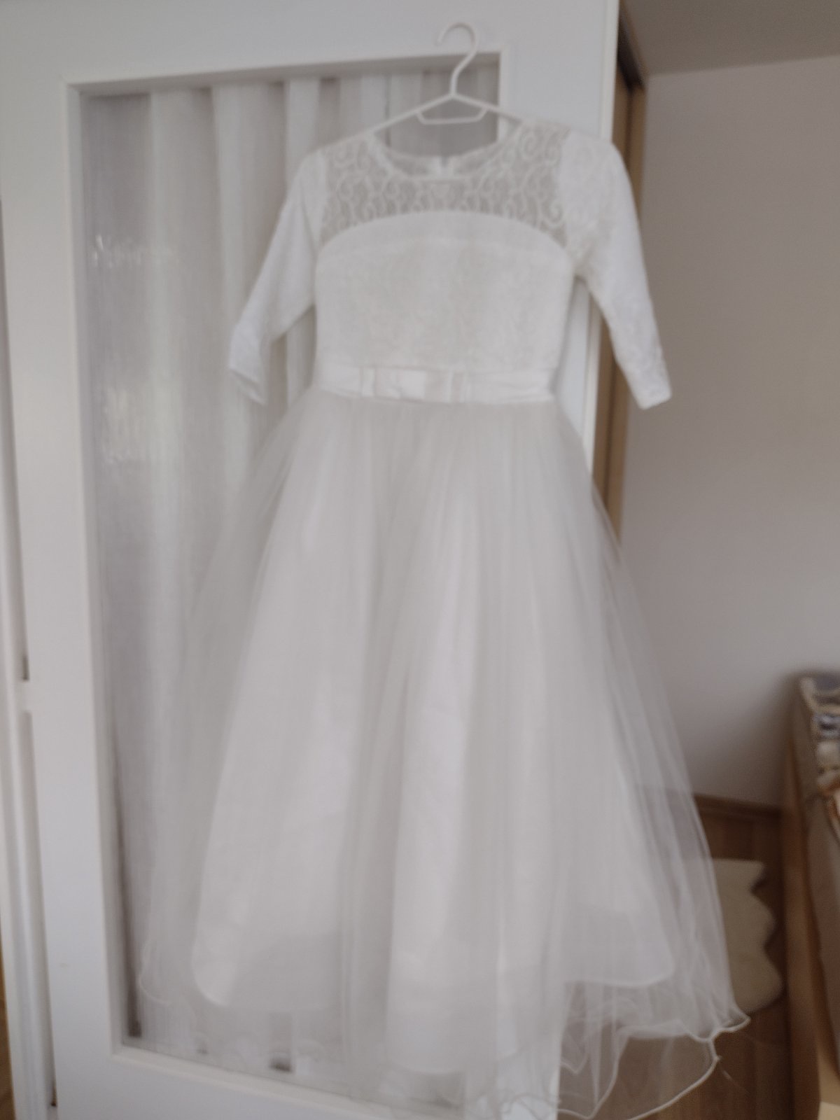 Predám šaty na prvé sväté prijímanie. Veľkosť na 146 cm, sú krásne. Šaty nie sú úplne čisto biele, su jemne kremovej farby.